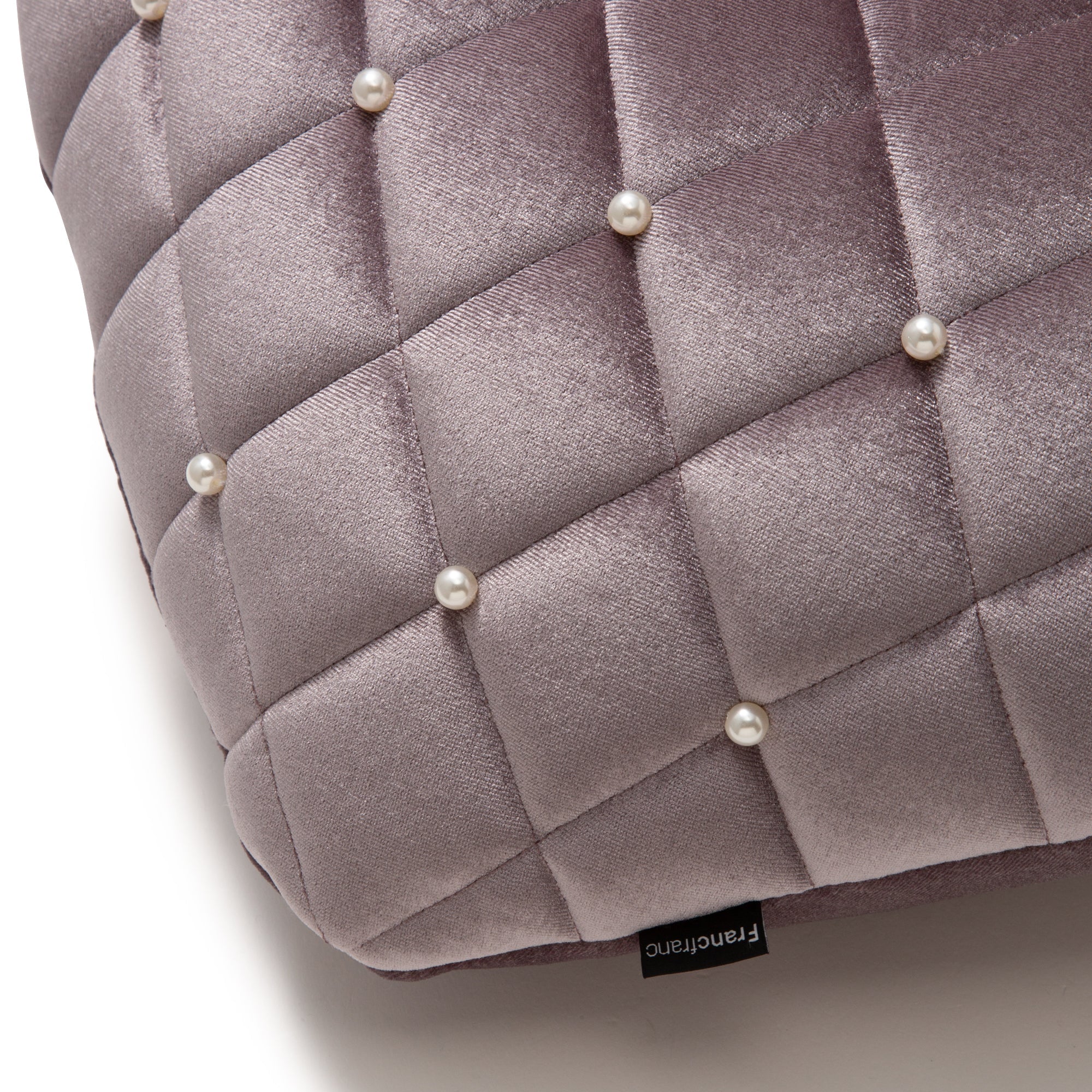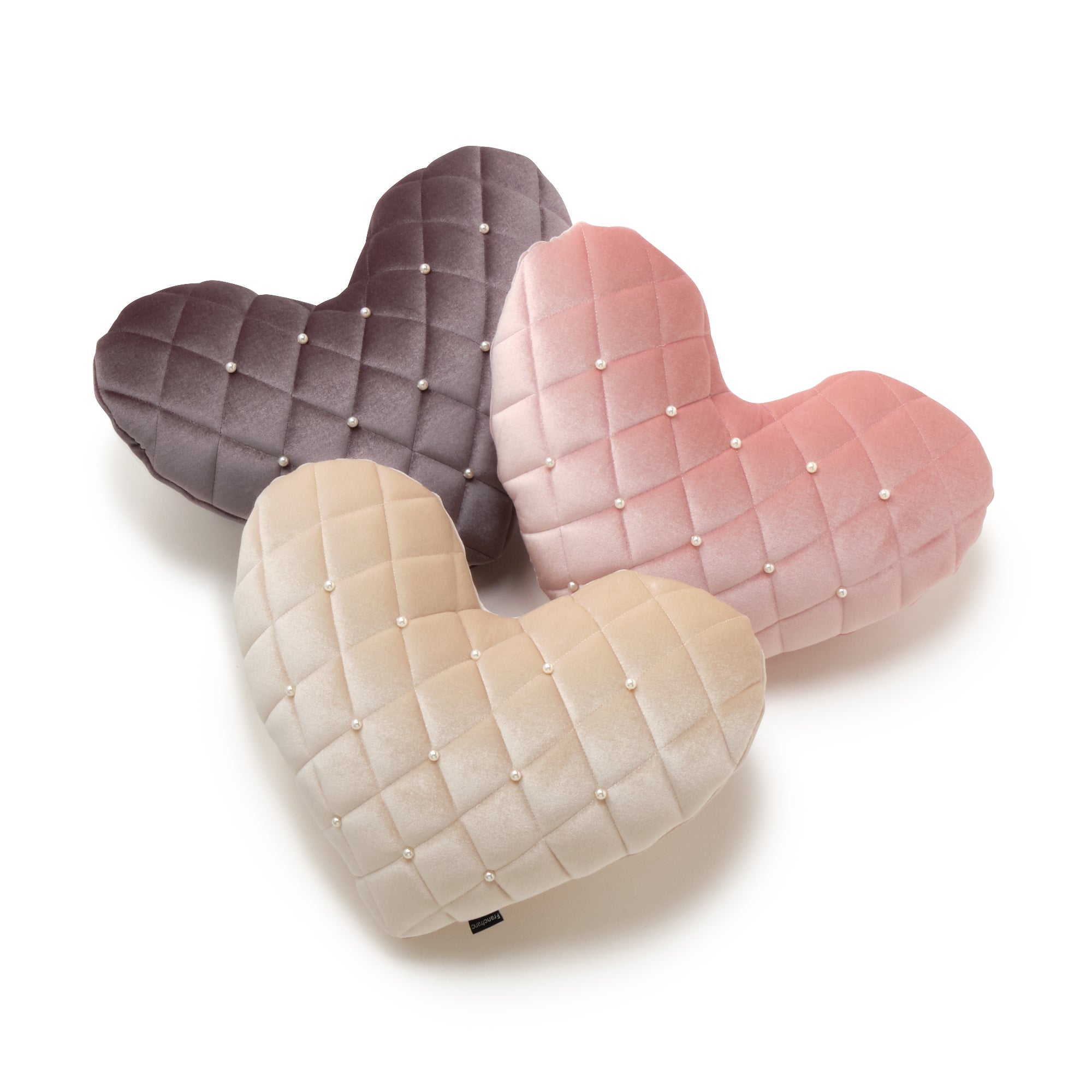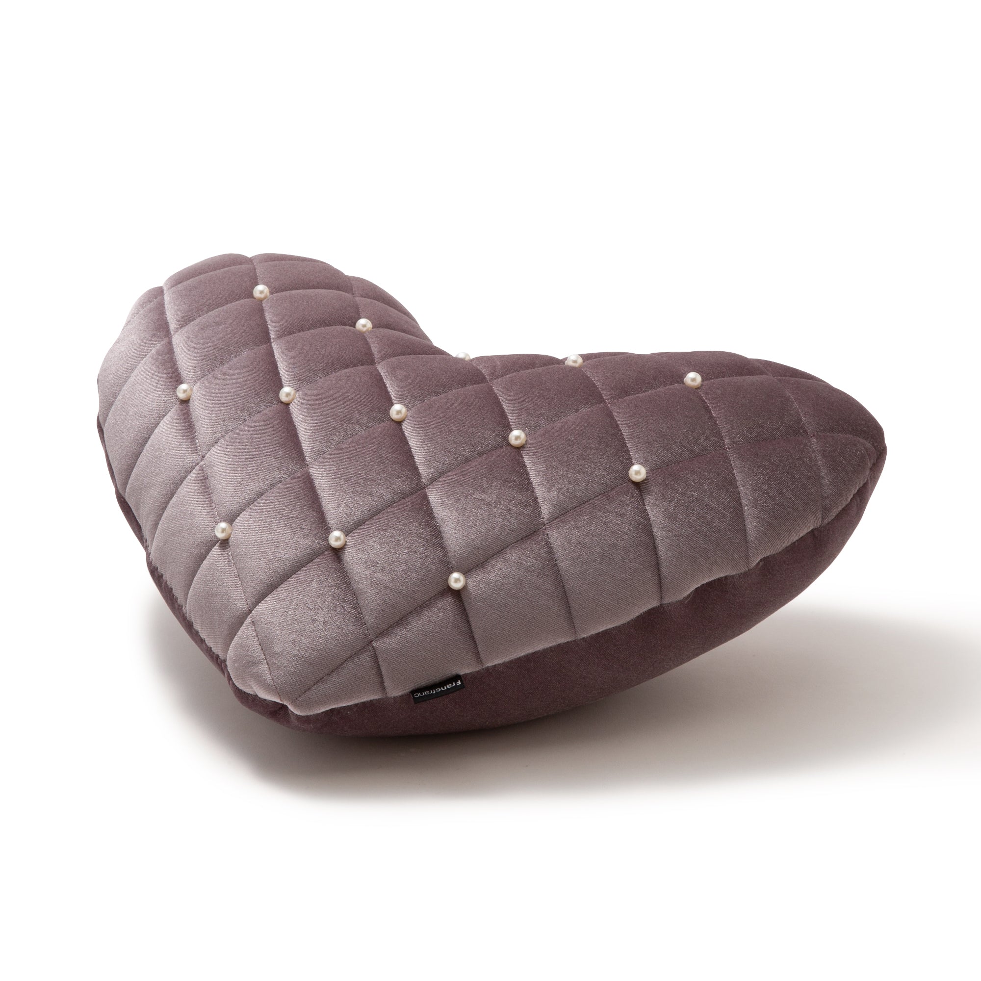 ダイヤ柄のつやつやなめらかなキルトにパールの装飾が上品な大人のハート型クッションです。光沢のあるポリエステルベルベットにパールを施すことで、ドレッシーな印象。組み合わせてたのしいベッドリネンはこちら>>>