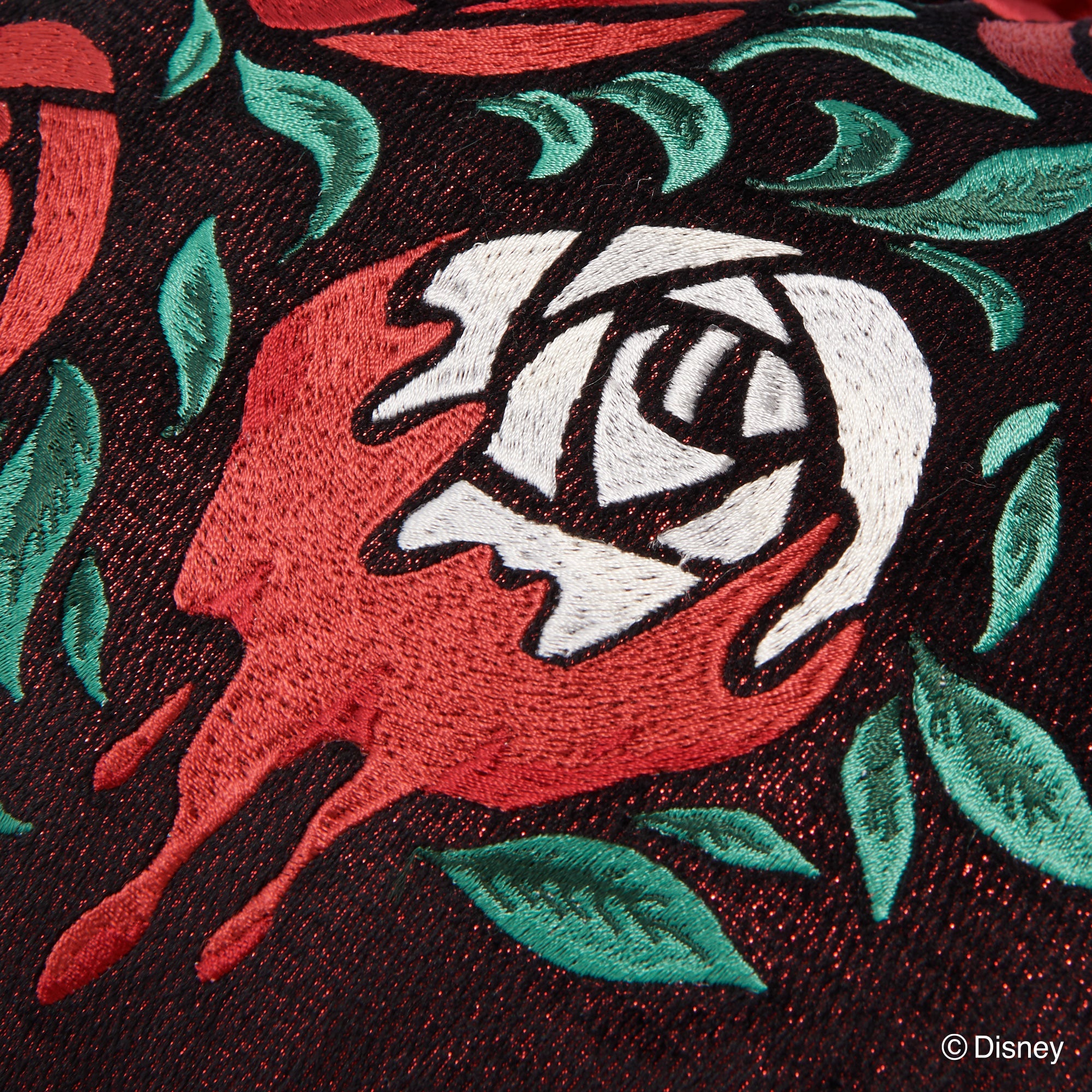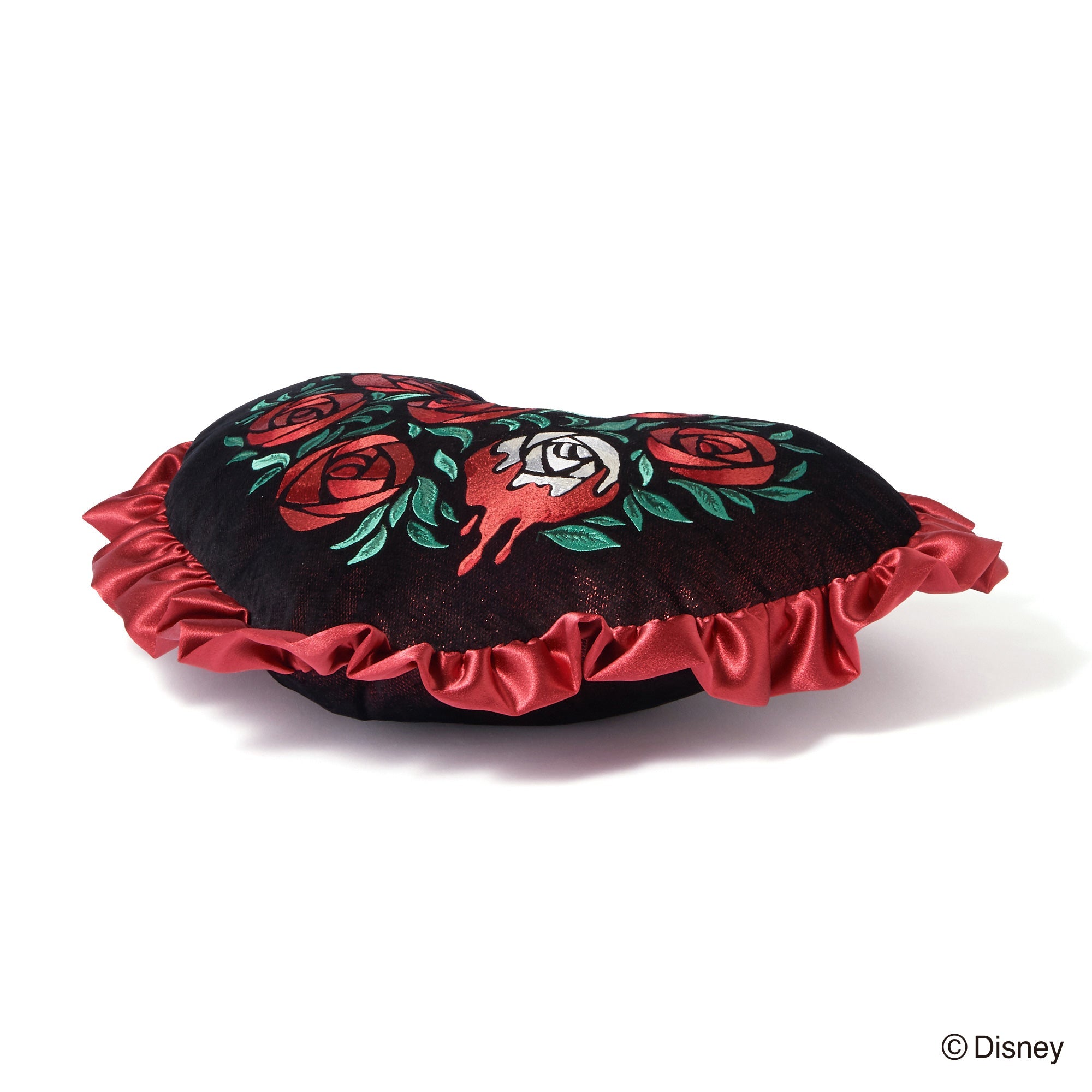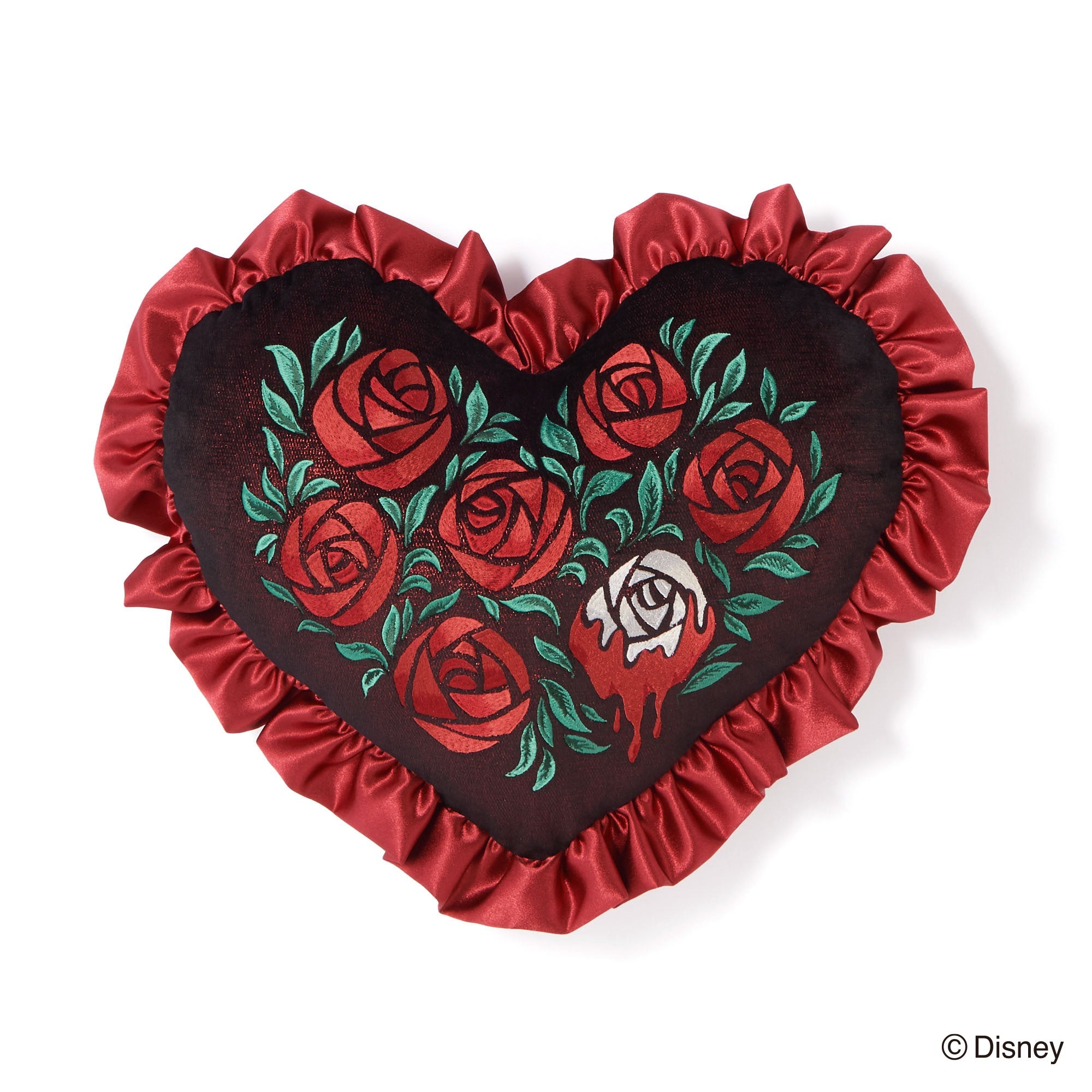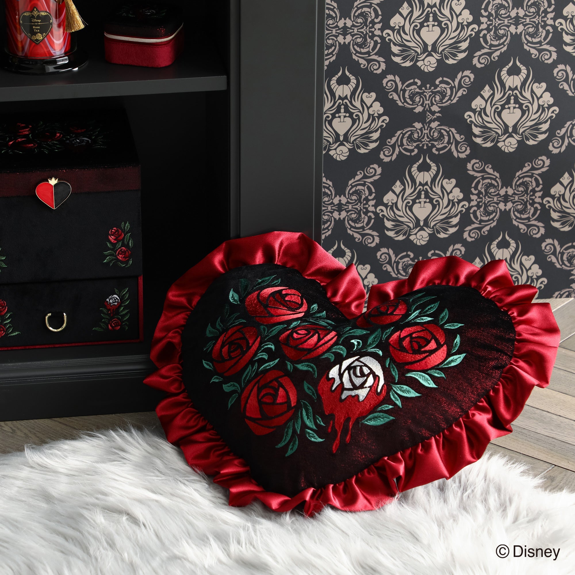 ディズニー映画『不思議の国のアリス』に登場する「ハートの女王」をイメージしたインテリアクッションです。赤く塗られた白薔薇の刺繍をたっぷりと施して、作品のもつ幻想的な雰囲気そのままにゴージャスなアイテムに仕上げました。赤いきらめきを湛えた黒ベースのラメ生地と、深紅のフリルがポイントです。シンプルなフォルムなので、ベッドやソファのアクセントとして置く場所を選ばず幅広く活躍してくれます。