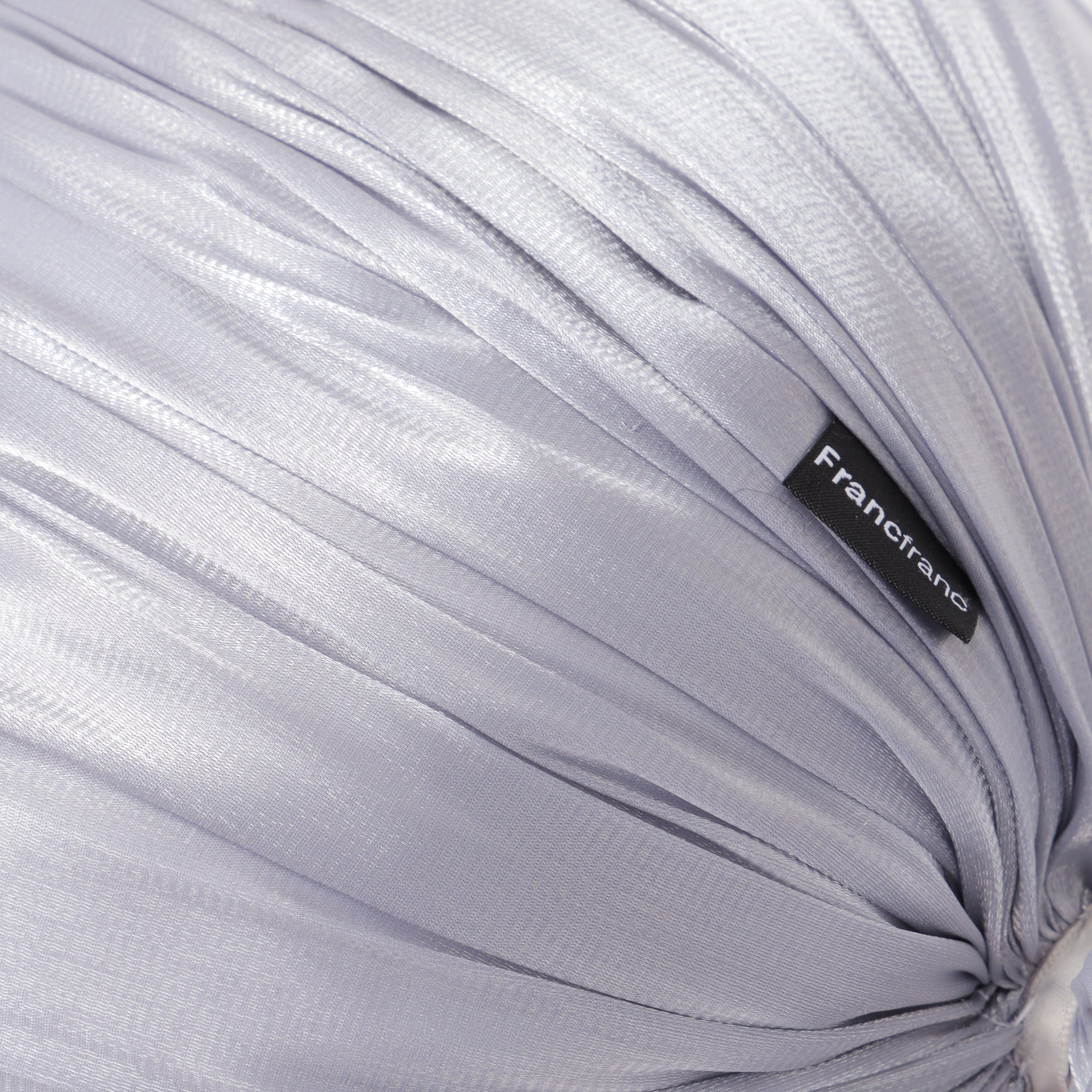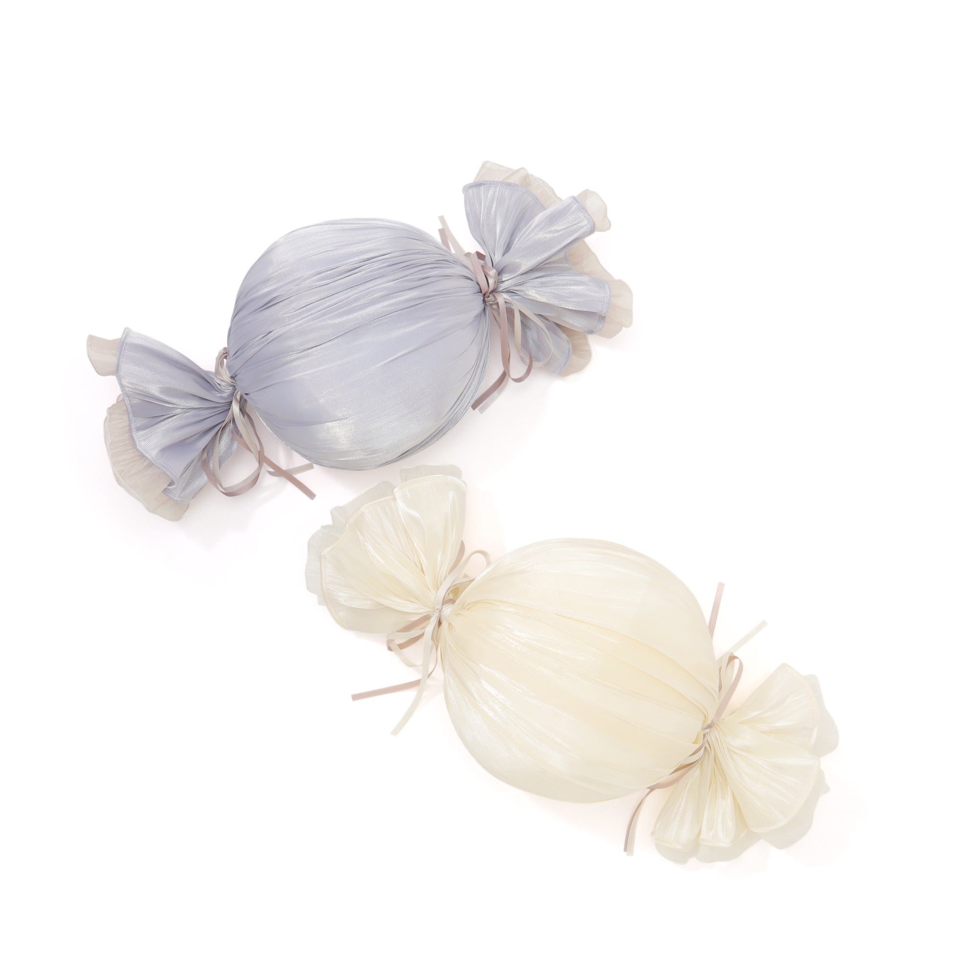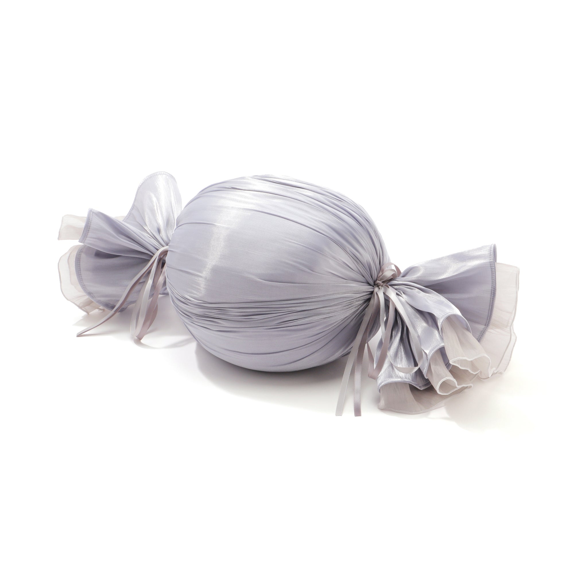 コロンとしたフォルムが愛らしいキャンディ型クッションです。艶やかな光沢のある生地を使用し、チュチュのようなたっぷりした生地感が楽しめます。華やかな形状と、ブーケのように長い2色のリボン装飾がロマンチックな印象です。