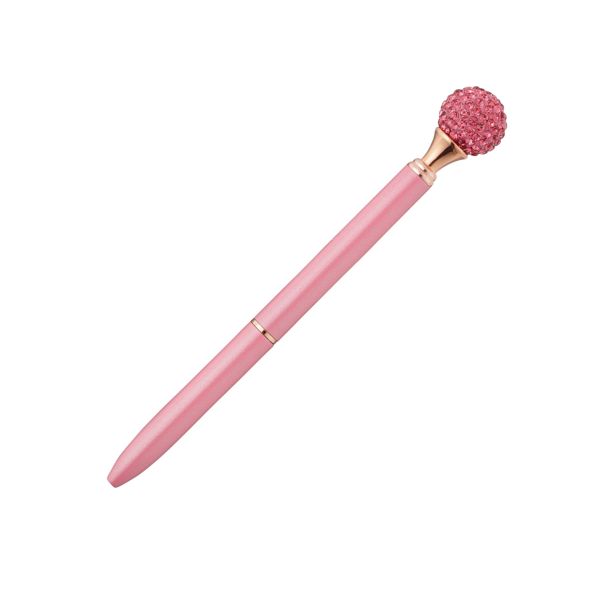 ミラーボールの付いた華やかなボールペンです。女子力全開のかわいいペンは毎日使いたくなるアイテム。 長さ14cmで一般的なボールペンと同じサイズです。下部をひねると芯が出てくるツイスト式で、簡単にペン先が出せます。ゆっくり回転させる所作は優雅で、使うだけで上品な印象をあたえます。芯を静かに出し入れできるのもツイスト式の魅力。音が気にならないのでビジネスシーンにもおすすめです。 先端にはピンクのキラキラストーンが敷き詰められ、まさにミラーボールそのもの。遠目で見てもキラキラし、光に当たるとより輝きが増します。内ポケットに入れるとちょうどミラーボールが見えるのもポイント。持っているだけで気分が上がり、仕事や勉強が楽しくなります。 同シリーズは、ピンクのほかにホワイトもあります。ホワイトのミラーボールにはクリアカラーが使われていて、ピンクとはまた違った雰囲気です。 色鮮やかなボールペンは、ウェディングのシーンや新生活のギフトにもおすすめです。 ウェディングではチャペルや披露宴などのエレガントな会場と相性抜群。新生活ではキラキラストーンがこれからの未来を照らしてくれているよう。ミラーボールペンを使って心おどる日々を送りましょう。