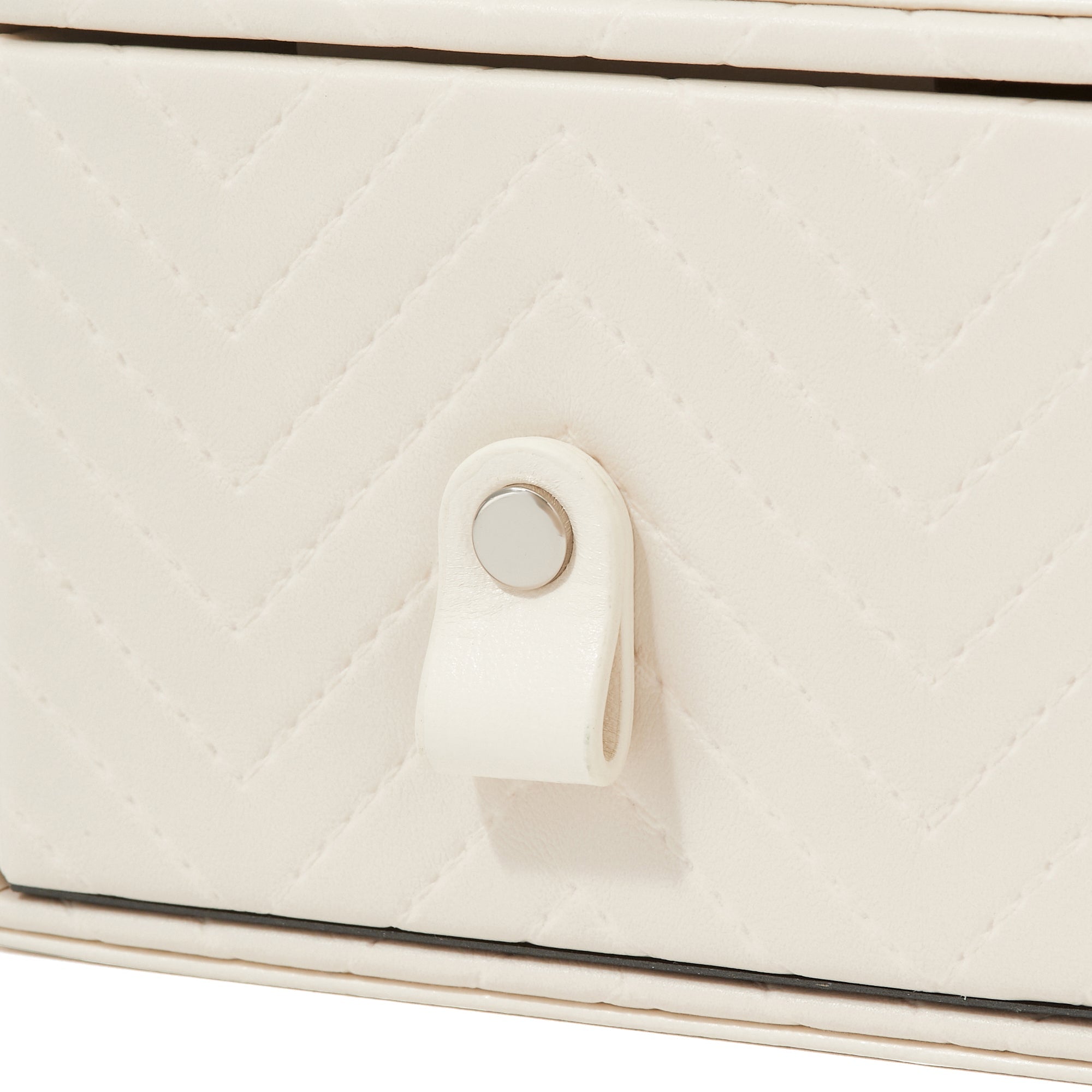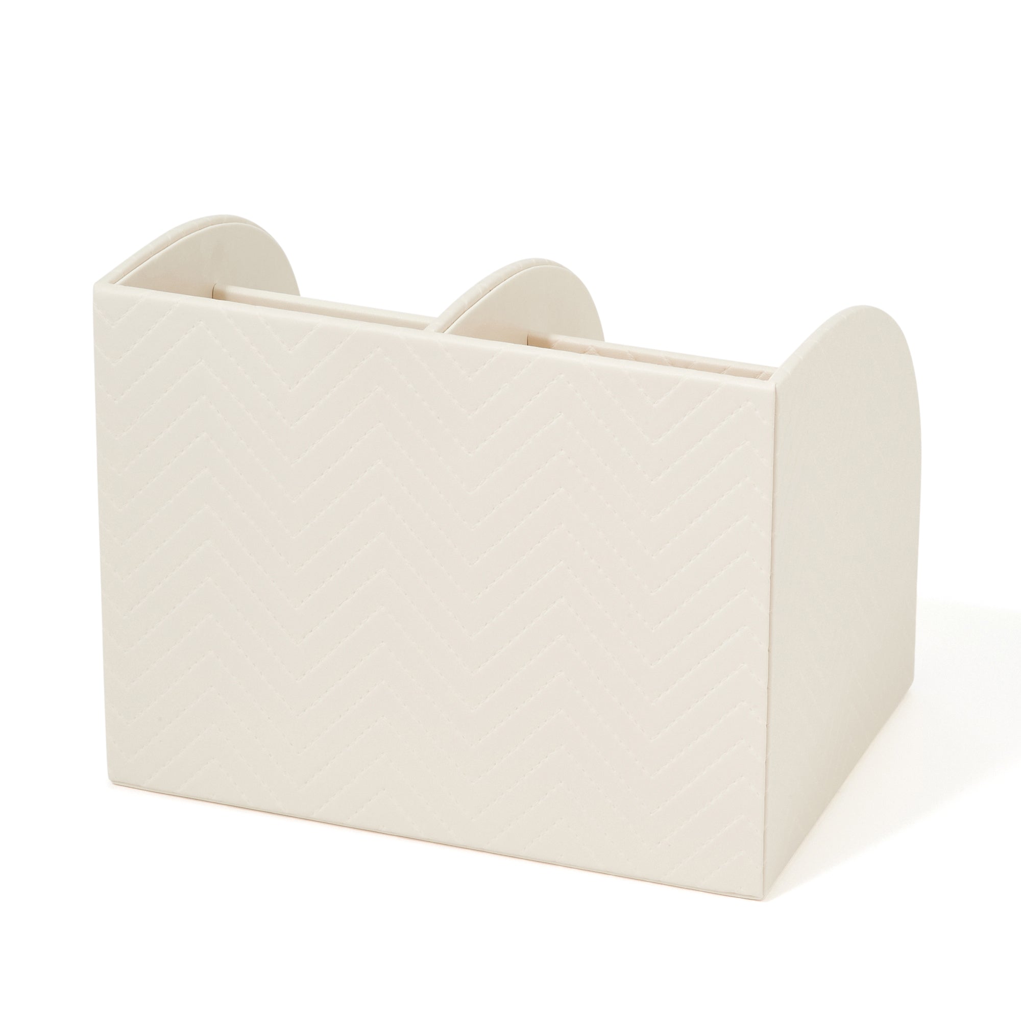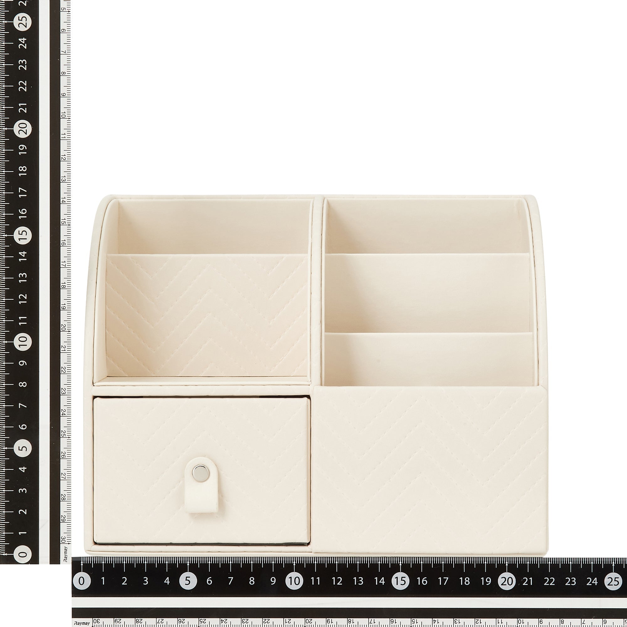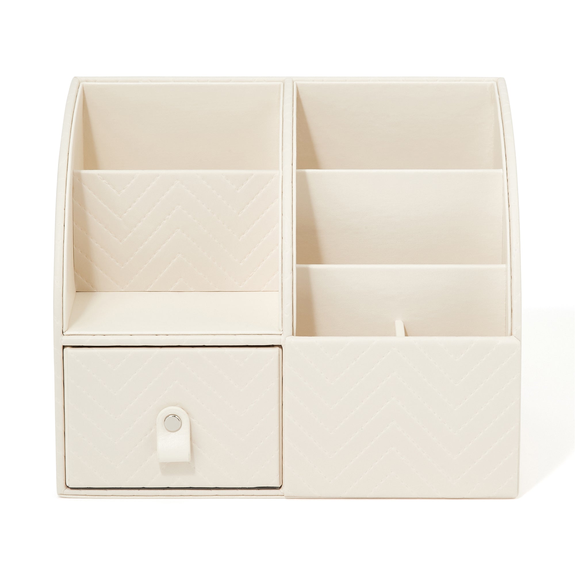デスク周りの物を一気に収納できる、高級感あふれる合皮のデスクオーガナイザーです。引き出しもついており、付箋などの散らばりがちな小物やコード類の収納にもおすすめです。引き出しの上のスペースには、お気に入りの小物を飾って楽しむこともできます。
