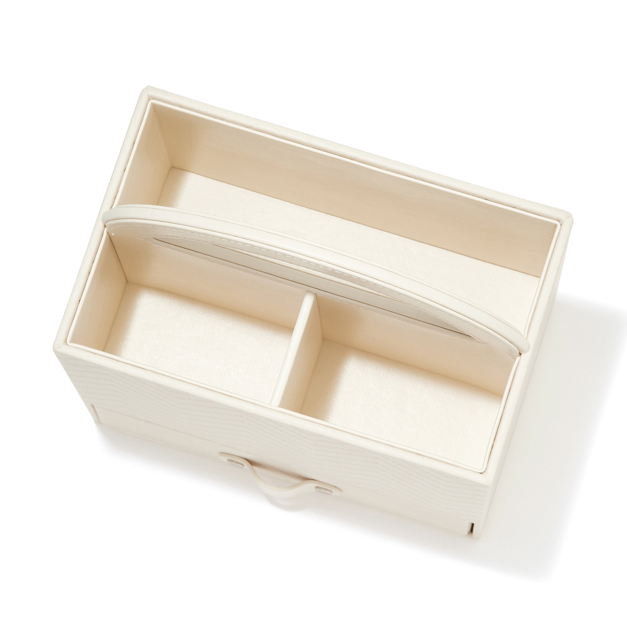 デスク周りの物を収納できる、高級感あふれる合皮のデスクオーガナイザーです。持ち手付きで簡単に持ち運びができます。引き出しもついており、付箋などの散らばりがちな小物やコード類の収納にもおすすめです。リモコンやスマートフォンをしまうのにぴったりのサイズだからリビングスペースのお片付けにも役立ちます。
