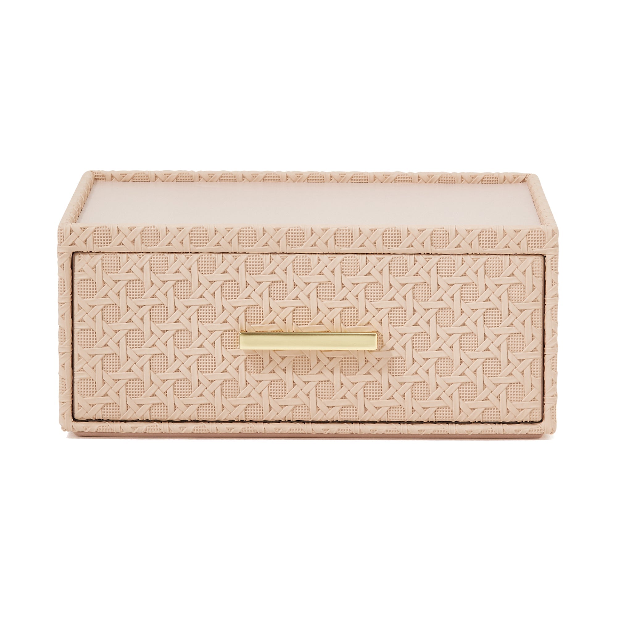 高級感ある合皮のステーショナリーボックスです。引き出し式のボックスで、デスク周りに散らばりがちな充電アイテムやマウスなど、小物をまとめるのにちょうどよいサイズです。スタッキングして使用することも可能です。
