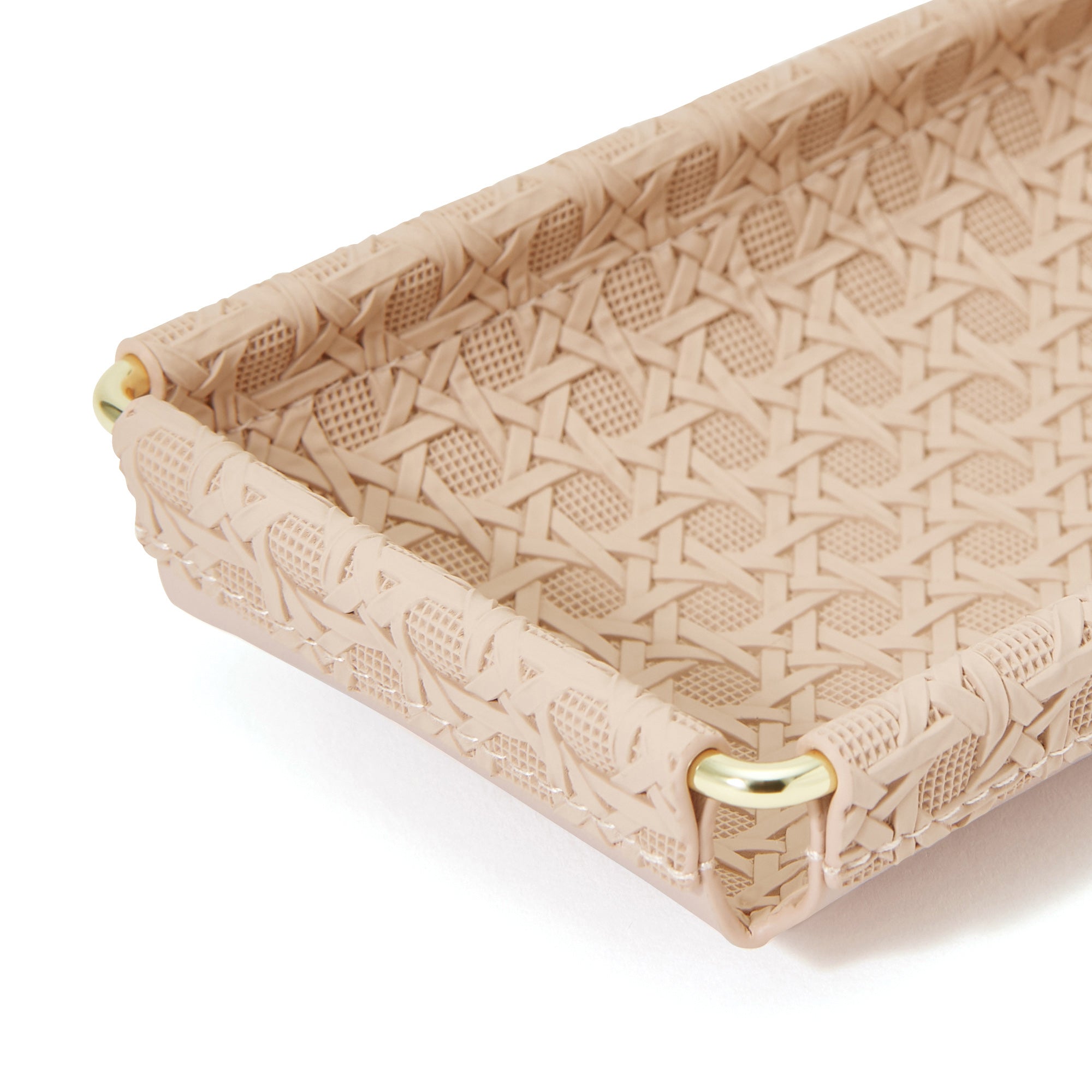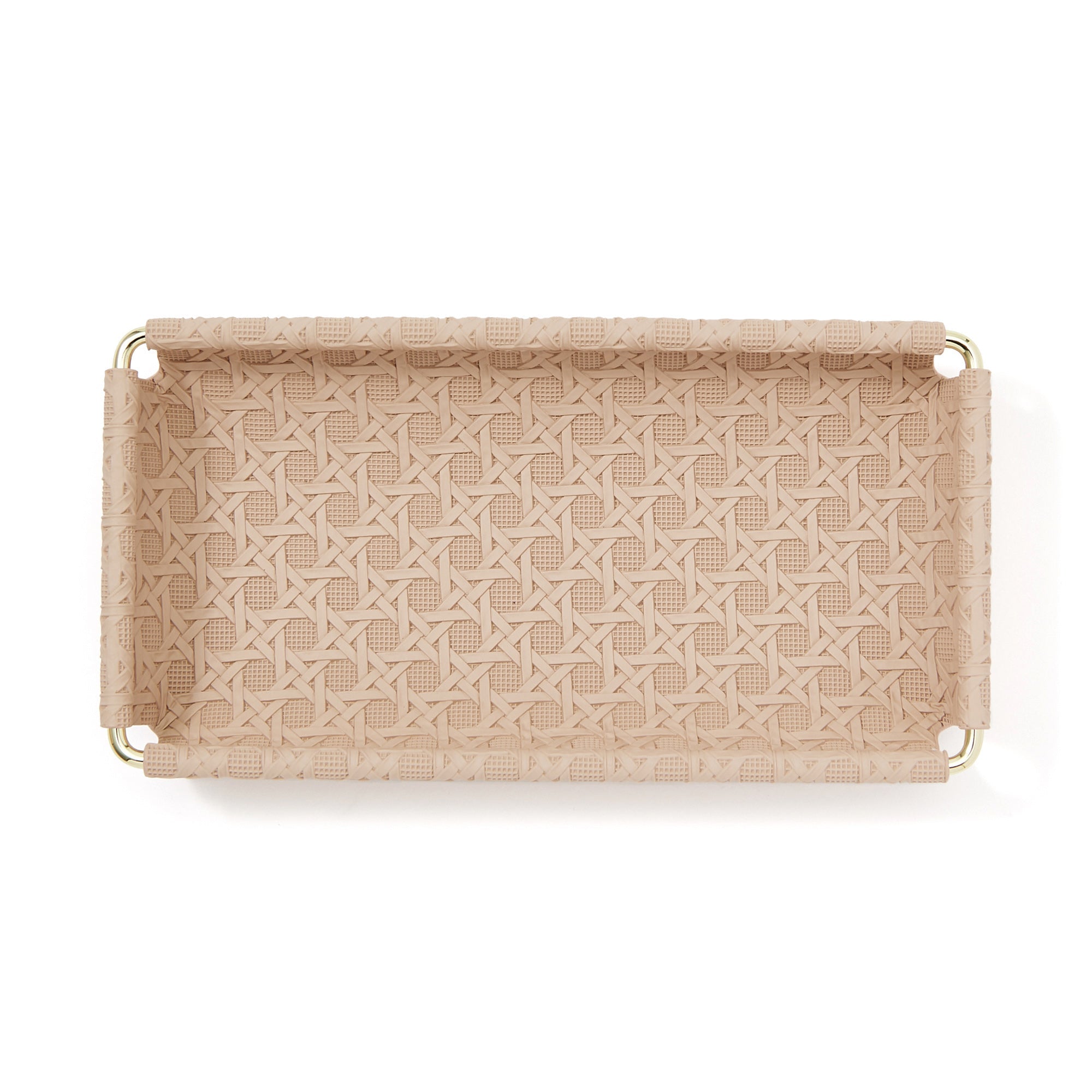 上品な合皮と金具を組み合わせた、高級感のある大きめトレイです。腕時計やデスク周りの小物置き、ペンやめがねを収納するのにも適したサイズ。玄関に置いて鍵の定位置にするのもおすすめです。
