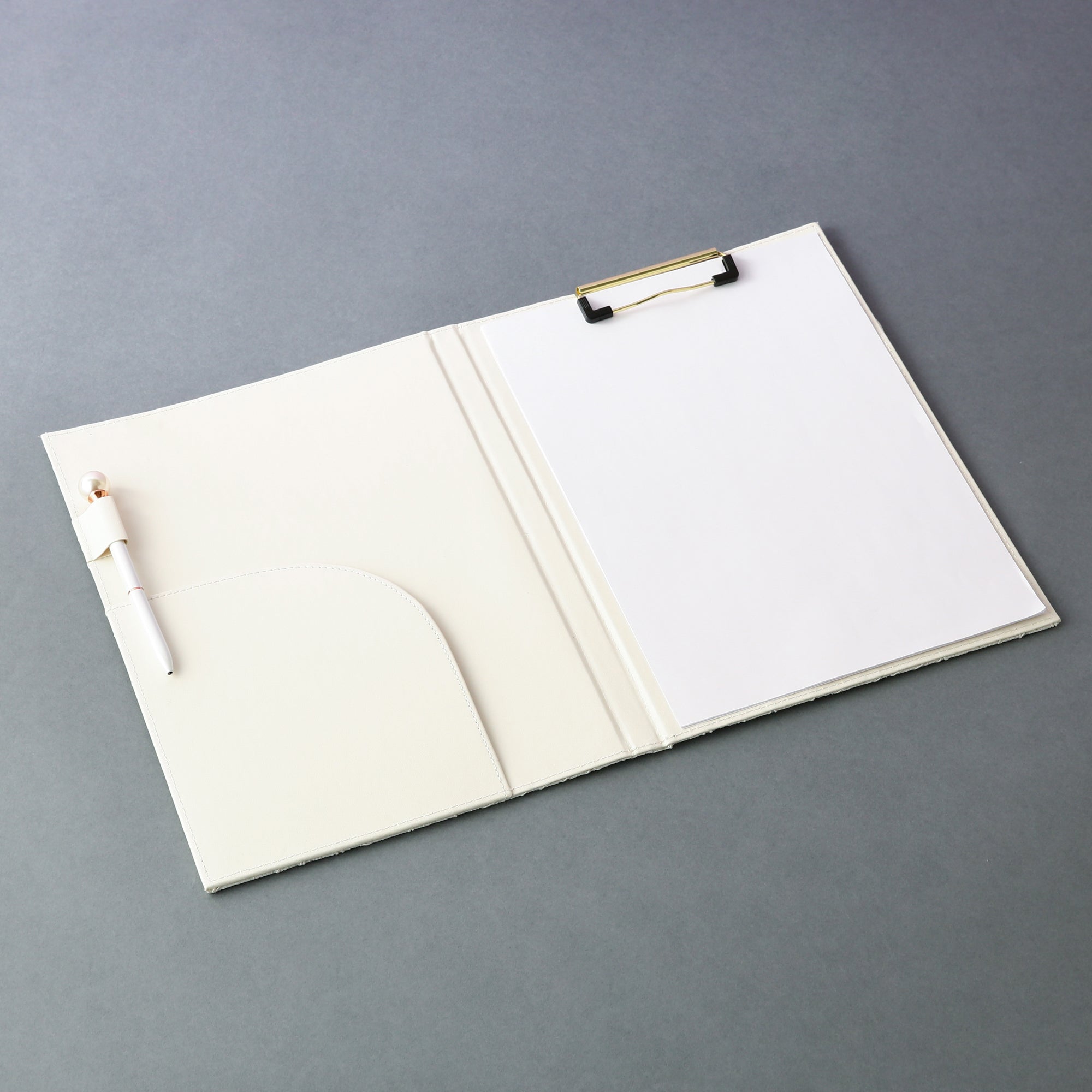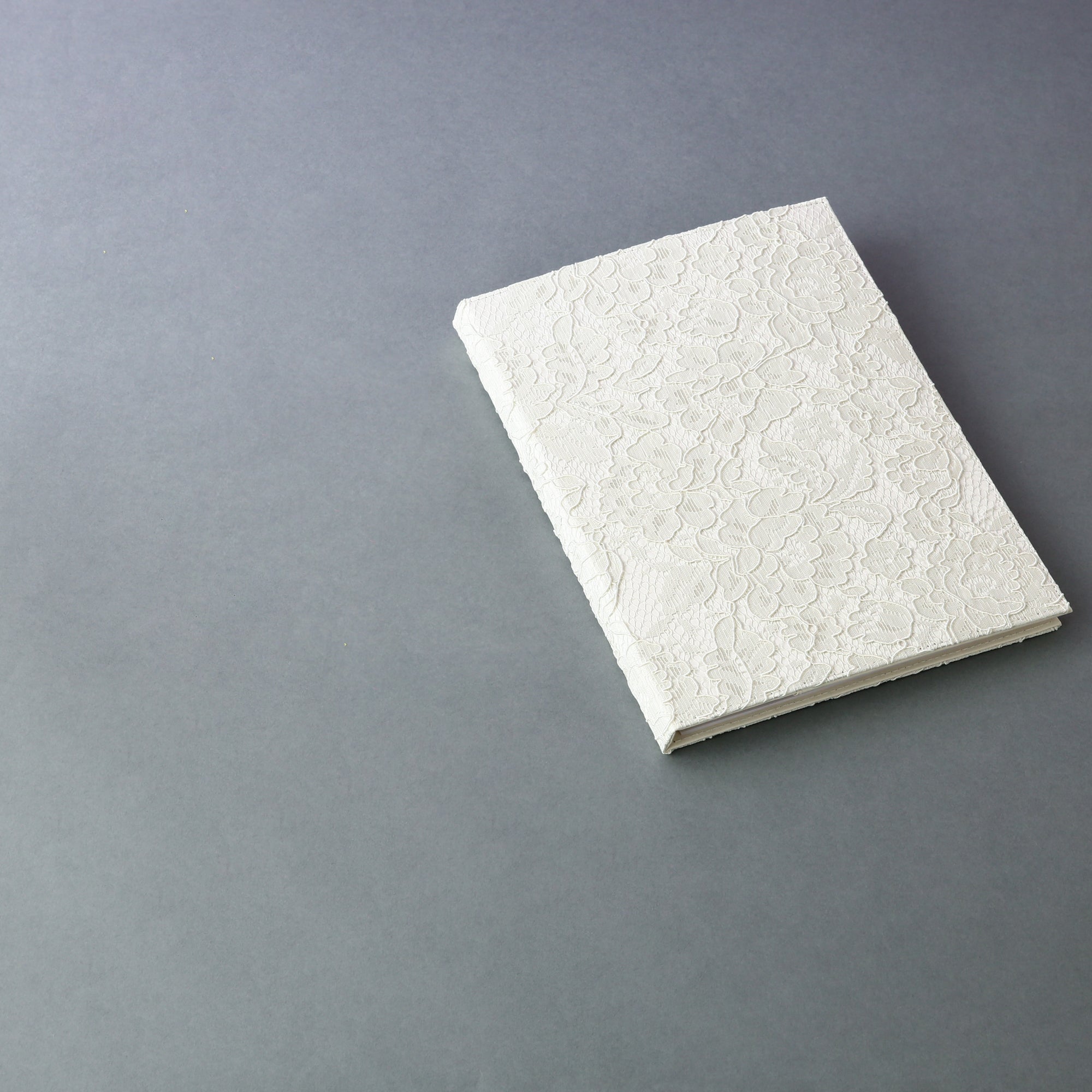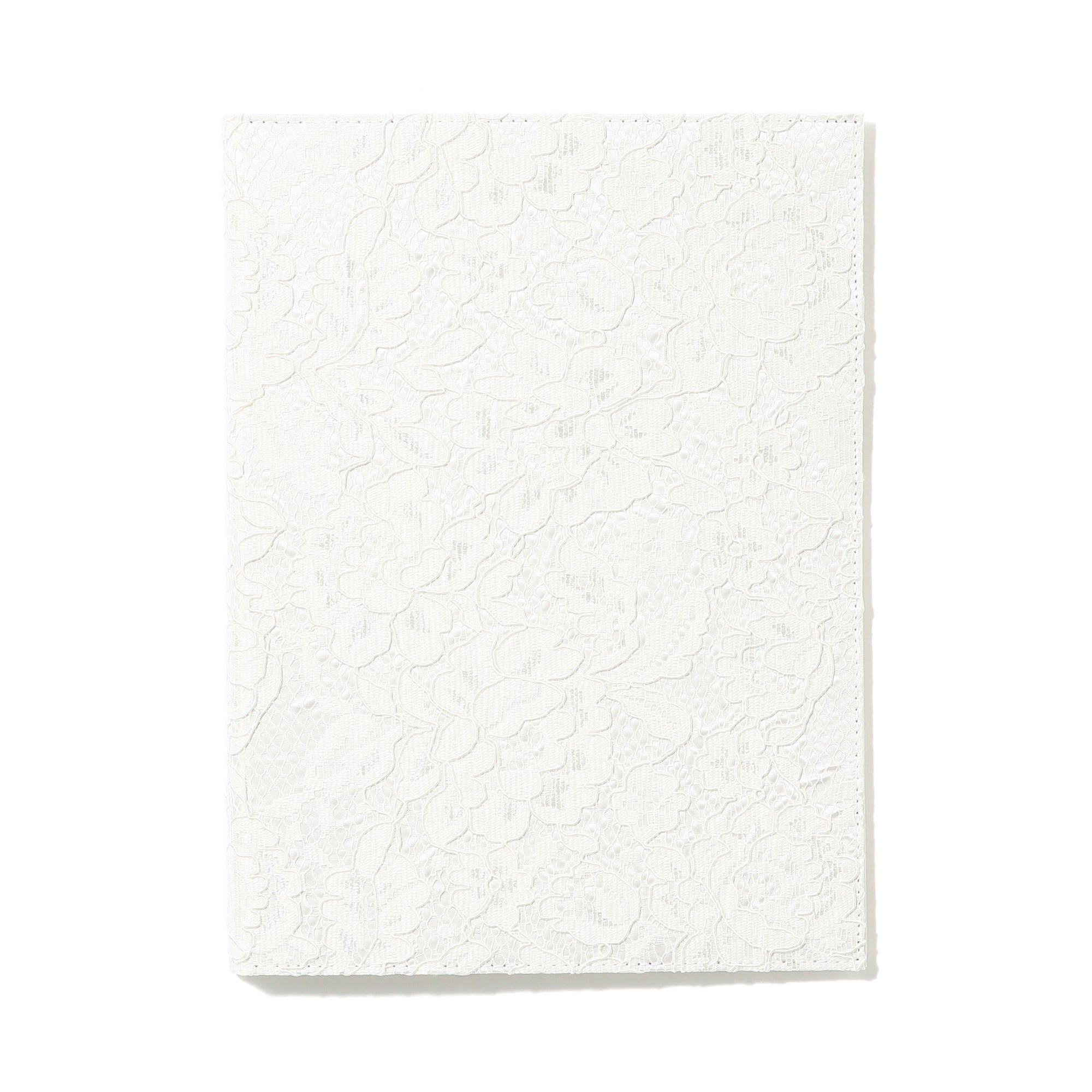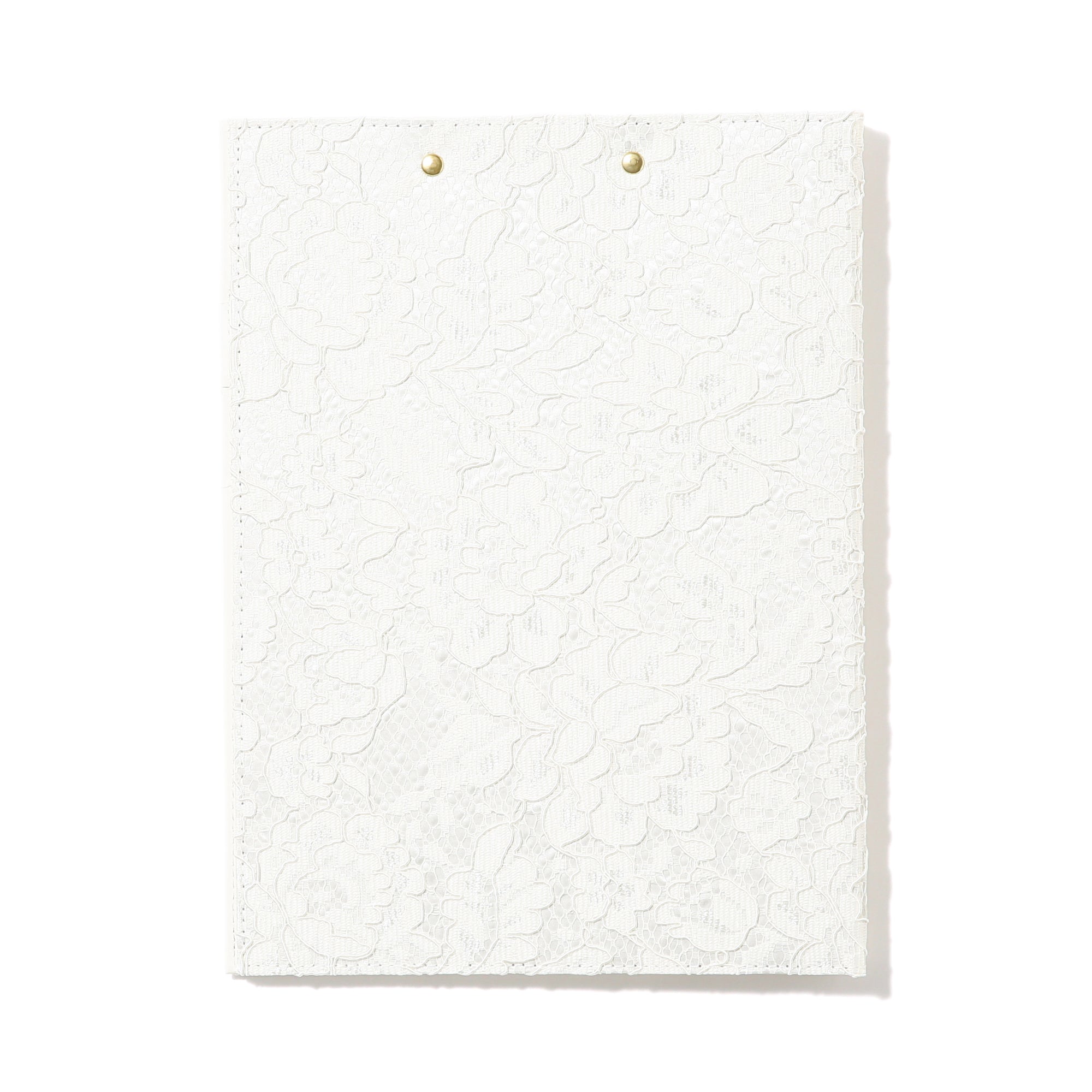 表面にレース生地をあしらったバインダーです。 シンプルなバインダーなのでどんな場面でもご使用いただけます。 内側にポケットがついており、書類、封筒、ペンなどを挟める便利な仕様です。