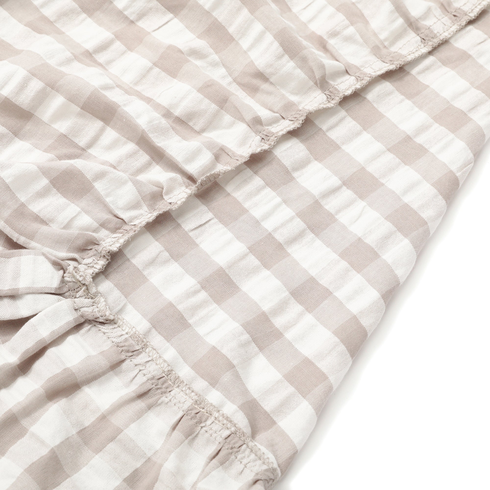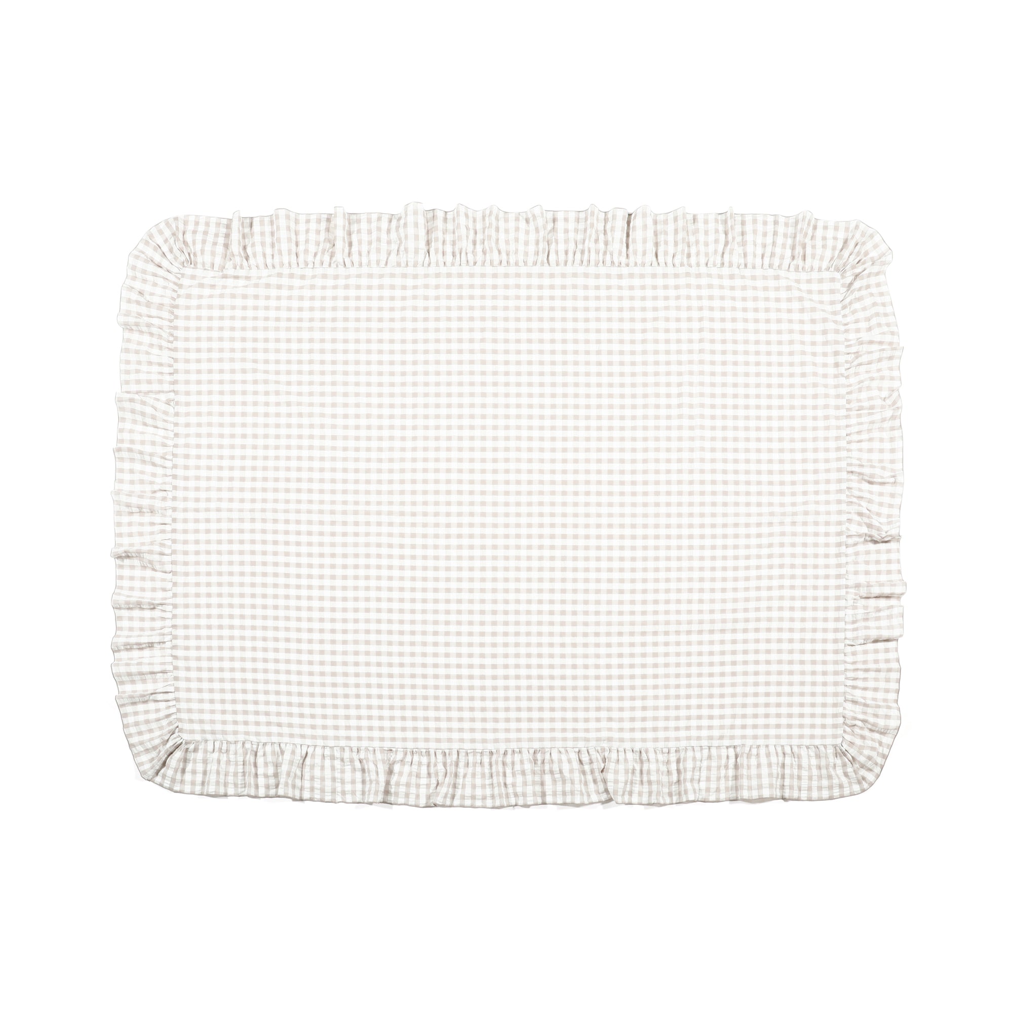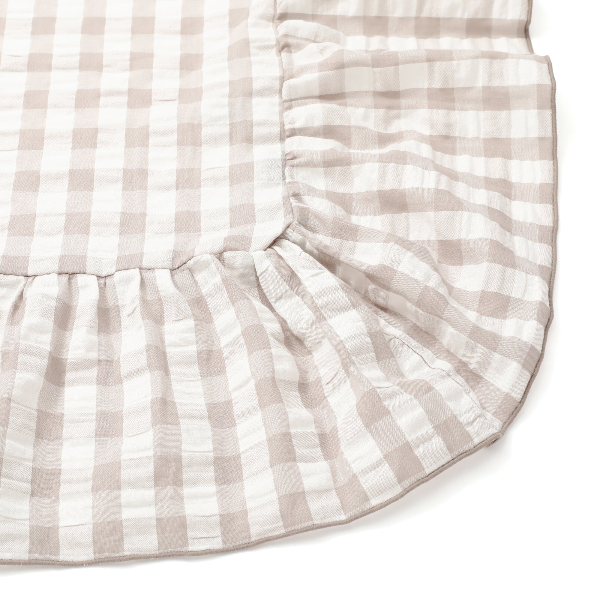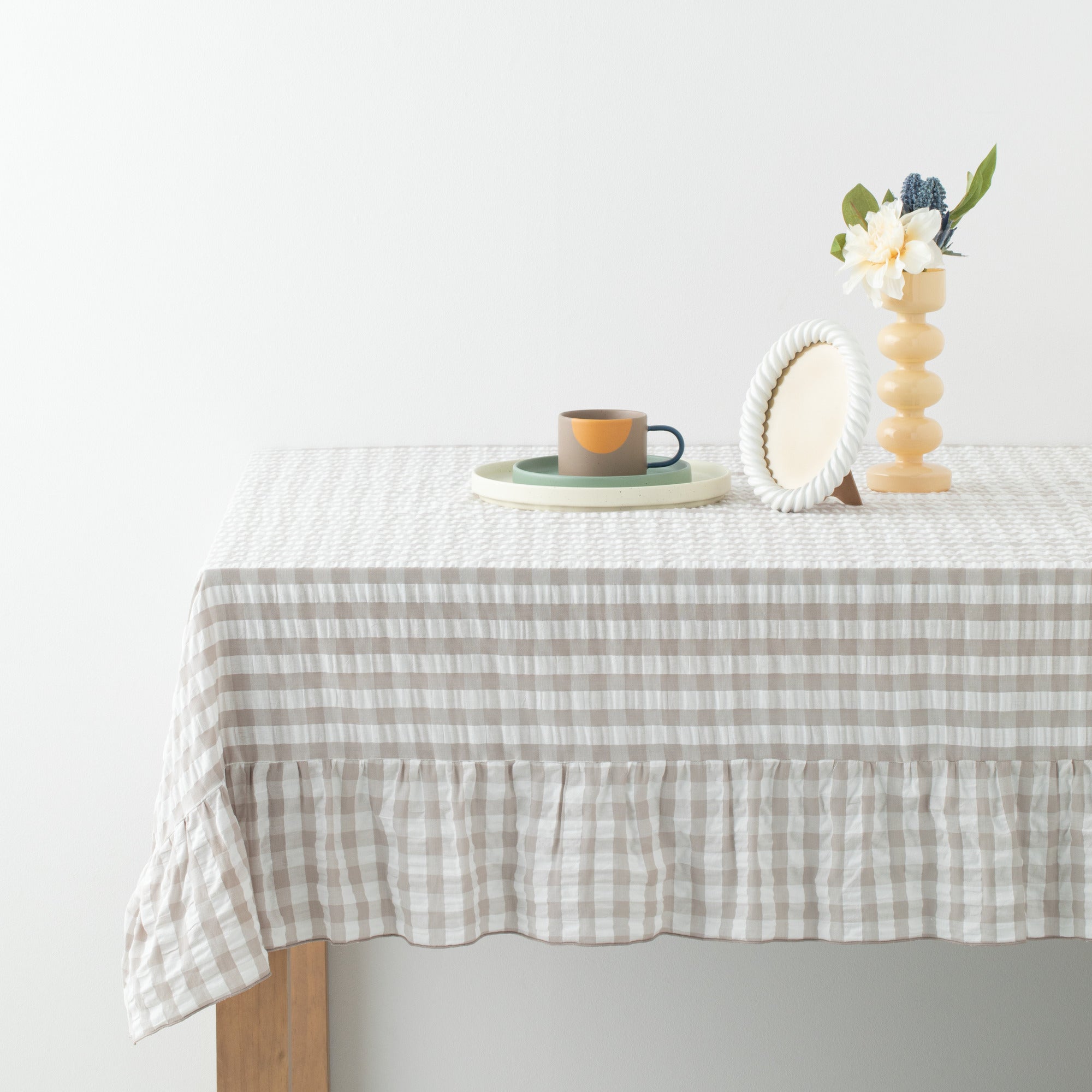 フリルがかわいらしいテーブルクロスです。シアサッカーのぽこぽこした生地とチェック柄が食卓を華やかに彩ります。ちょっとしたレジャーシートとしても使用できます。