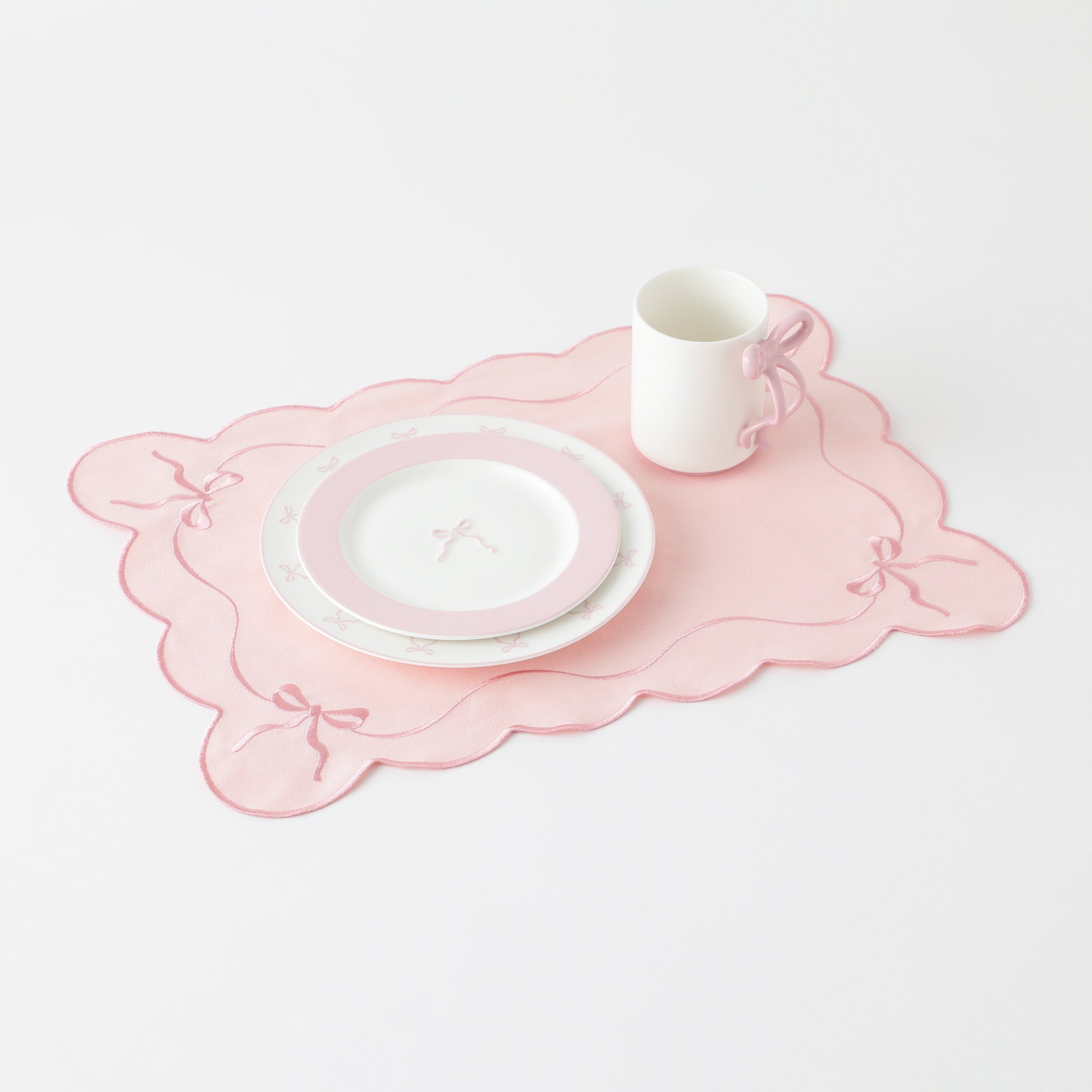 リボンの刺繍が施されたスカラップのかたちのランチマットです。生地と刺繍が同系色なので可愛くなりすぎず、華やかなテーブルコーディネートを演出できます。トレンドのリボンのプリントや 3D のリボンがかわいいおうちカフェシリーズ。プレートやグラス、ティーポットやカップ&ソーサーなど、豊富なアイテムをご用意しているのでライン使いがおすすめです。お気に入りで揃えて、のんびりおしゃれに自分だけのカフェタイムをお楽しみください。