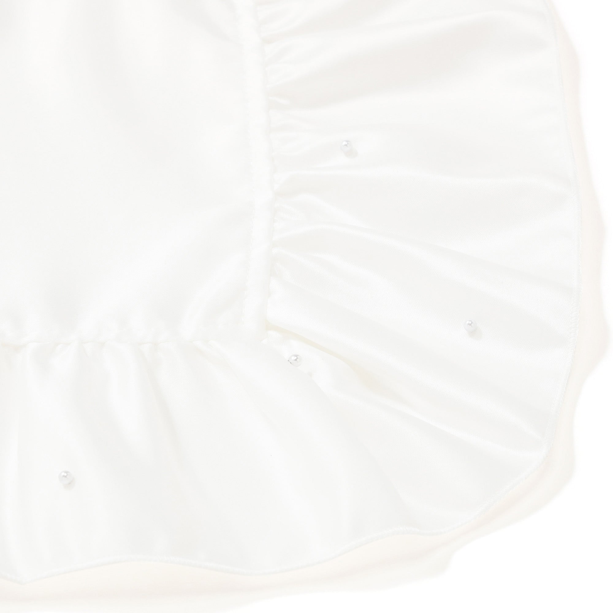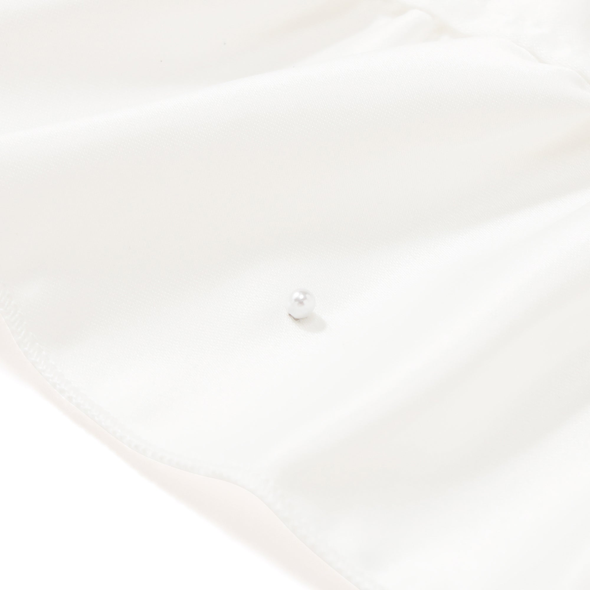 小ぶりなパールがきらりと輝くランチマットです。広めのやわらかなフリルと光沢のある生地がナチュラルなかわいらしさを引き立て、食卓を華やかに演出してくれます。