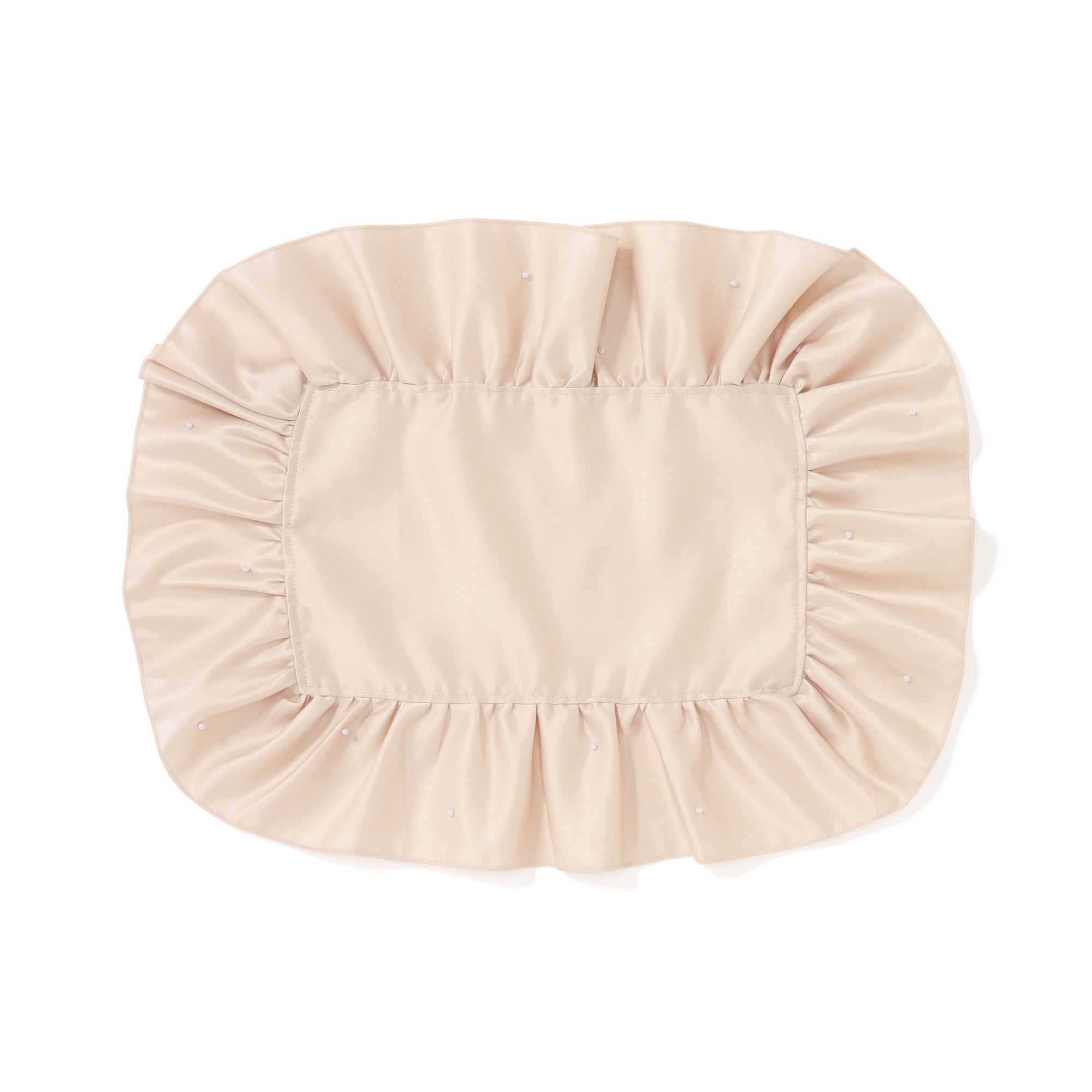 小ぶりなパールがきらりと輝くランチマットです。広めのやわらかなフリルと光沢のある生地がナチュラルなかわいらしさを引き立て、食卓を華やかに演出してくれます。