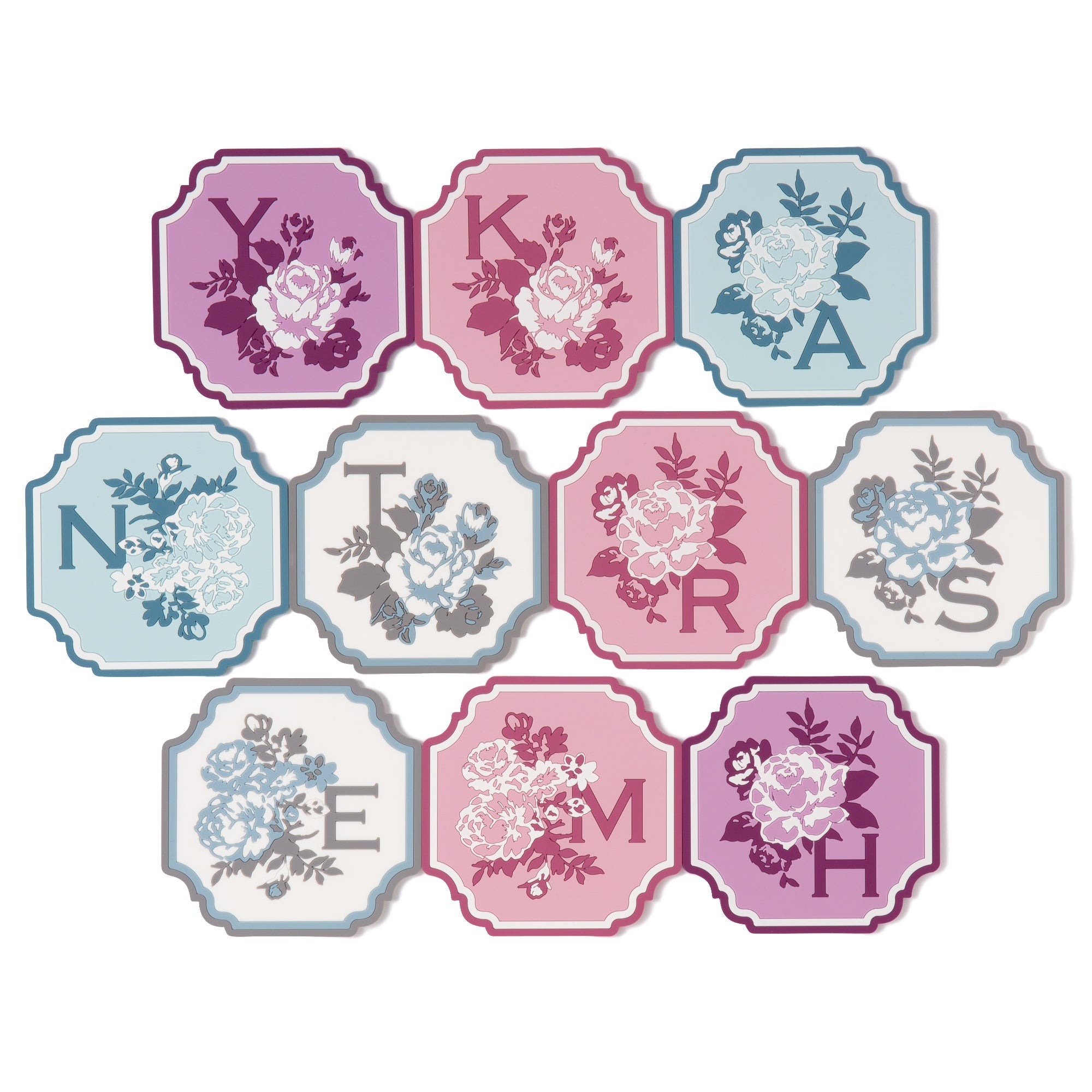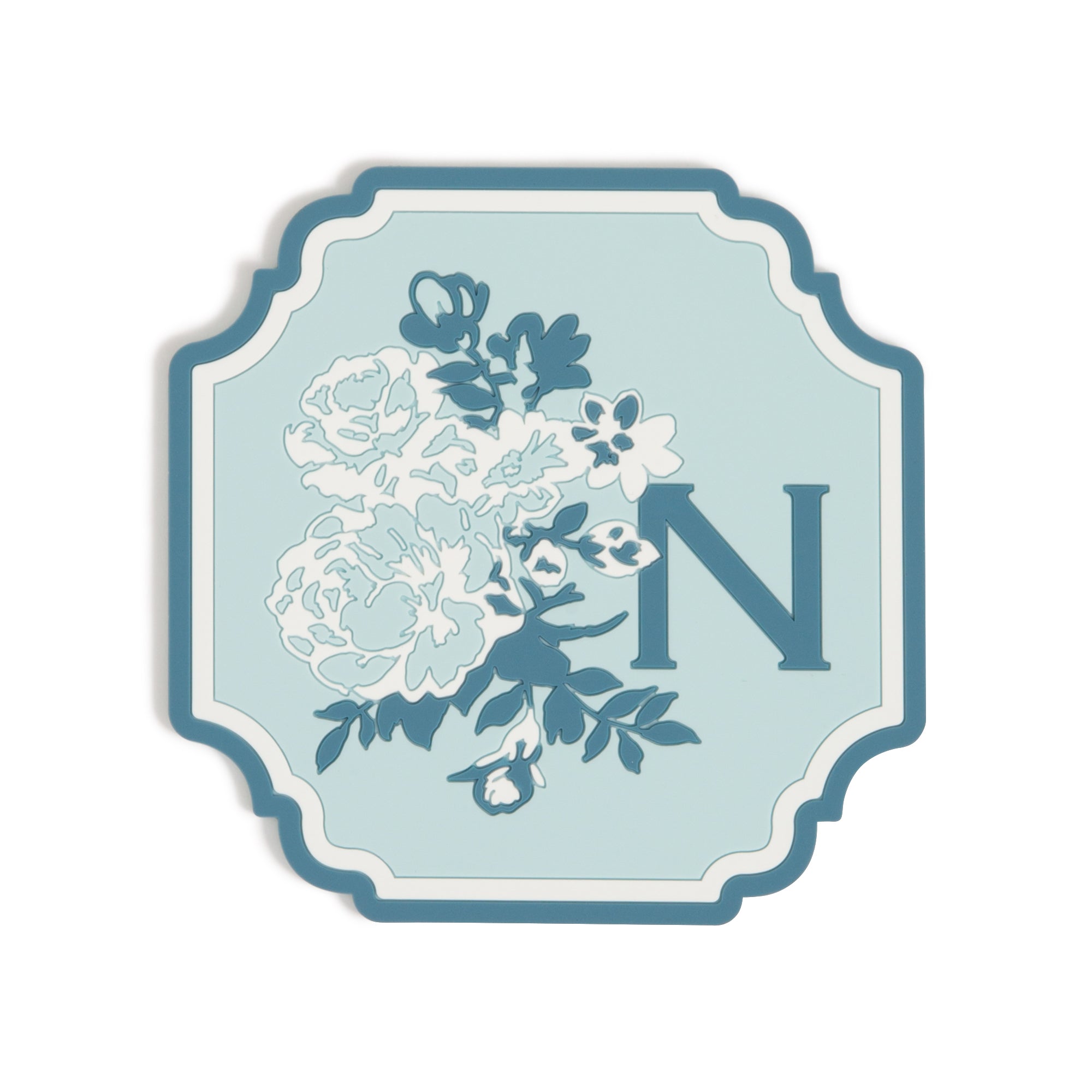 花柄モチーフとイニシャルを組み合わせた華やかなコースターです。色味を絞ったことで落ち着いた大人っぽい印象なので幅広くコーディネートいただけます。イニシャルグラスとあわせたデザインなので、セットで贈り物にしても喜ばれます。