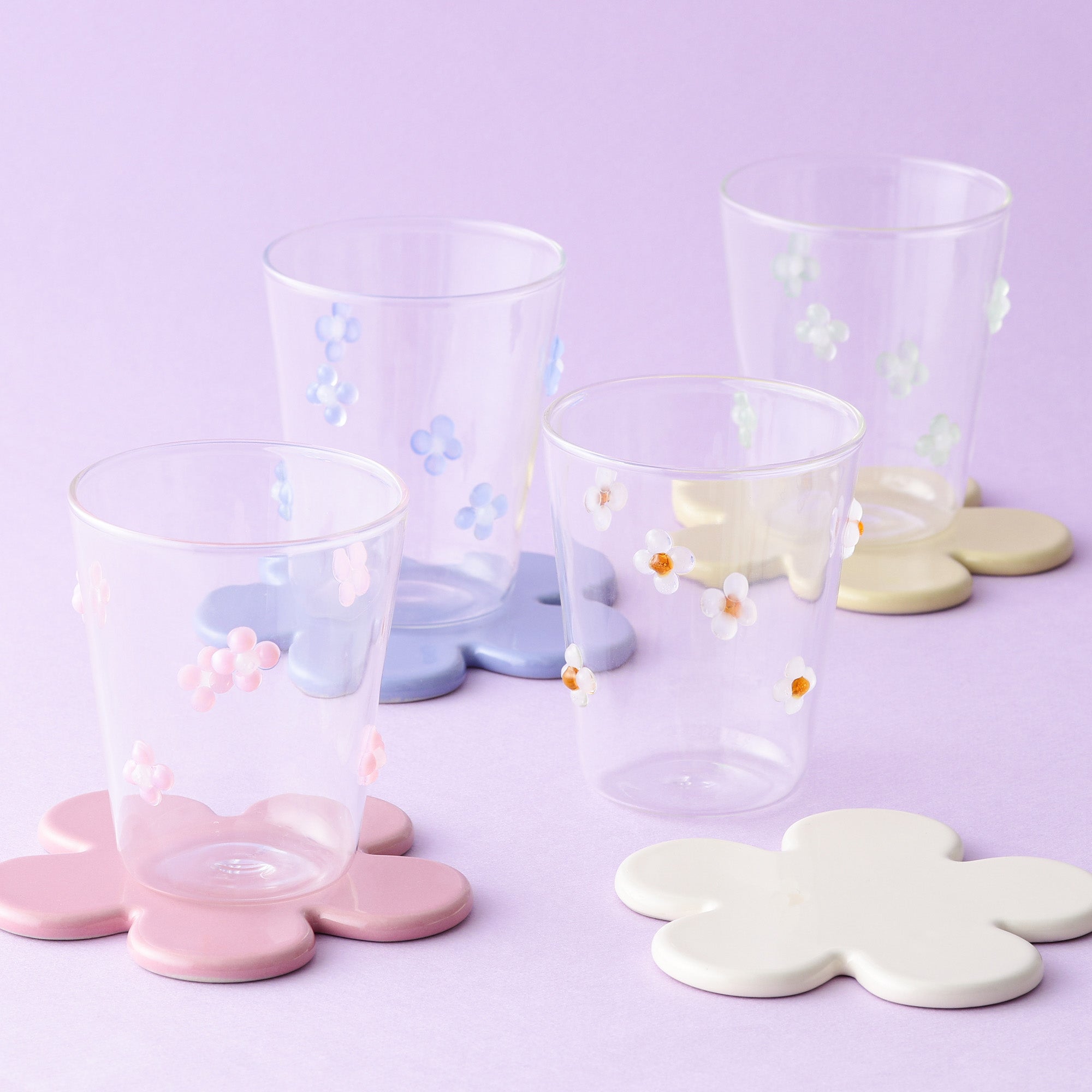 フラワーシェイプのコースターです。セラミック製なので汚れてもさっと洗えて便利。コースターとしてだけでなく、小物置きなどに使っても可愛いコーディネートが楽しめます。フラワーガラスタンブラーやフラワー箸置きとのコーディネートがおすすめです。