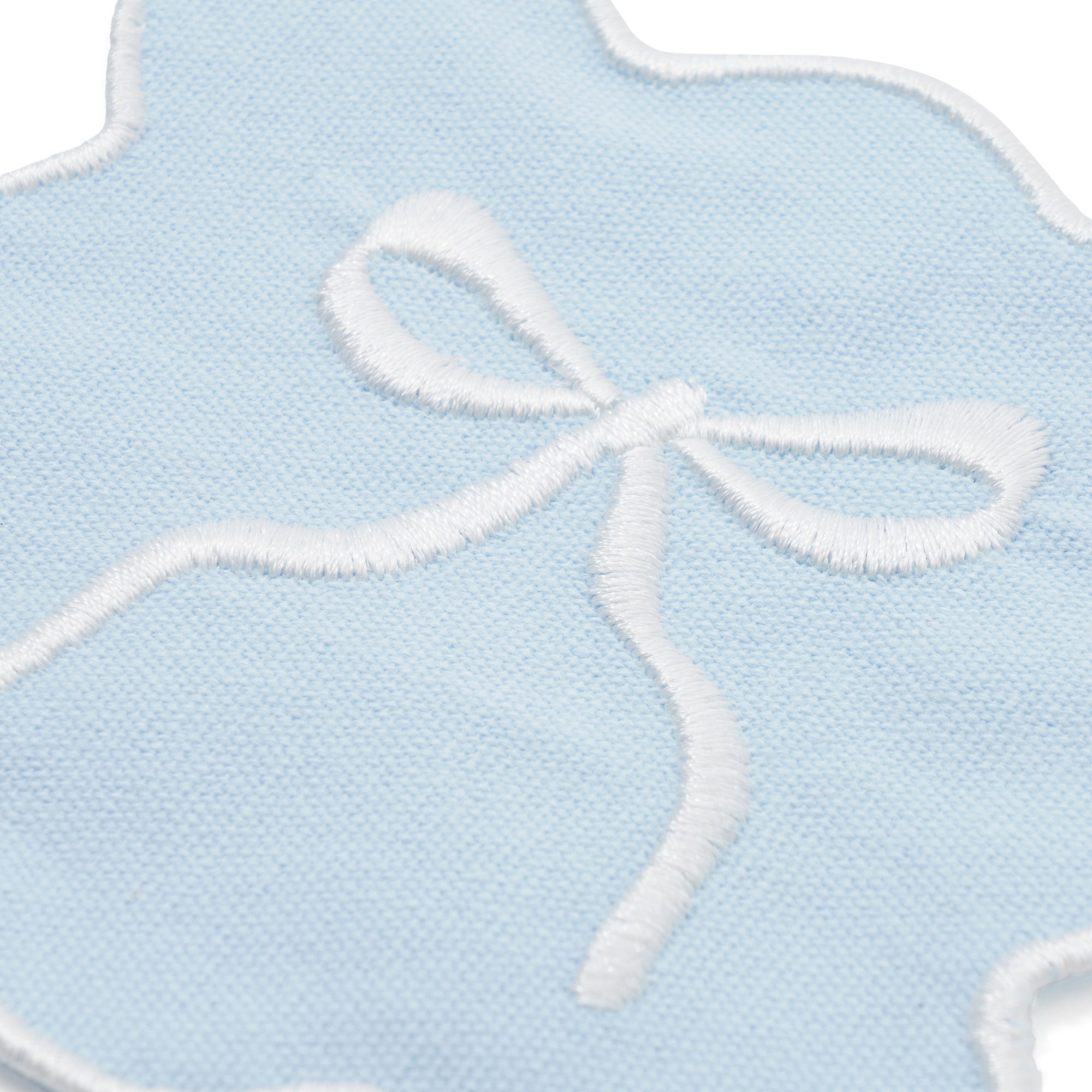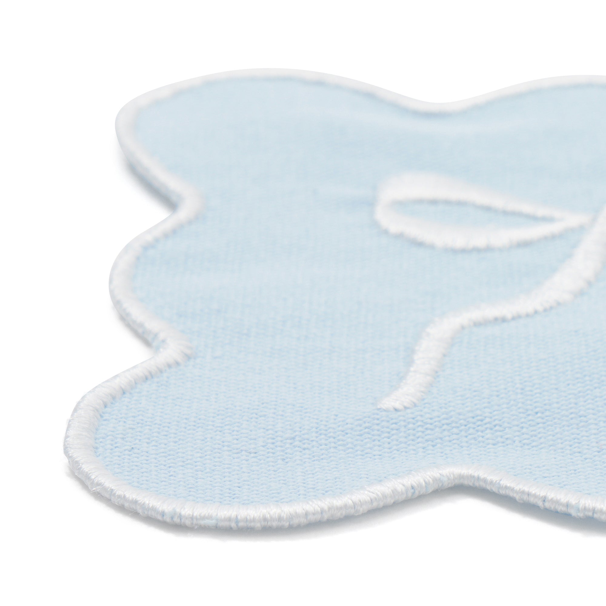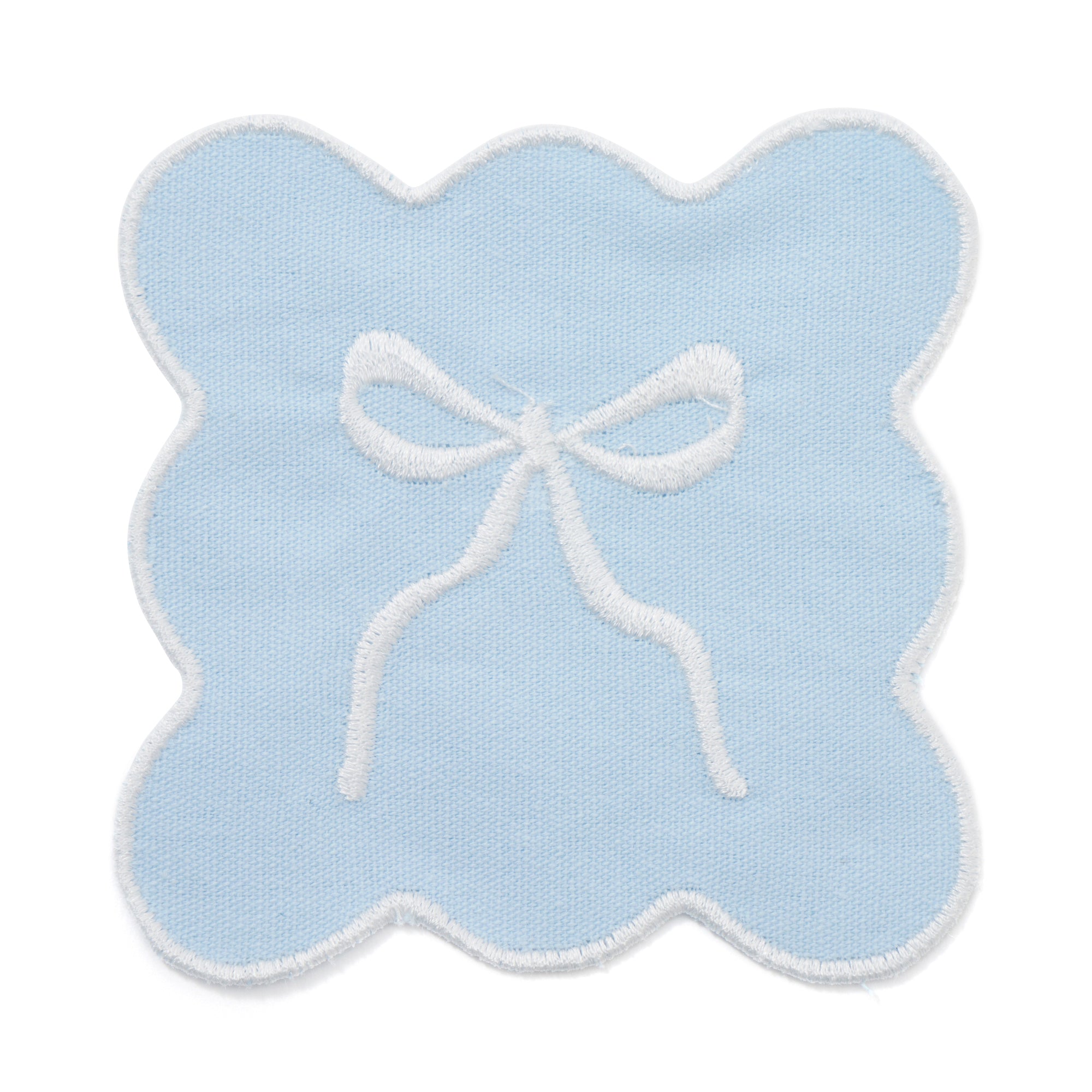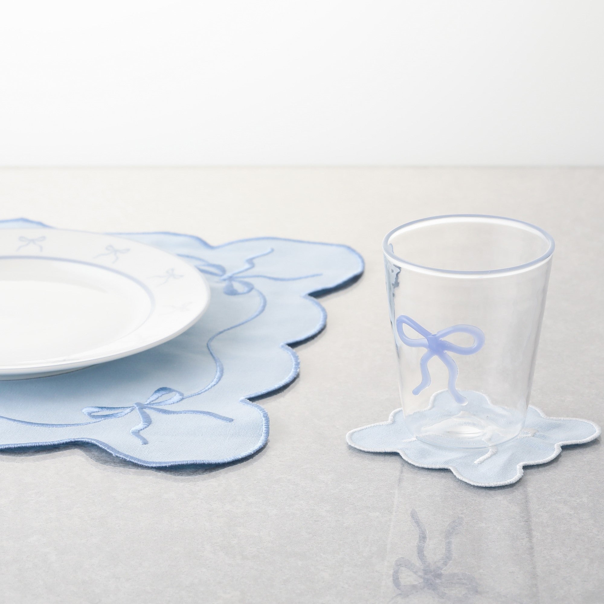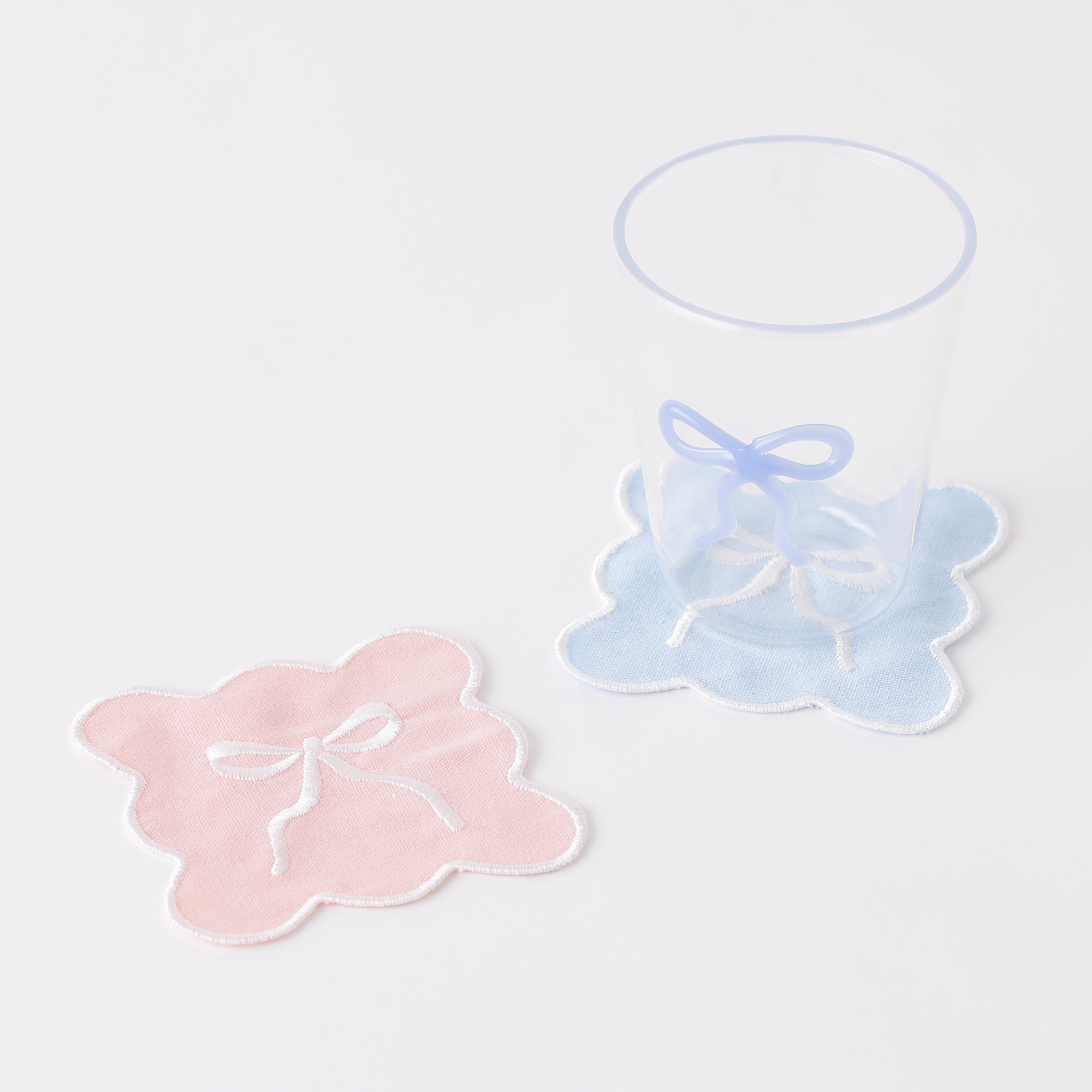リボンの刺繍が施されたスカラップのかたちのコースターです。デザイン性がありつつ落ち着いた色味なのでグラスやマグに合わせやすいデザインです。トレンドのリボンのプリントや 3D のリボンがかわいいおうちカフェシリーズ。プレートやグラス、ティーポットやカップ&ソーサーなど、豊富なアイテムをご用意しているのでライン使いがおすすめです。お気に入りで揃えて、のんびりおしゃれに自分だけのカフェタイムをお楽しみください。