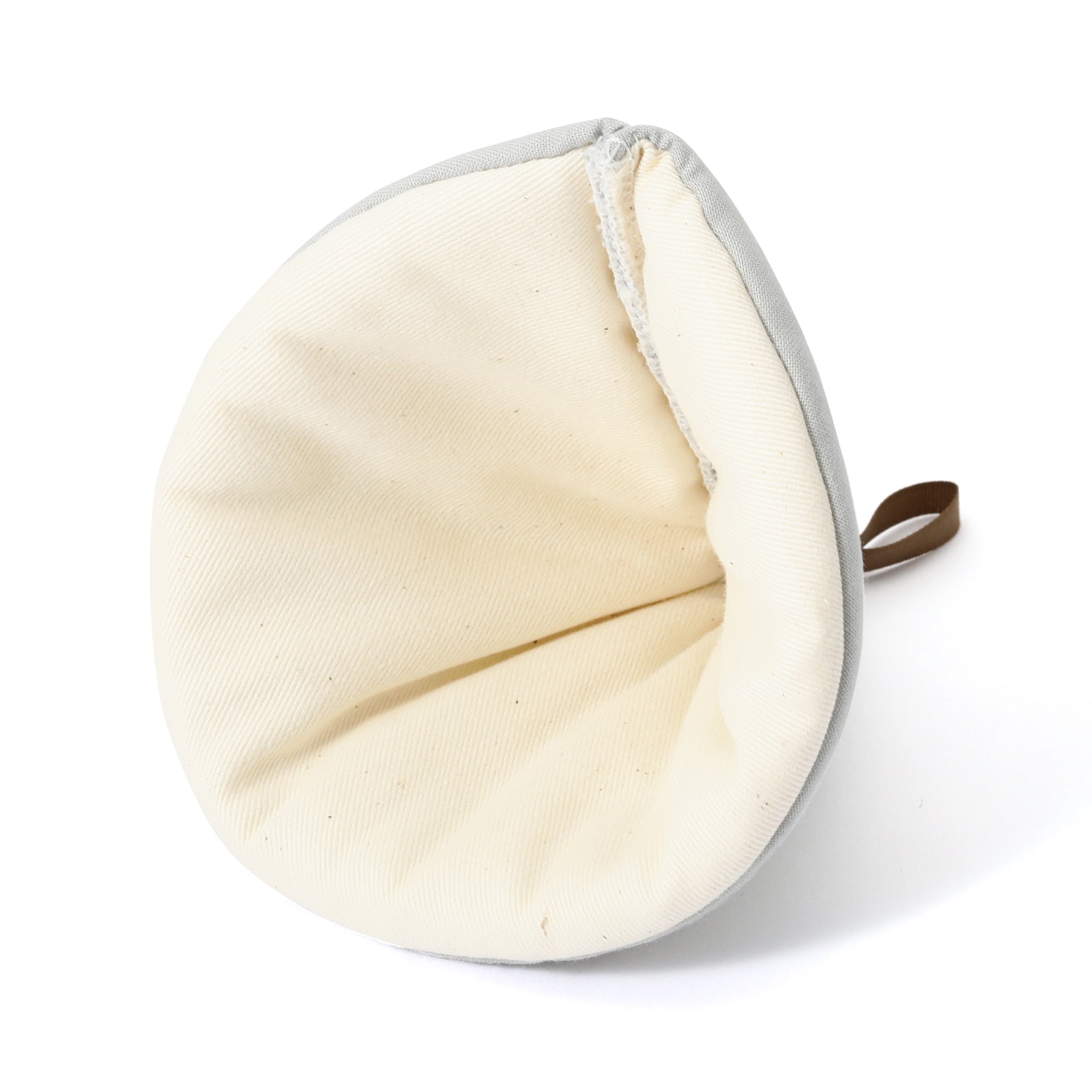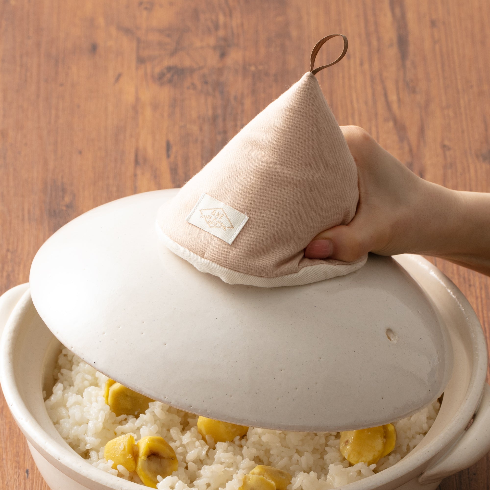 シンプルな色合いがかわいい三角錐型の鍋つかみです。土鍋やスキレットにも使える大きめサイズで、いろんな場所で活躍してくれます。ころんとした三角形が鍋の蓋や取っ手にぴったりはまり、機能性も抜群。ふんわりとした触り心地です。便利な紐つきで、さっと壁に吊るせばキッチンにリズムと彩りを添えてくれます。同色で揃えたり、お好きな組み合せを選んでプレゼントするのもおすすめです。