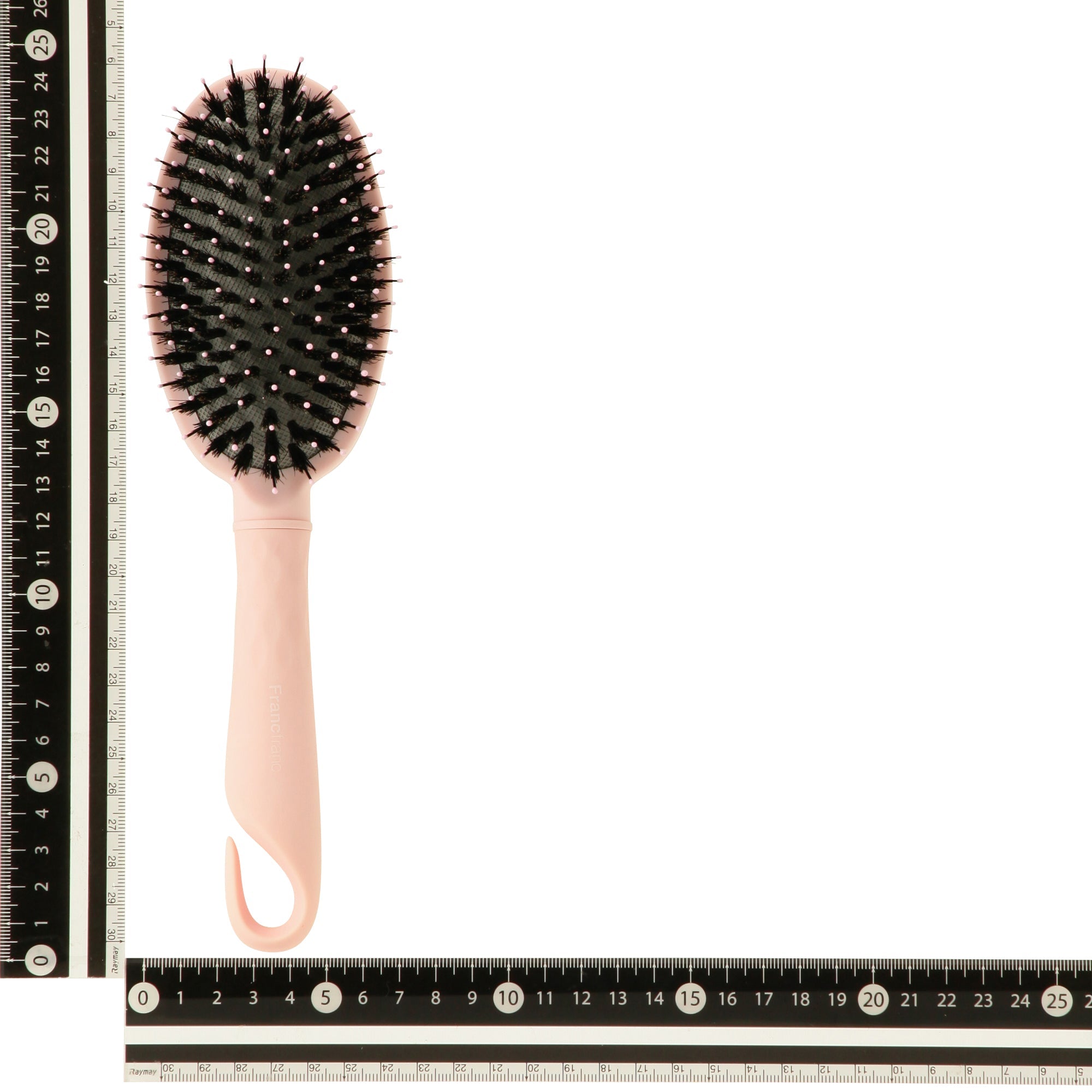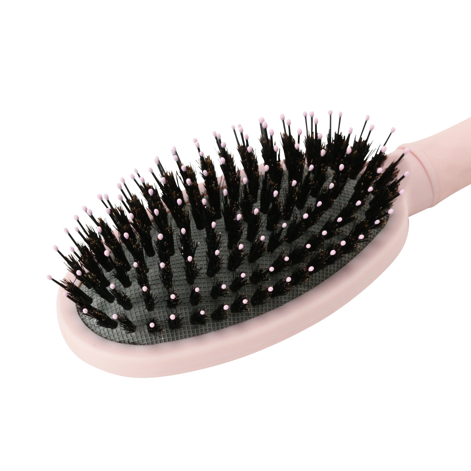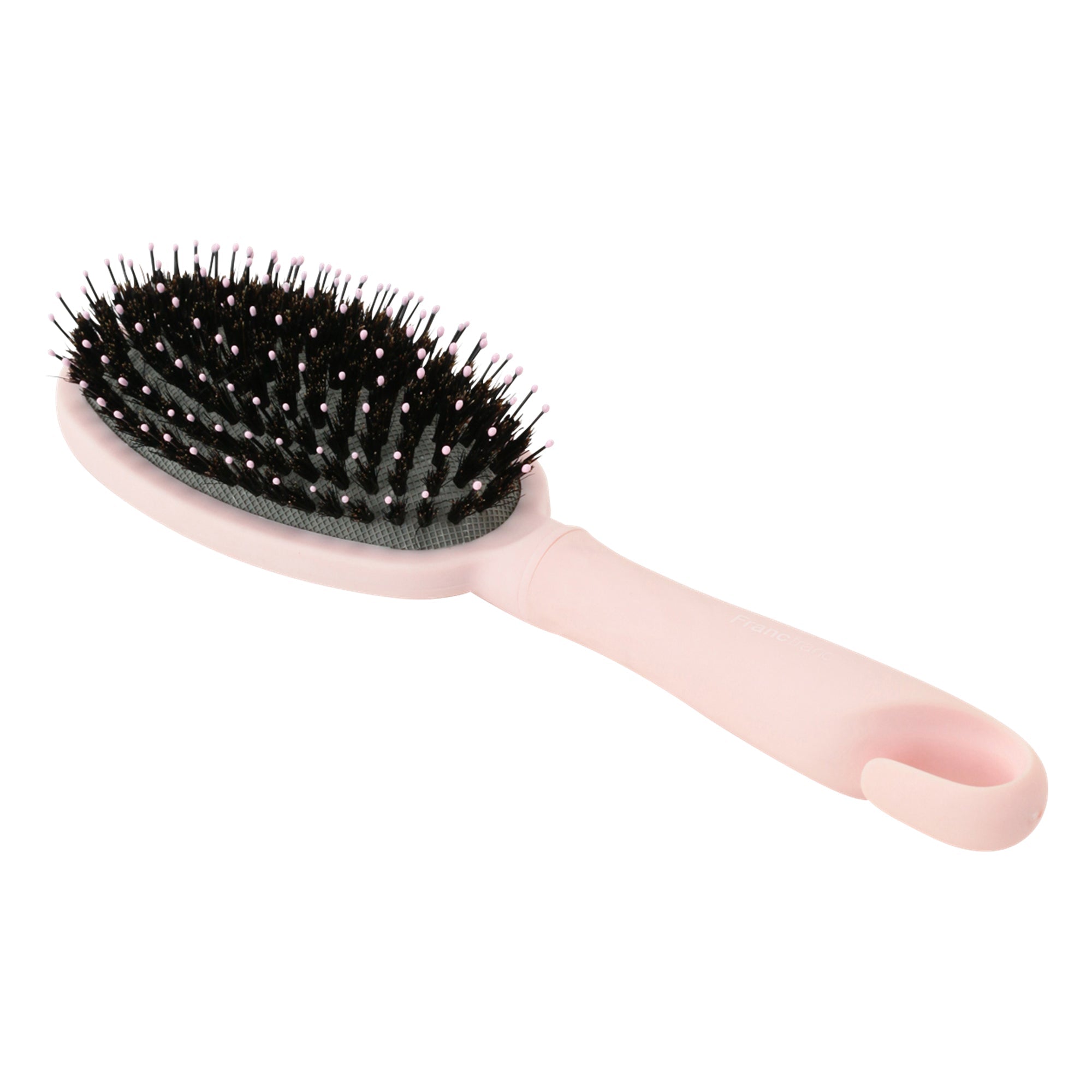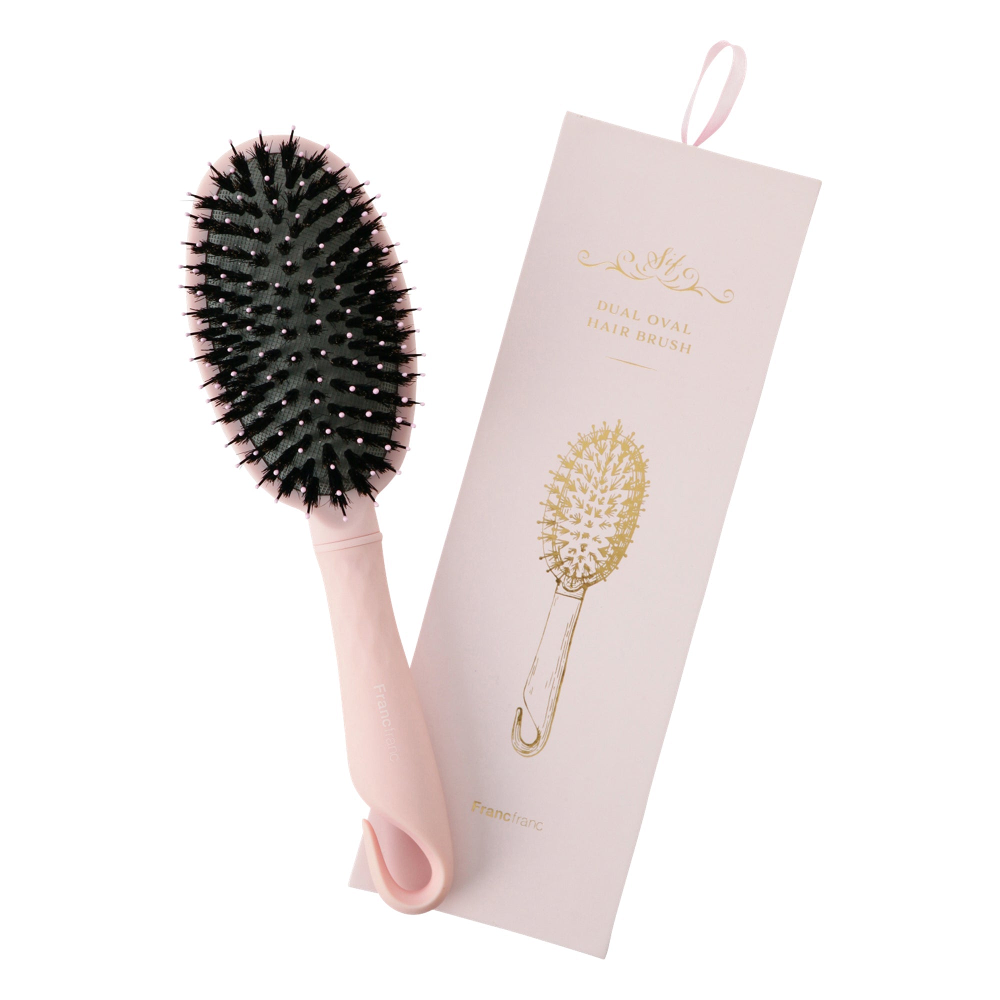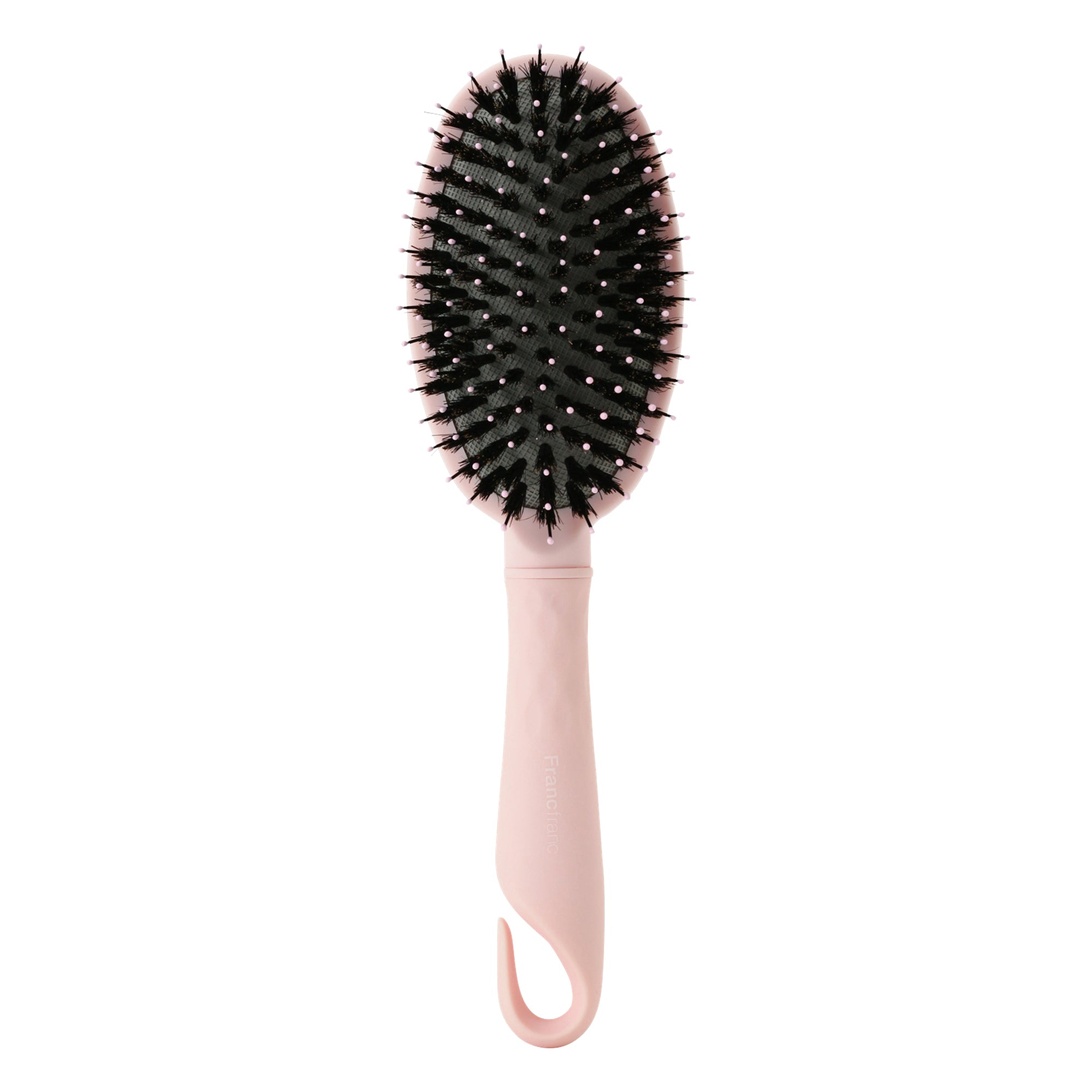 マットピンクのボディカラーが女性らしいデザインのヘアブラシです。ナイロンピンと動物毛(猪毛)がミックスされたクッション付きブラシ。髪の毛にツヤを出したい方におすすめです。静電気防止加工を施しており、髪の毛の広がりを抑えて美しく整えます。リボン付きのギフトボックスに入っているので、女性の友人や家族に向けての贈り物にも最適です。フック掛けが出きるハンドルで、収納にも便利。