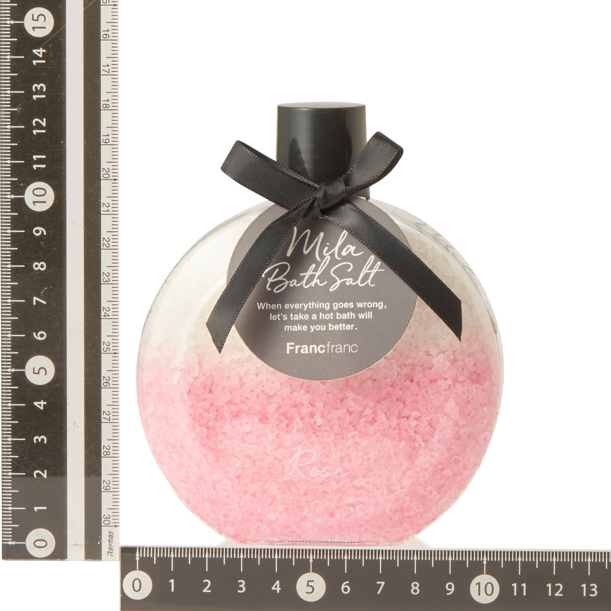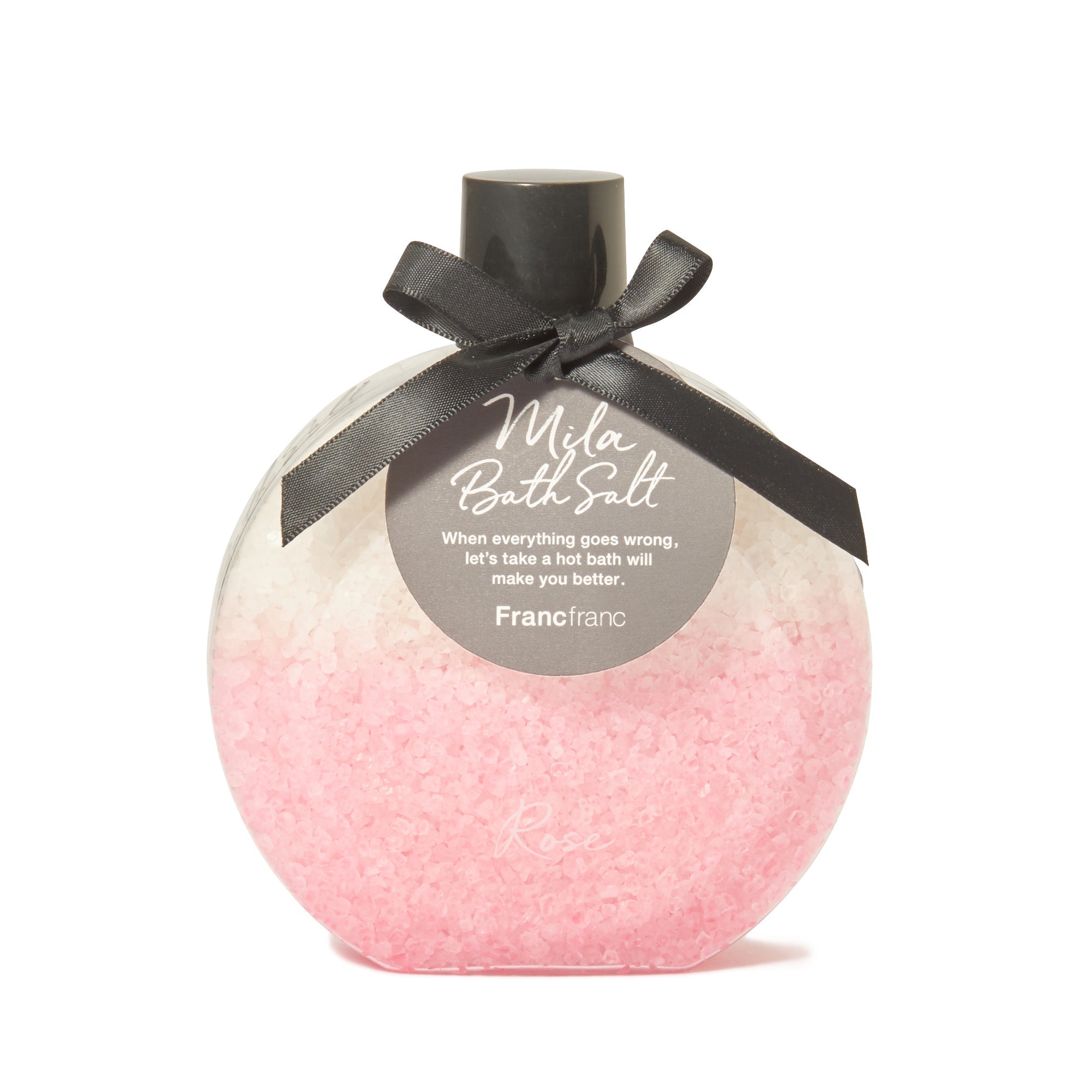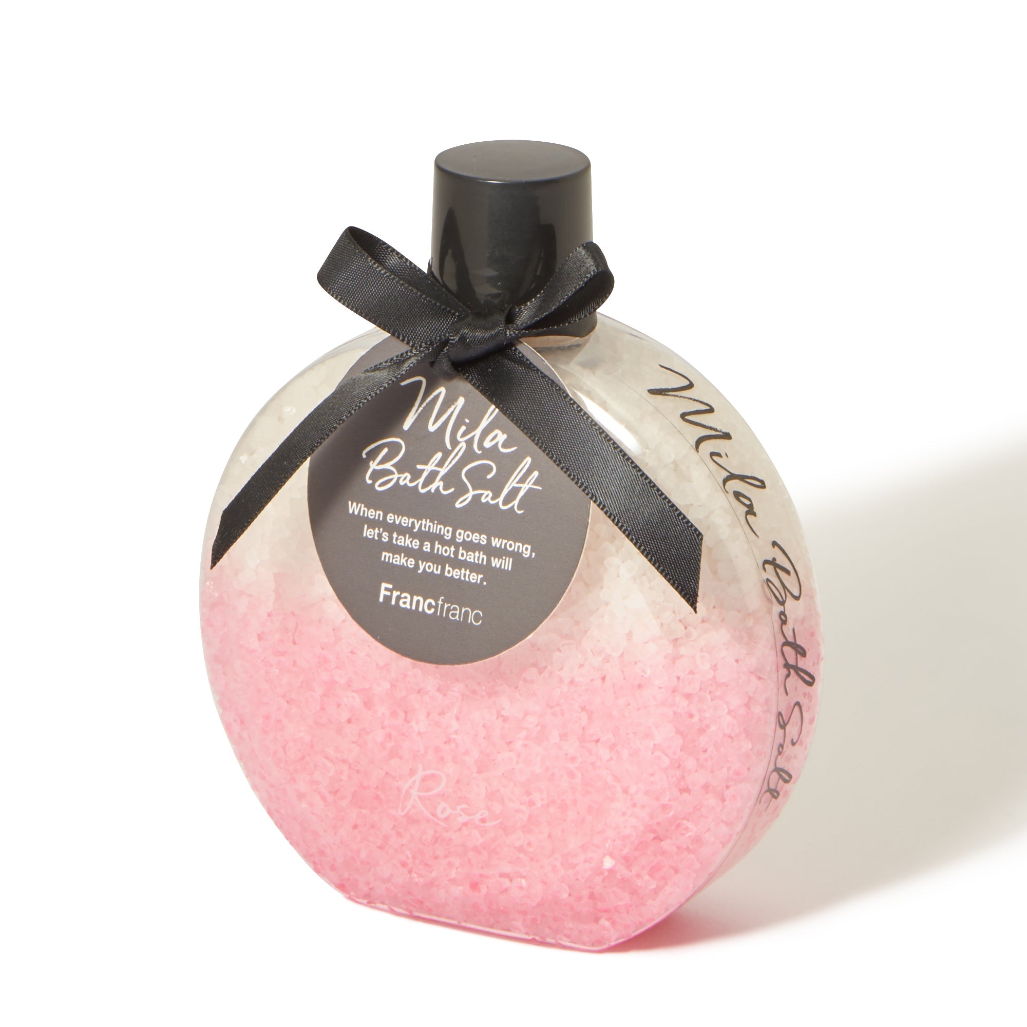 ※この商品は入浴剤です。食べ物ではありません。まるでカラーセラピーのボトルのようなカラーが美しいバスソルトです。香水瓶をイメージしたボトルは、インテリアとして飾りたくなる可愛さです。お洒落なボトルと乳白色とピンクの美しいグラーデーションが相まって、見るたび気分が上がるバスソルトに仕上がっています。ギフトにも喜ばれるアイテムです。バスソルト名のMilaとはドイツ語で〝羨望〟という意味。バスタブに入れた瞬間乳白色に変化し、バスルームいっぱいに上品なローズの香りが広がります。【使用目安】浴槽のお湯(約200L)に1回当たり約50g(約8回分)を入れ、よくかき混ぜてからご入浴ください。サイズはW42×D106×H125mmです。ローズ・ラベンダー・ムスクの3種類の香りを用意しており、お好きな香りをお楽しみいただけます。その日の気分に合わせてチョイスするのもおすすめ。