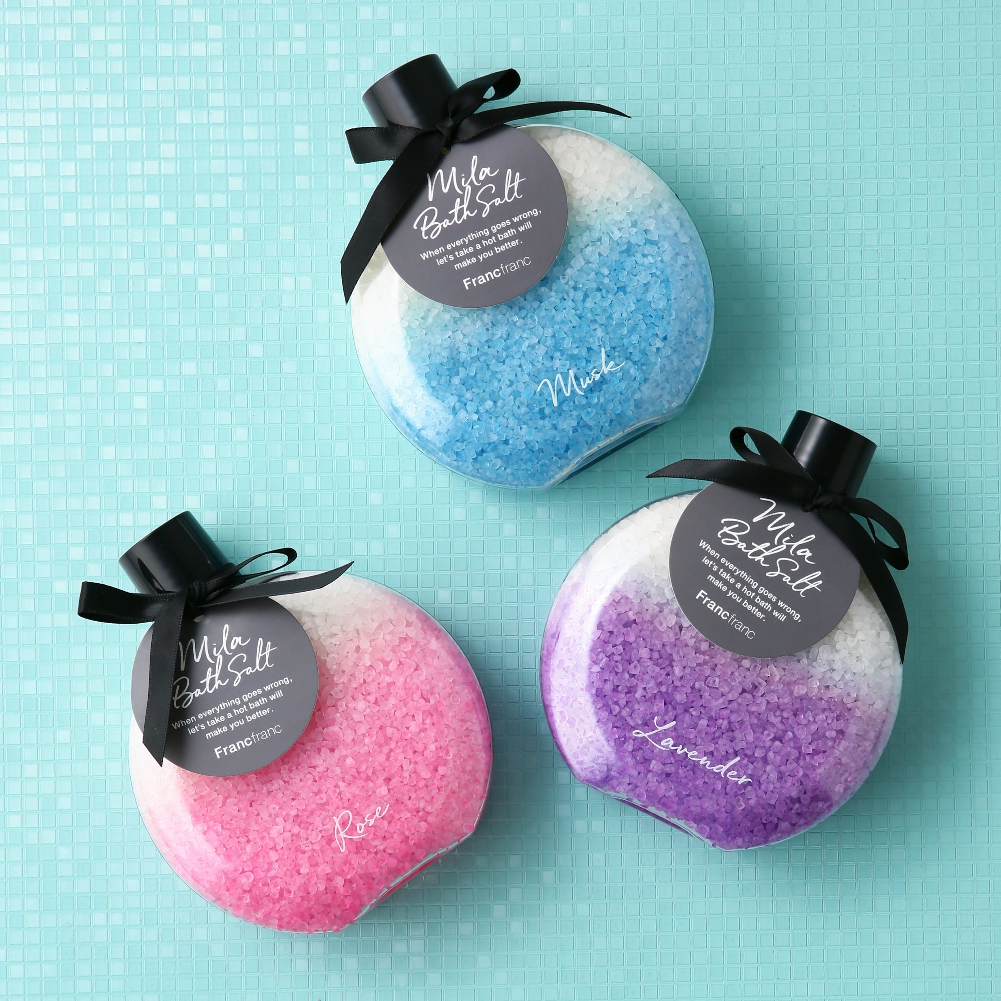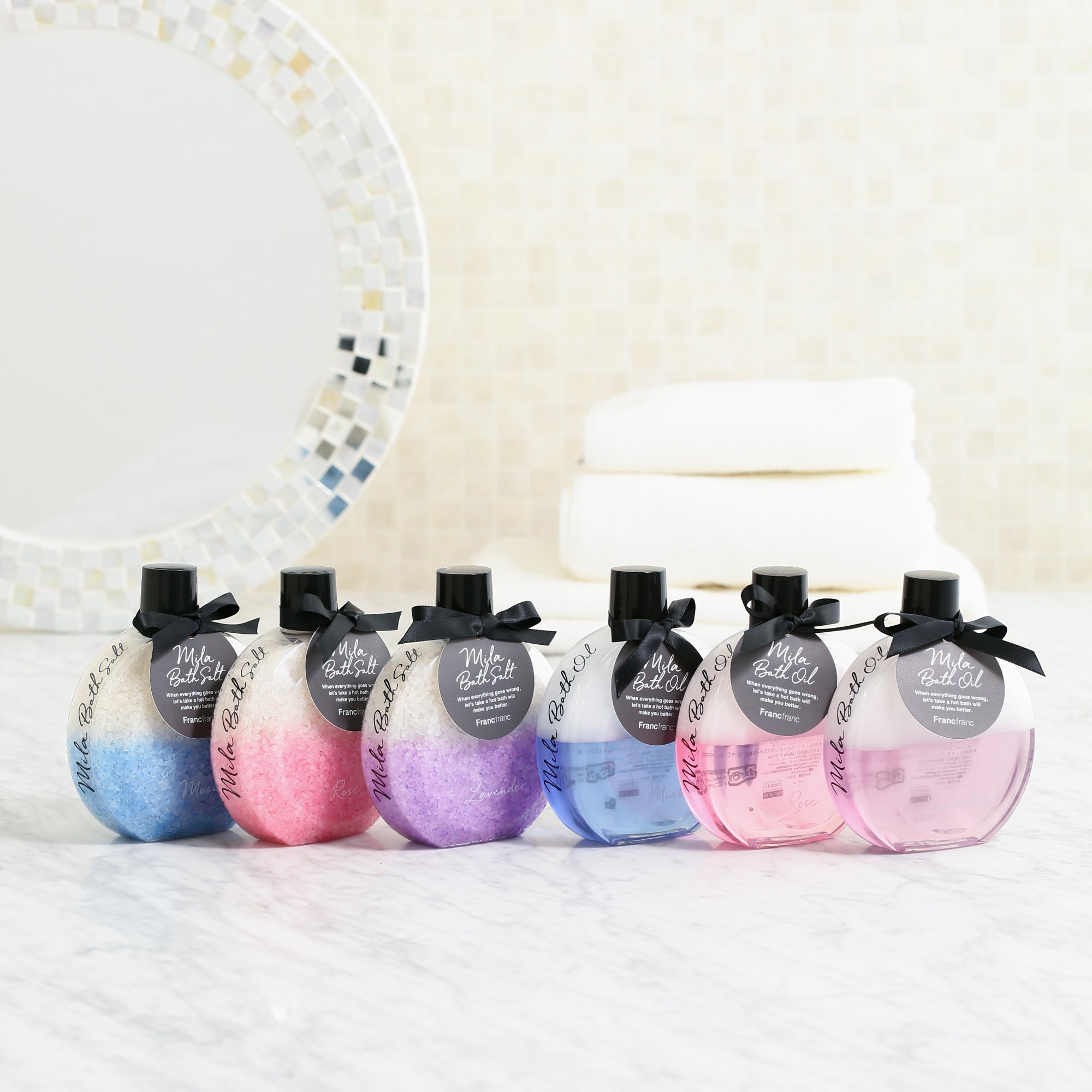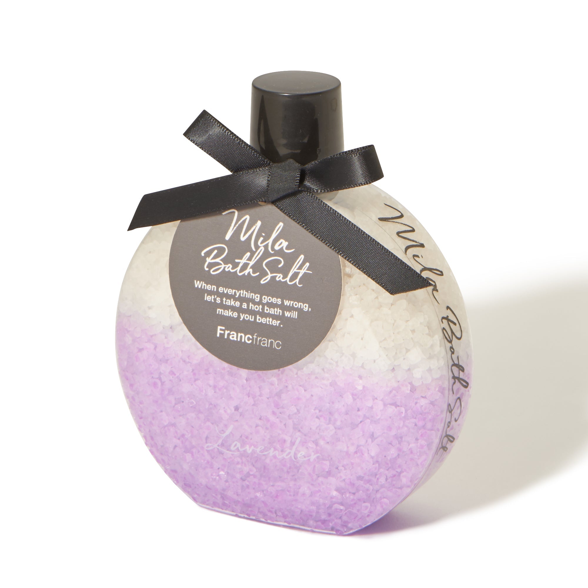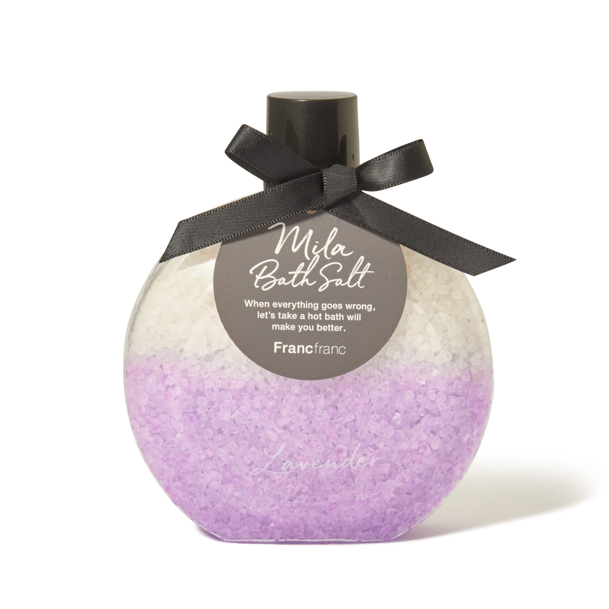 ※この商品は入浴剤です。食べ物ではありません。まるでカラーセラピーのボトルのようなカラーが美しいバスソルトです。香水瓶をイメージしたボトルは、インテリアとして飾りたくなる可愛さです。お洒落なボトルと乳白色とパープルの美しいグラーデーションが相まって、見るたび気分が上がるバスソルトに仕上がっています。ギフトにも喜ばれるアイテムです。バスソルト名のMilaとはドイツ語で〝羨望〟という意味。バスタブに入れた瞬間乳白色に変化し、バスルームいっぱいに上品なラベンダーの香りが広がります。【使用目安】浴槽のお湯(約200L)に1回当たり約50g(約8回分)を入れ、よくかき混ぜてからご入浴ください。ローズ・ラベンダー・ムスクの3種類の香りを用意しており、お好きな香りをお楽しみいただけます。その日の気分に合わせてチョイスするのもおすすめ。