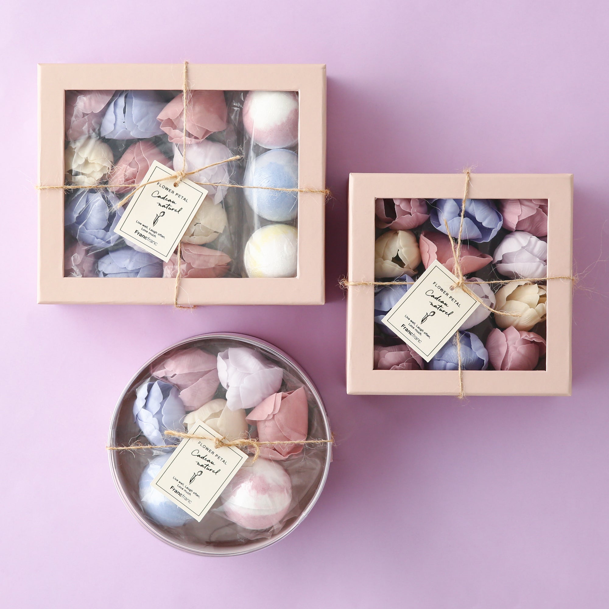 チューリップのブーケをイメージした入浴剤セットです。いつものバスタイムを、より一層癒やしの時間に。落ち着きあるマルチカラーなので、ドレッサーや玄関、チェストなどに飾って目で見て楽しむのもおすすめです。 ご自宅用にはもちろん、シンプルで可愛らしい物が好きな方へのギフトとしても最適です。柔らかい印象を与えるラウンド型のボックス内には、マーブル柄のバスフィズとチューリップブーケをイメージしたバスペタルが入っています。 ボックスのサイズは、幅14.5✕奥行き14.5✕高さ8cmです。バスフィズ(約幅5✕高さ5cm) チューリップブーケをイメージしたバスペタル(約幅4✕高さ6.5cm)バスペタルは、ホワイト・ブルー・ピンク・イエローの4色展開。 どのカラーのバスペタルも、チューリップの香りがします。 泡風呂を楽しむことができる入浴剤のため、リッチな気分になれます。 使用方法は浴槽に半分ほどお湯をはり、花びらに勢いよくシャワー当てるだけと、とっても簡単です。 泡の上に花びらを浮かべることもできます。マーブル柄のバスフィズは、ピンクとブルーの2色展開。 ピンクはピオニーの香りがし、ブルーはバイオレットの香りを楽しめます。 使用する際は透明フルムを外し、浴槽のお湯(約200L)に対してバスフィズ1個を入れ、よくかき混ぜてから入浴してください。◆バスフィズピンク:ピオニーの香り◆バスフィズブルー:バイオレットの香り◆フラワーバスペタル:チューリップの香り<ご使用方法>・バスフィズ:透明フィルムを外して浴槽のお湯(約200L)に1個入れ、よくかきまぜてご入浴ください。・バスペタル:浴槽に半分ほどお湯をはり、花びらの上から勢いよくシャワーをあてると泡風呂になります。花びらを浮かべたい場合は、泡の上に浮かべてください。サイズW145×D145×H80mm素材バスフィズ:炭酸水素Na、クエン酸、三リン酸5Na、硫酸Na、香料、セルロースガム、PEG-8、安息香酸デナトニウム、赤102、赤218、黄4、青1フラワーバスペタル:ラウリル硫酸Na、加水分解コーンスターチ、ポリビニルアルコール、コカミドプロピルベタイン、水、グリセリン、セテアリルアルコール、香料、パルミチン酸イソプロピル、メチルパラベン、プロピルパラベン、赤2,赤102、黄4、黄5、紫401カラーPK品番 1105030033291 全国一律550円(税込)です。雑貨の商品金額合計が5,000円(税込)以上の場合、送料無料で配送いたします。※手数料、ラッピング料、付帯サービス料は含みません。※新生活期・年末年始は出荷や配送の繁忙期となるため、日時指定をいただいてもご希望日時通りお届け出来ないことがございます。■食べ物ではありません。■お肌に異常が生じていないかよく注意して使用してください。化粧品がお肌に合わないとき即ち次のような場合には、使用を中止してください。そのまま化粧品類の使用を続けますと、症状を悪化させることがありますので、皮膚科専門医等にご相談されることをおすすめします。 (1)使用中、赤味、はれ、かゆみ、刺激、色抜け (白斑等)や黒ずみ等の異常があらわれた場合 (2)使用したお肌に、直射日光があたって上記のような異常があらわれた場合■直射日光の当たる場所、極端な高温・低温の場所を避けて保管してください。■ペットやお子さまの手の届かないところで、ご使用・保管してください。■24時間風呂等機種によっては使用できないお風呂もあります。■お使いのお風呂の機種の説明書をご確認の上、ご使用ください。■残り湯は洗濯に使用できません。■入浴後は速やかに排水し、洗い流してください。■色や香りに変化が生じることがありますが、品質に問題ありません。■本品は誤食防止のため、口に入ったとき苦味を感じる仕様となっております。■原産国:中国