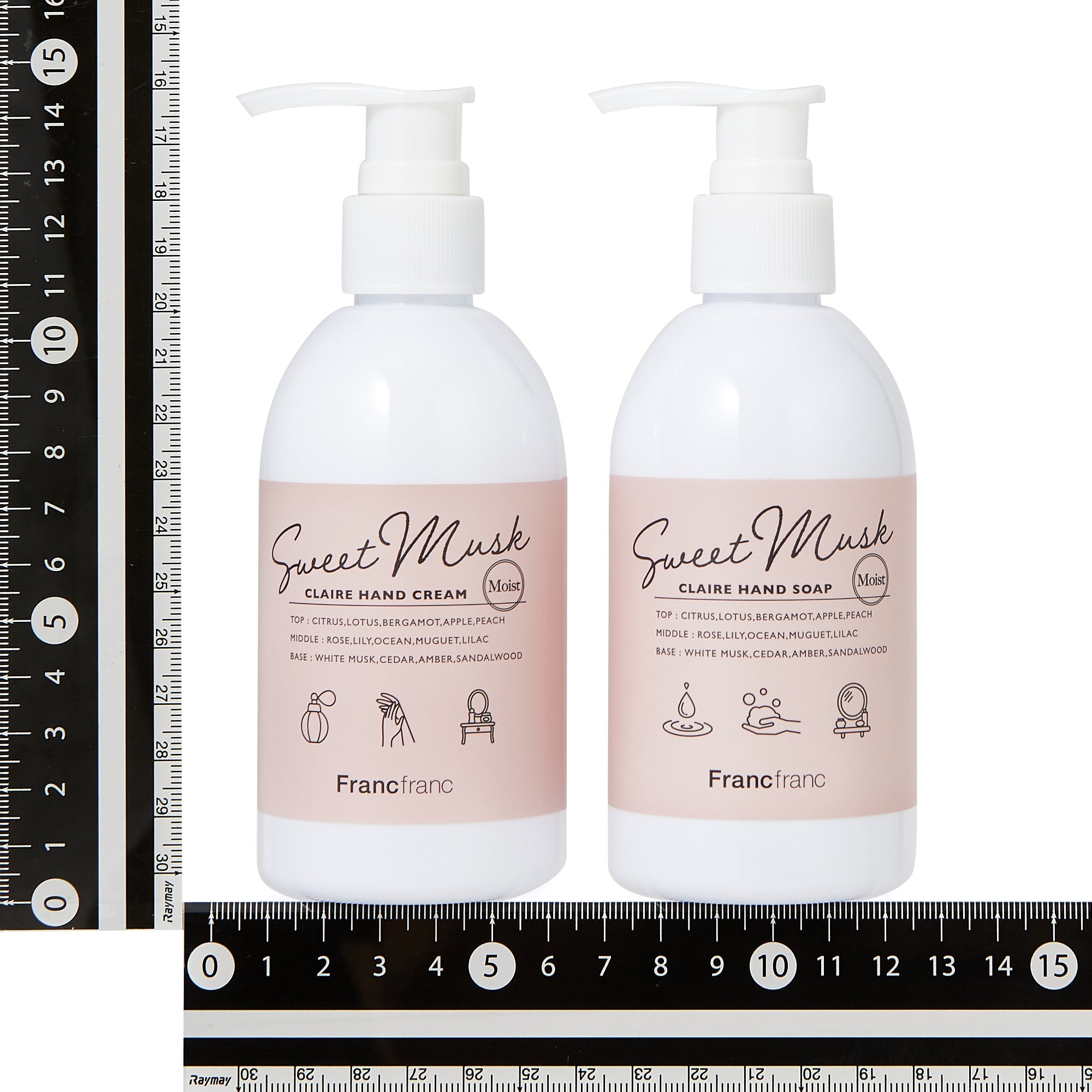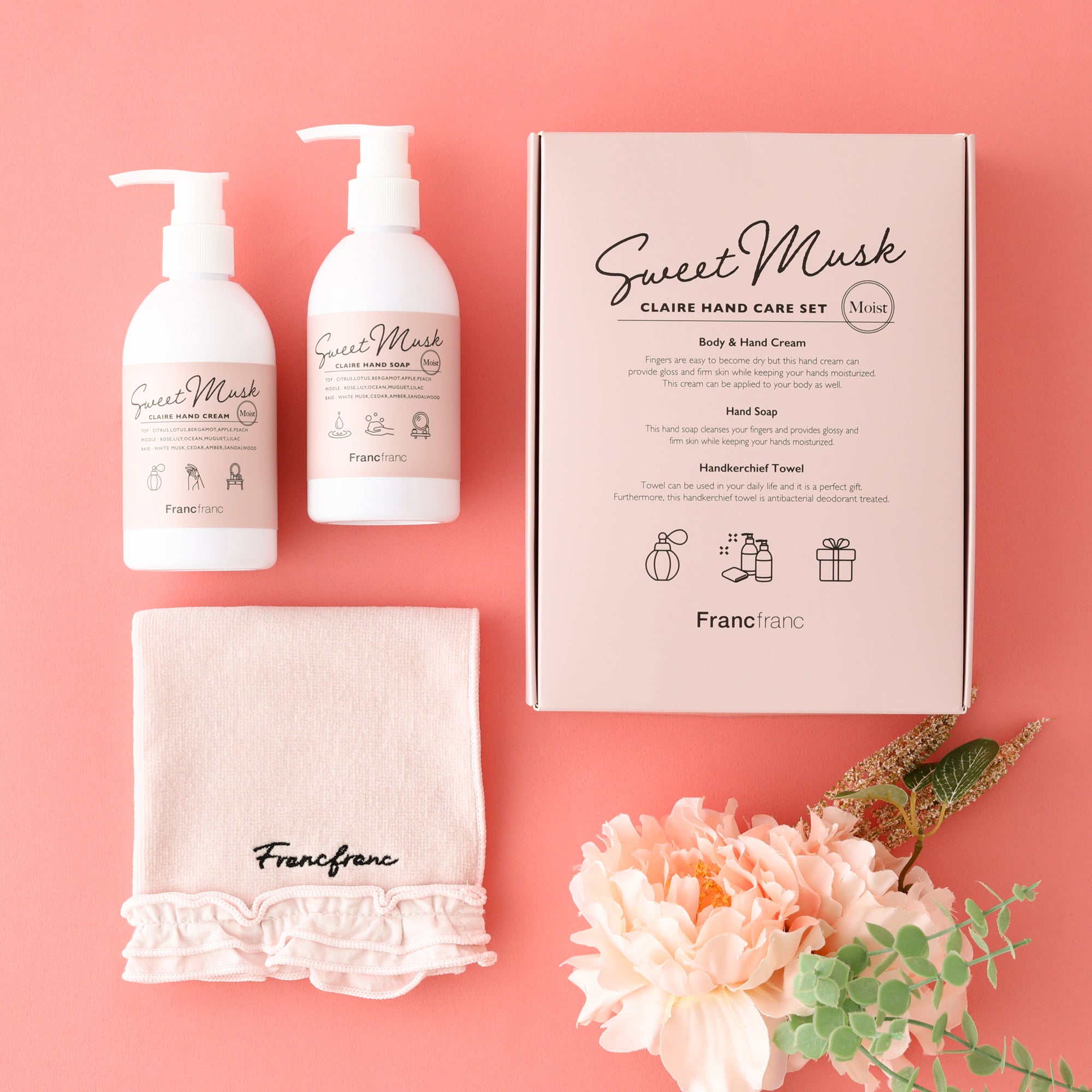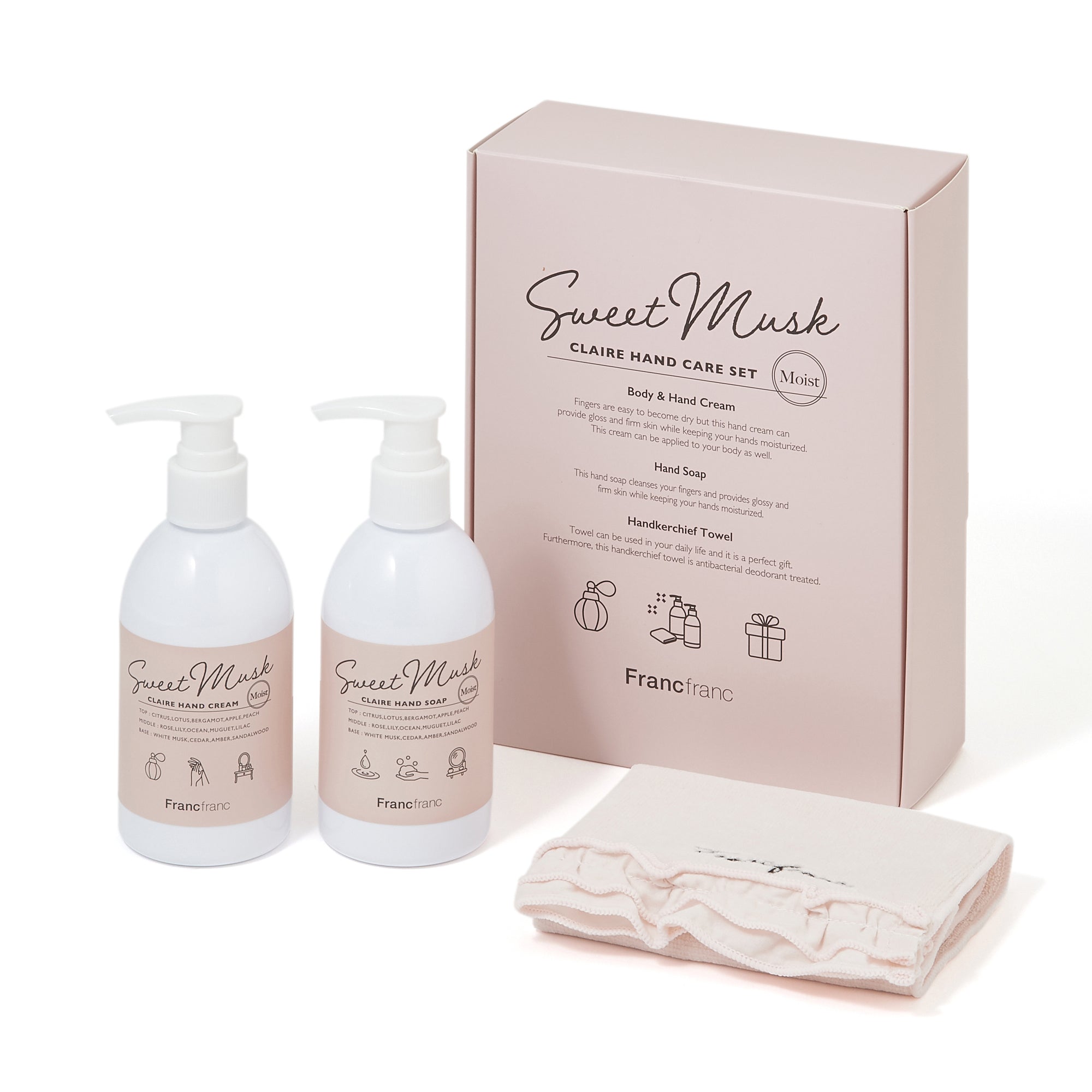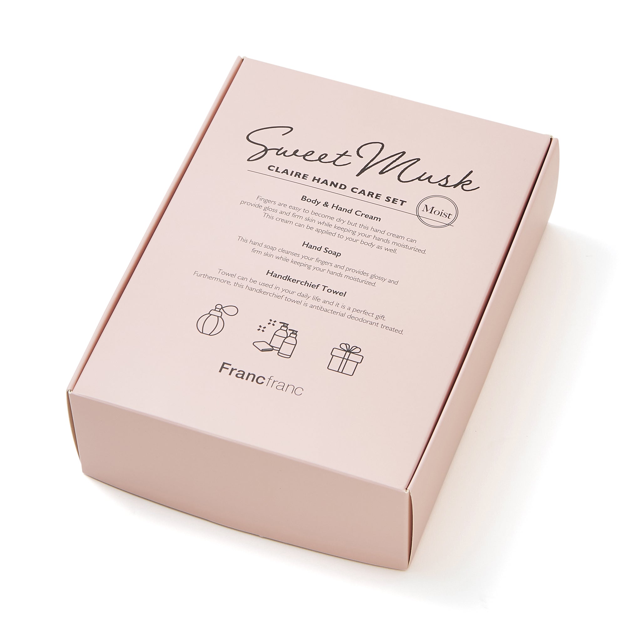 【期間限定】新生活応援 NEW LIFEキャンペーン対象のボディケア・フレグランス商品を2点以上購入すると表示価格から20%OFF!※キャンペーン期間:2024年4月19日(金)9:59 まで※カートに2点以上商品を入れると自動的に値引き額が表示されます。人気のクレアシリーズのハンドケアのギフトセットです。ハンドソープ、ハンカチ、ハンドクリームのセットで、この1つで「手を洗う」「拭く」「保湿する」までが可能です。1つでボリュームのあるギフトをお渡しできます。クレアの香りが好き、スウィートなテイストが好きな方におすすめです。◆ハンドソープ:スウィートムスクの香り◆ハンドクリーム:スウィートムスクの香り◆ハンカチ:抗菌防臭仕様サイズW58×D55×H140mm 容量:ハンドクリーム200g、ハンドソープ200ml素材ハンドクリーム:<成分>水ミネラルオイル、セテアリルアルコール、グリセリン、ステアリン酸、ステアリン酸PEG-100、香料、ステアリン酸グリセリル、フェノキシエタノール、カルボマー、クロルフェネシン、ホホバ脂、ハマナス花エキス、アロエベラ葉エキス、アルガニアスピノサ核油、シア脂油、ハチミツエキス、EDTA-2Na、水酸化Naハンドソープ:<成分>水、ラウレス硫酸Na、コカミドプロピルベタイン、塩化Na、コカミドメチルMEA、香料、ベンザルコニウムクロリド、EDTA-2Na、クエン酸、ホホバ脂、ハマナス花エキス、アロエベラ葉エキス、アルガニアスピノサ核油、シア油脂、ハチミツエキス、硝酸Mg、メチルクロロイソチアゾリノン、塩化Mg、メチルイソチアゾリノンタオル本体:コットン100%重量0.24 kgカラーPK品番 1105030038197 全国一律550円(税込)です。雑貨の商品金額合計が5,000円(税込)以上の場合、送料無料で配送いたします。※手数料、ラッピング料、付帯サービス料は含みません。※新生活期・年末年始は出荷や配送の繁忙期となるため、日時指定をいただいてもご希望日時通りお届け出来ないことがございます。<ハンドクリーム・ハンドソープ>■食べ物ではありません。■お肌に異常が生じていないかよく注意して使用してください。お肌に合わないとき即ち次のような場合には、使用を中止してください。そのまま使用を続けますと、症状を悪化させることがありますので、皮フ科専門医等にご相談されることをおすすめします。(1)使用中、赤み、はれ、かゆみ、刺激、色ぬけ(白斑等)や黒ずみ等の異常現れた場合(2)使用したお肌に、直射日光が当たって上記のような異常が現れた場合■傷やはれもの、しっしん等、異常のある部位にはお使いにならないでください。■目に入らないようご注意ください。万が一目に入った場合は、すぐに真水で洗い流して医師の手当てを受けてください。■気温の変化により粘質が変わること等がありますが、使用には問題ありません。■お子様やペットの手の届かないところで使用・保管してください。■顔や目まわり等、用途以外の部分には使用しないでください。■開封後はなるべく早めにご使用ください。<ハンカチ>■直射日光やライトに長時間照らされると変色することがあります。■素材の特性上、毛羽立ち、毛羽落ち、パイル抜けが生じます。■初め数回のお洗濯には柔軟剤の使用はお避けください。■濃色のものは、摩擦やお洗濯により色落ちや色移りが生じます。■濡れた状態で長時間放置しないでください。■くず取りネットと洗濯ネットを併用し単独洗いをしてください。■お洗濯により多少縮みます。漂白の際は酸素系漂白剤を使用してください。■タンブル乾燥は避け形を整えて陰干ししてください。■特性上、糸が飛び出したりしますので引っ張ったり、引っ掛けたりしないでください。■生地端や装飾部分を強く引っ張らないでください。■抗菌・防臭作用は、永続的な効果ではありません。■原産国:中国