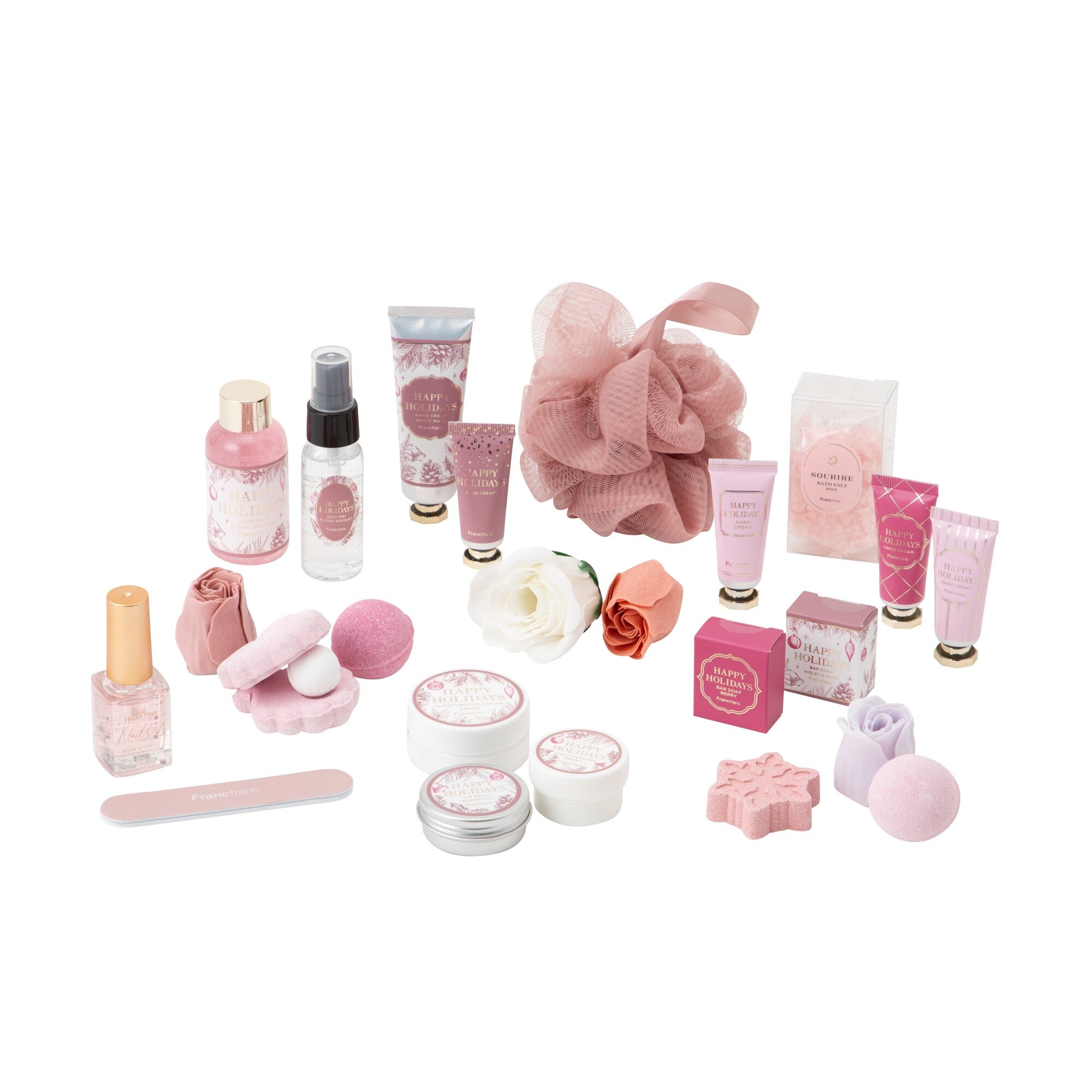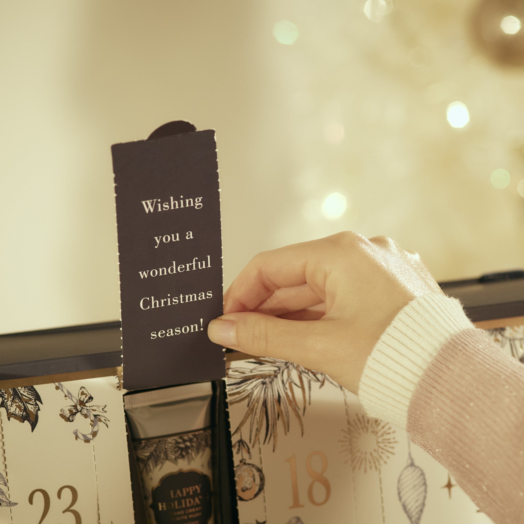 Francfrancが2024年のクリスマスに贈る、スペシャルなアドベントカレンダーです。 心躍るオリジナルデザインのボックスには理想の自分に近づくためのセルフケアアイテムがぎっしり。クリスマスまでの24日間、どんなアイテムに出会えるのか毎日どきどきしながらカウントダウンを楽しめます。 Mタイプはバリエーション豊かな香りやアイテムを幅広く取り揃えました。人気のハンドクリームやリップバーム、入浴剤やソープなど、Francfrancのアイテムに囲まれたお部屋で自分磨きをしながらクリスマスをお迎えください。 クリスマス気分を盛り上げるパッケージをお部屋にディスプレイすれば、ホリデーシーズンがより一層楽しく華やかに。年に一度の特別な時間をぜひFrancfrancと一緒に過ごしてみて。 ■セット内容 1 ハンドクリーム(内容量:5g) 2 バスペタル(内容量:3.5g) 3 固形石鹸(内容量:20g) 4 ボディスポンジ 5 ハンドソープ(内容量:50ml) 6 ハンドクリーム(内容量:5g) 7 スノーフレーク(内容量:15g) 8 ネイルファイル(爪やすり) 9 固形石鹸(内容量:20g) 10 リップバーム(内容量:10g) 11 バスペタル(内容量:3.5g) 12 ハンドクリーム(容量:30ml) 13 バスボール(内容量:20g) 14 バスソルト(内容量:50g) 15 ボディミスト(内容量:30ml) 16 ハンドクリーム(内容量:5g) 17 バスペタル(内容量:3.5g) 18 ハンドクリーム(内容量:5g) 19 バスボール(内容量:20g) 20 練り香水(内容量:10g) 21 バスペタル(内容量:10g) 22 シェルフィズ(内容量:40g) 23 保湿クリーム(内容量:20g) 24 ネイルオイル(内容量:12ml)