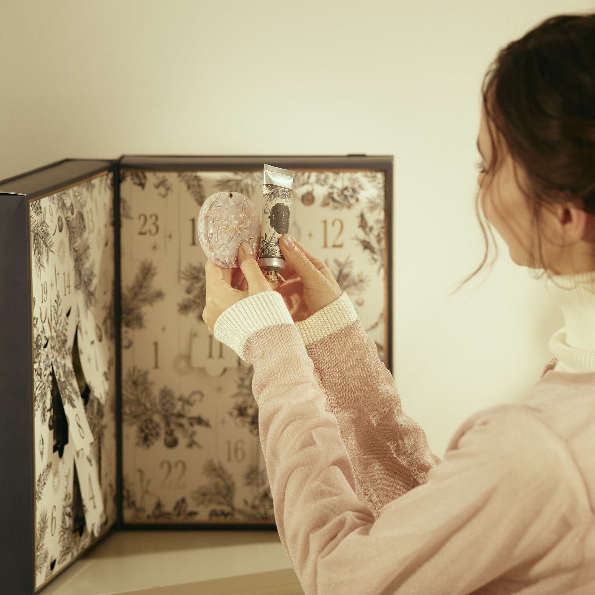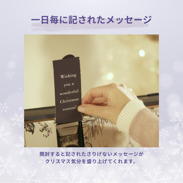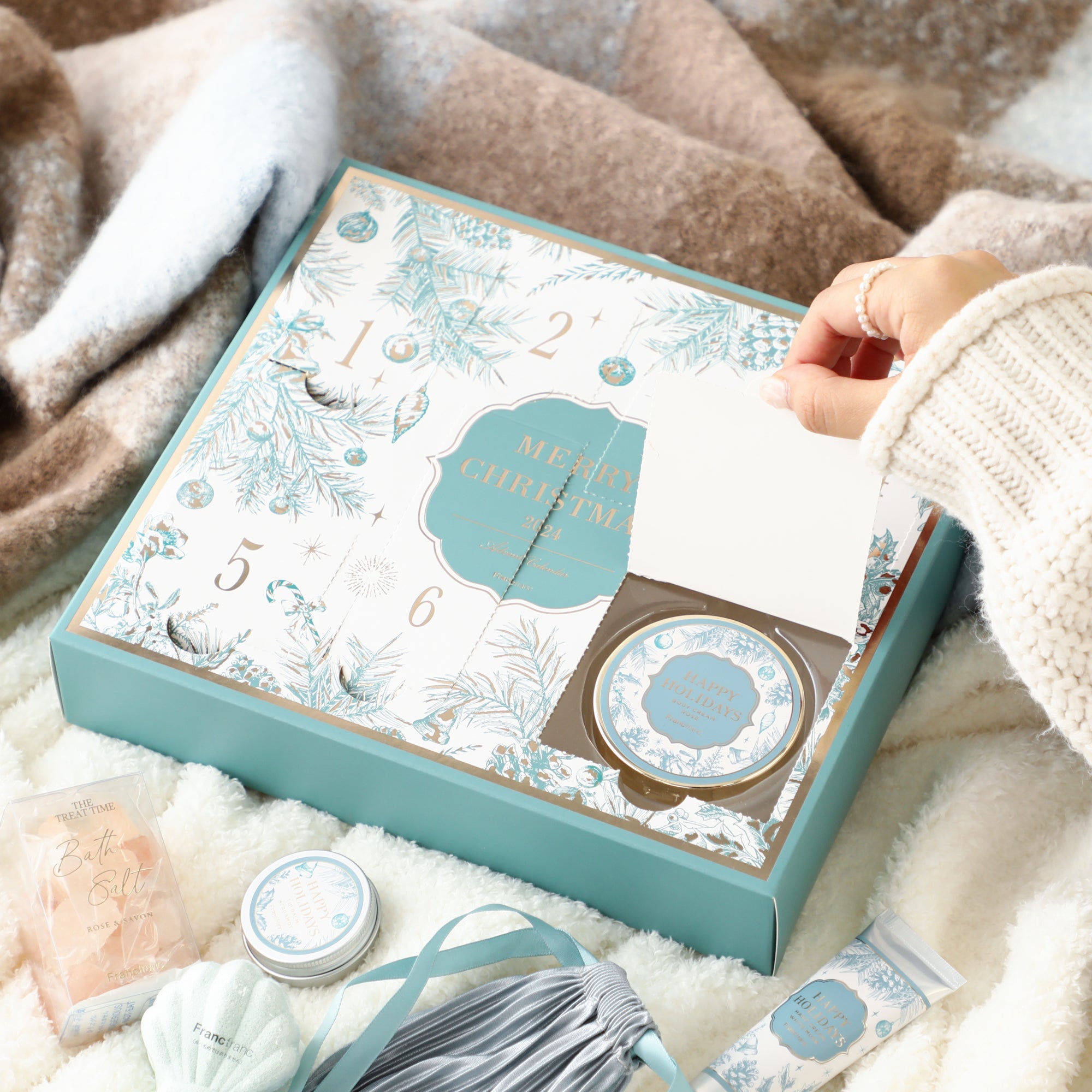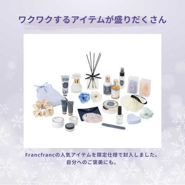 Francfrancが2024年のクリスマスに贈る、スペシャルなアドベントカレンダーです。 心躍るオリジナルデザインのボックスには人気のハンドクリームやリップバームなどボディケアアイテムがぎっしり。クリスマスまでの7日間、どんなアイテムに出会えるのか毎日どきどきしながらカウントダウンを楽しめます。 Sタイプは7日分のコンパクトサイズだから初めてアドベントカレンダーを買う方やちょっとしたクリスマスギフトにもおすすめです。 クリスマス気分を盛り上げるパッケージをお部屋にディスプレイすれば、ホリデーシーズンがより一層楽しく華やかに。年に一度の特別な時間をぜひFrancfrancと一緒に過ごしてみて。 ■セット内容 1 バスソルト(内容量:90g) 2 リップバーム(内容量:10g) 3 ポーチ 4 ネイルオイル(内容量:9ml) 5 シェルフィズ(内容量:40g) 6 ハンドクリーム(内容量:30ml) 7 ボディクリーム(内容量:50ml)