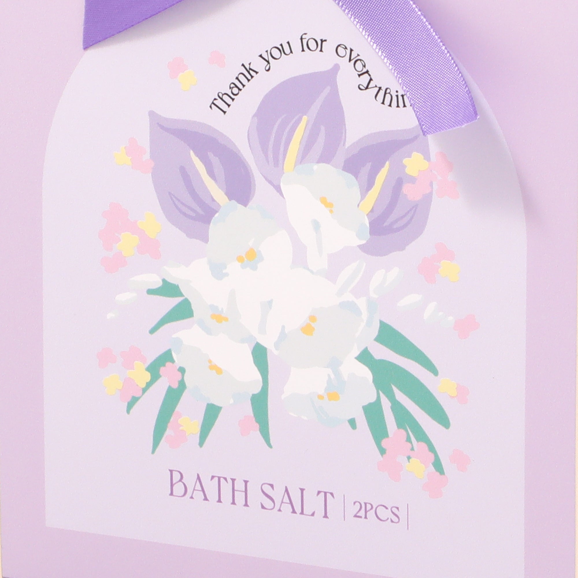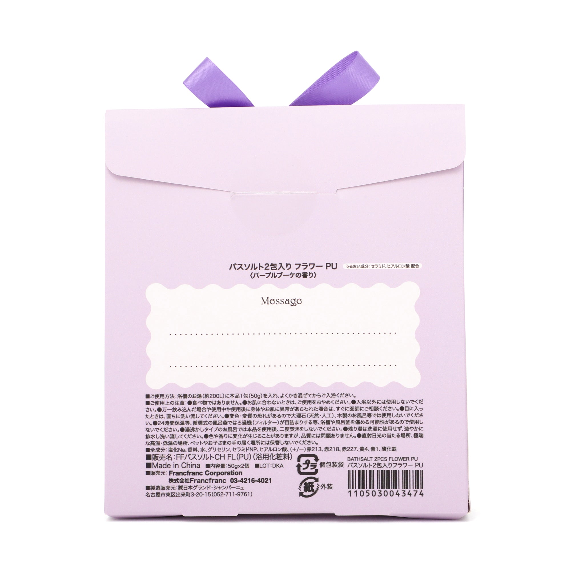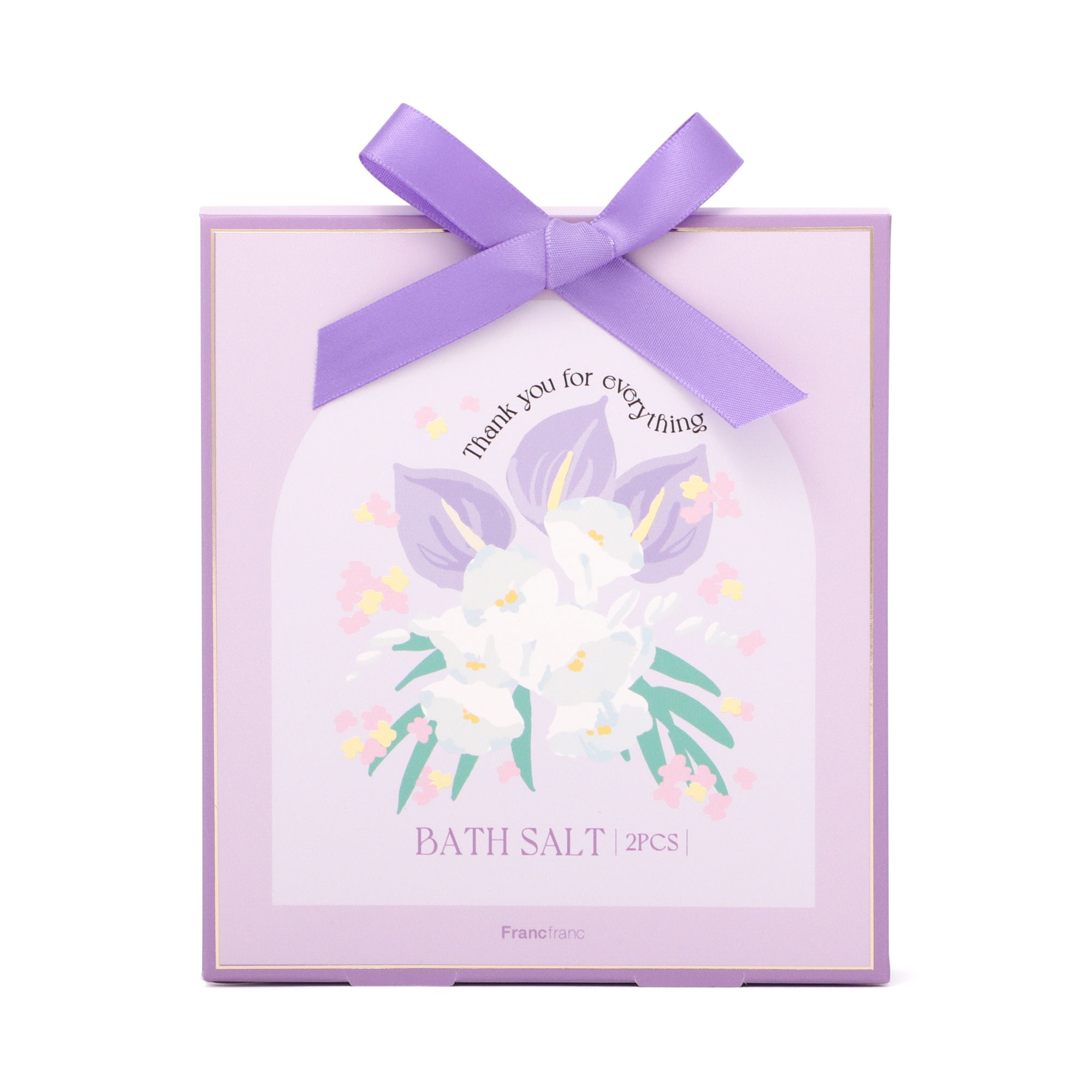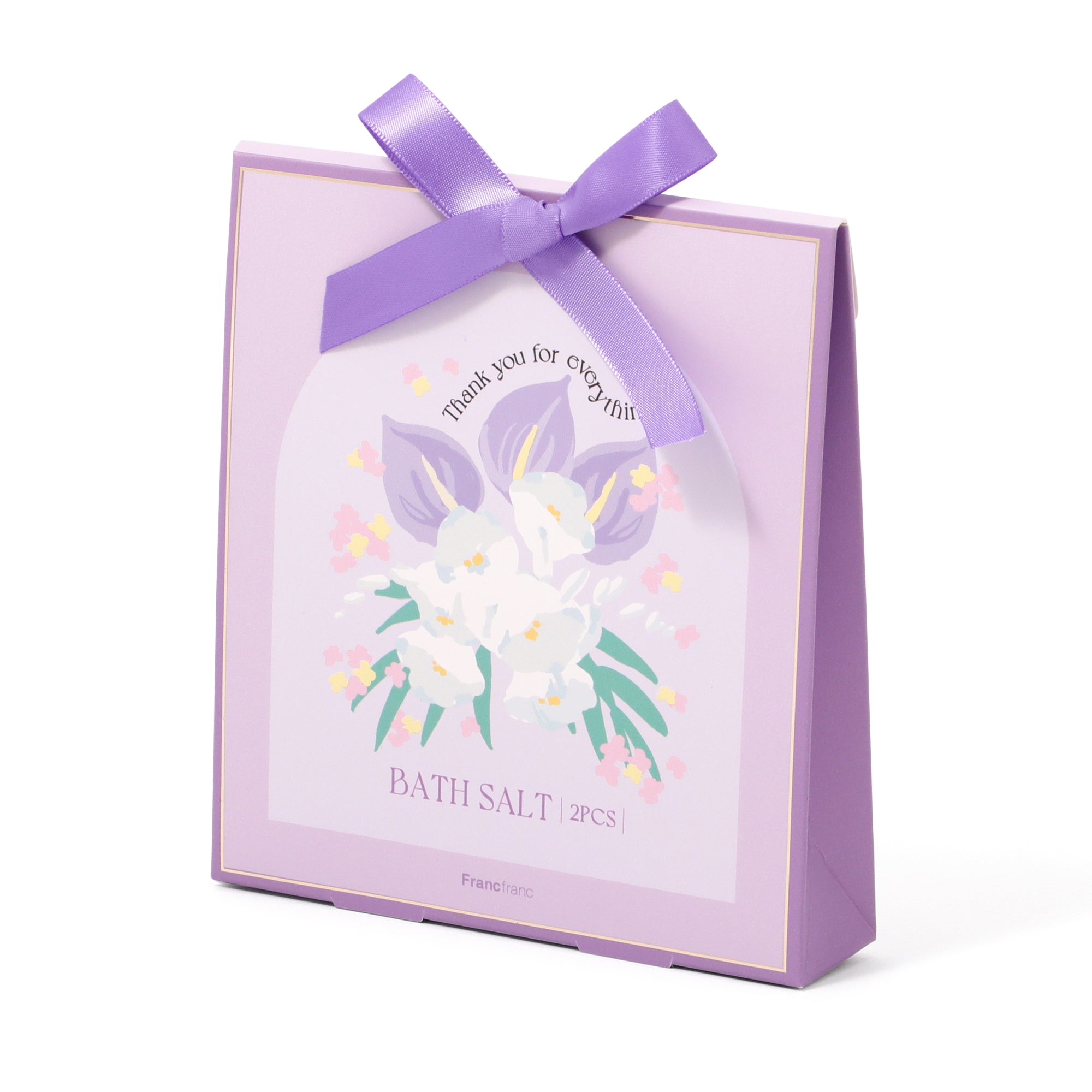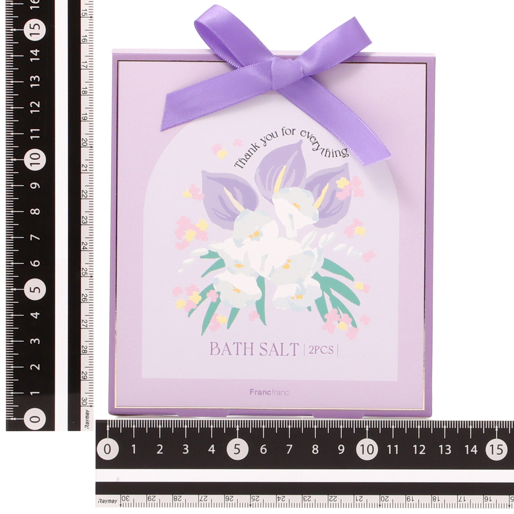 花束をデザインしたパッケージが可愛いバスソルトです。いつもお世話になっているあの人へ日頃の感謝の気持ちを伝えるなら保湿成分配合の入浴剤がおすすめ。華やかなパープルブーケの香りでバスタイムをより一層お楽しみいただけます。おしゃれで気の利いたばらまきギフトにもぴったりのアイテムです。使用方法:浴槽のお湯(約200L)に対して本品1包を入れ、よくかき混ぜてから入浴してください。