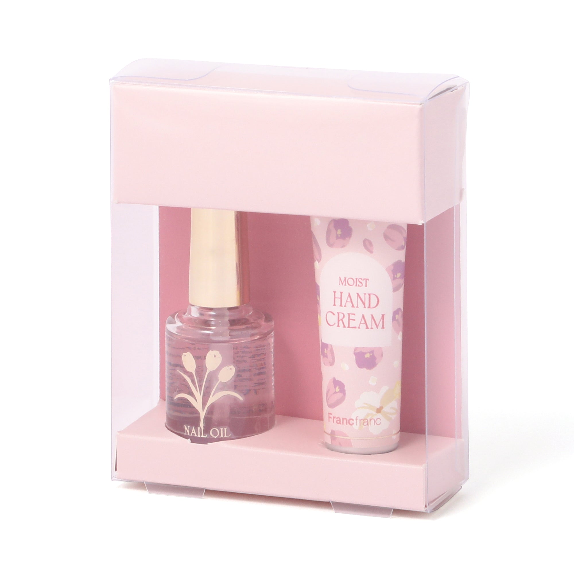 保湿成分配合のネイルオイルとハンドクリームのセットです。華やかなピンクブーケの香りでリラックスタイムをお過ごしいただけます。おしゃれで気の利いたばらまきギフトにもぴったりのアイテムです。