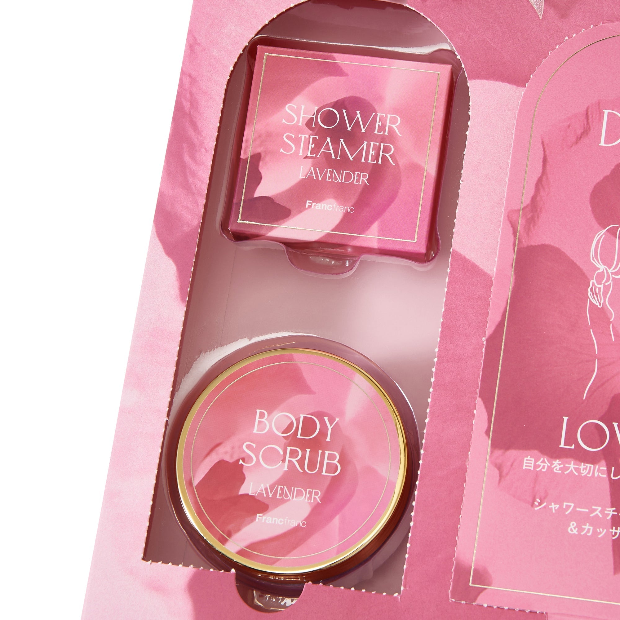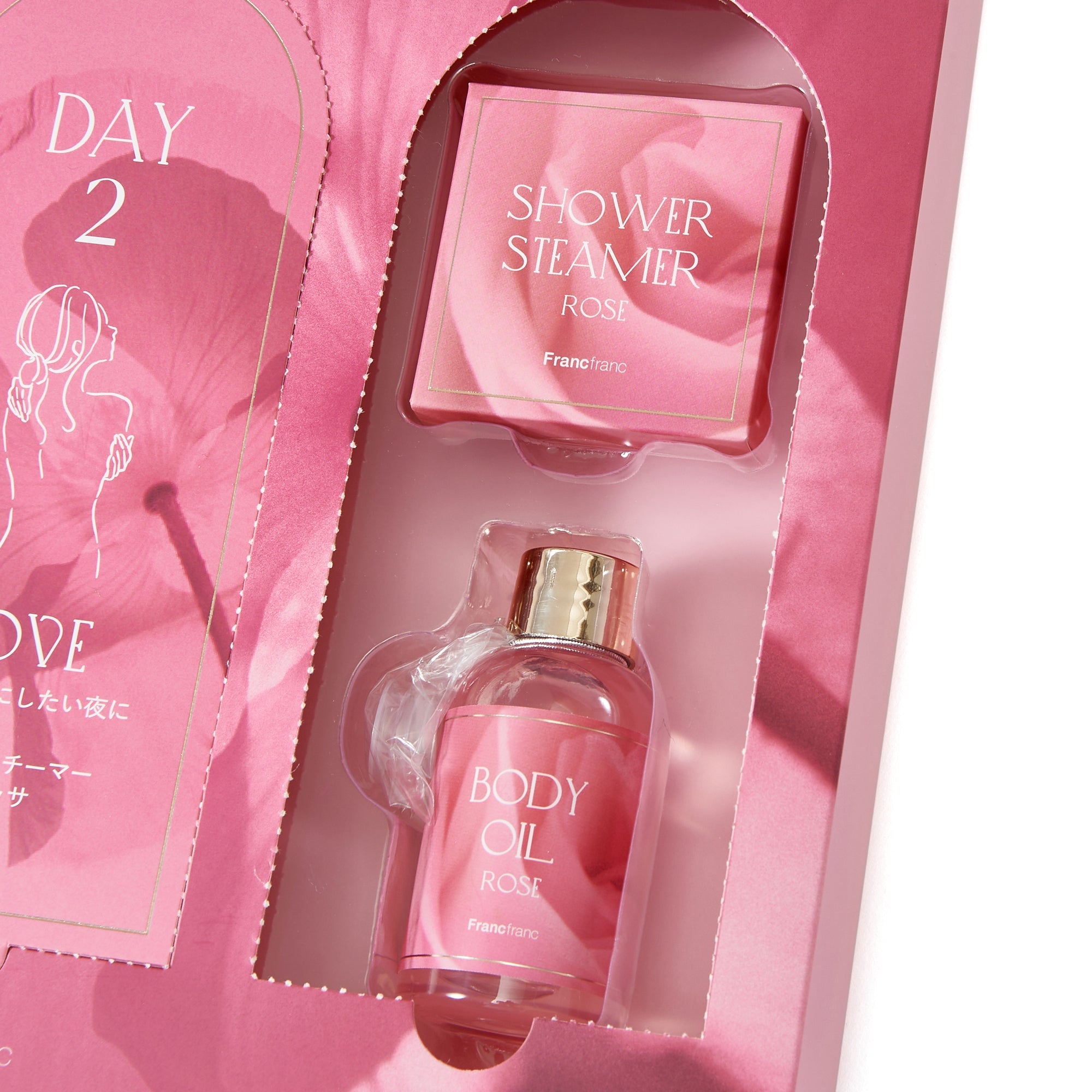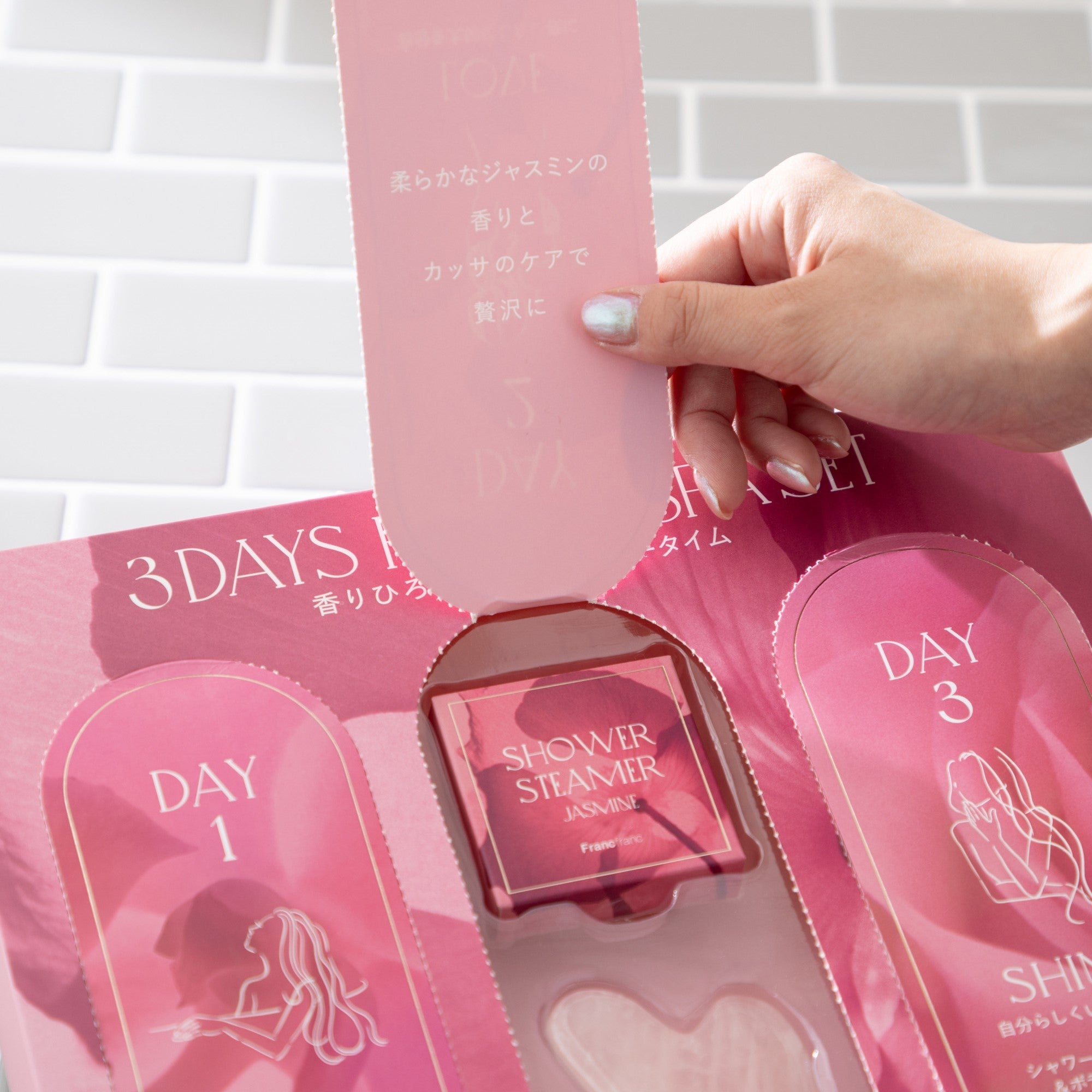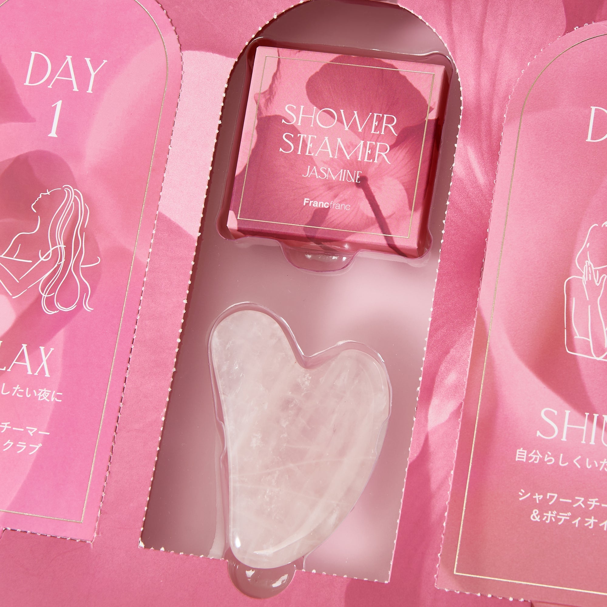 3日間日替わりでシャワースチーマーを楽しめるボディケアセットです。シャワースチーマーとは、シャワータイムに使うアロマグッズのこと。お風呂場の床に置いてお湯をかけるとアロマの豊かな香りがスチーム(蒸気)となってバスルームを満たし、夏場はお湯に浸からないという方も香り広がる贅沢なシャワータイムを楽しめます。浴槽に入れて入浴剤として使用することもできますので、お好みに合わせてお使いください。心躍る日めくり式のパッケージは大切な方へのギフトにもぴったりです。セット内容Day1:RELAX(リラックスしたい夜に)・シャワースチーマー(ラベンダーの香り)・ボディスクラブ(ラベンダーの香り)Day2:LOVE(自分を大切にしたい夜に)・シャワースチーマー(ジャスミンの香り)・カッサDay3:SHINE(自分らしくいたい夜に)・シャワースチーマー(ローズの香り)・ボディオイル(ローズの香り)