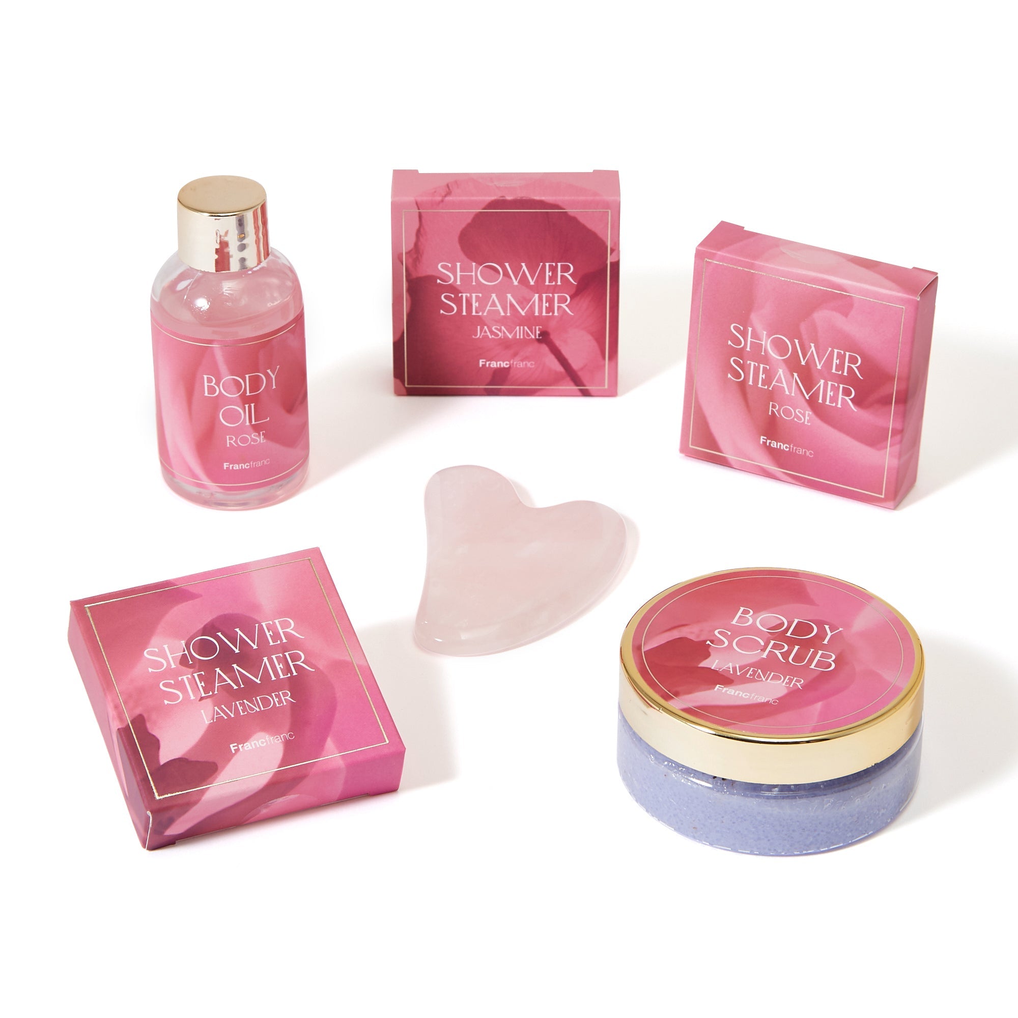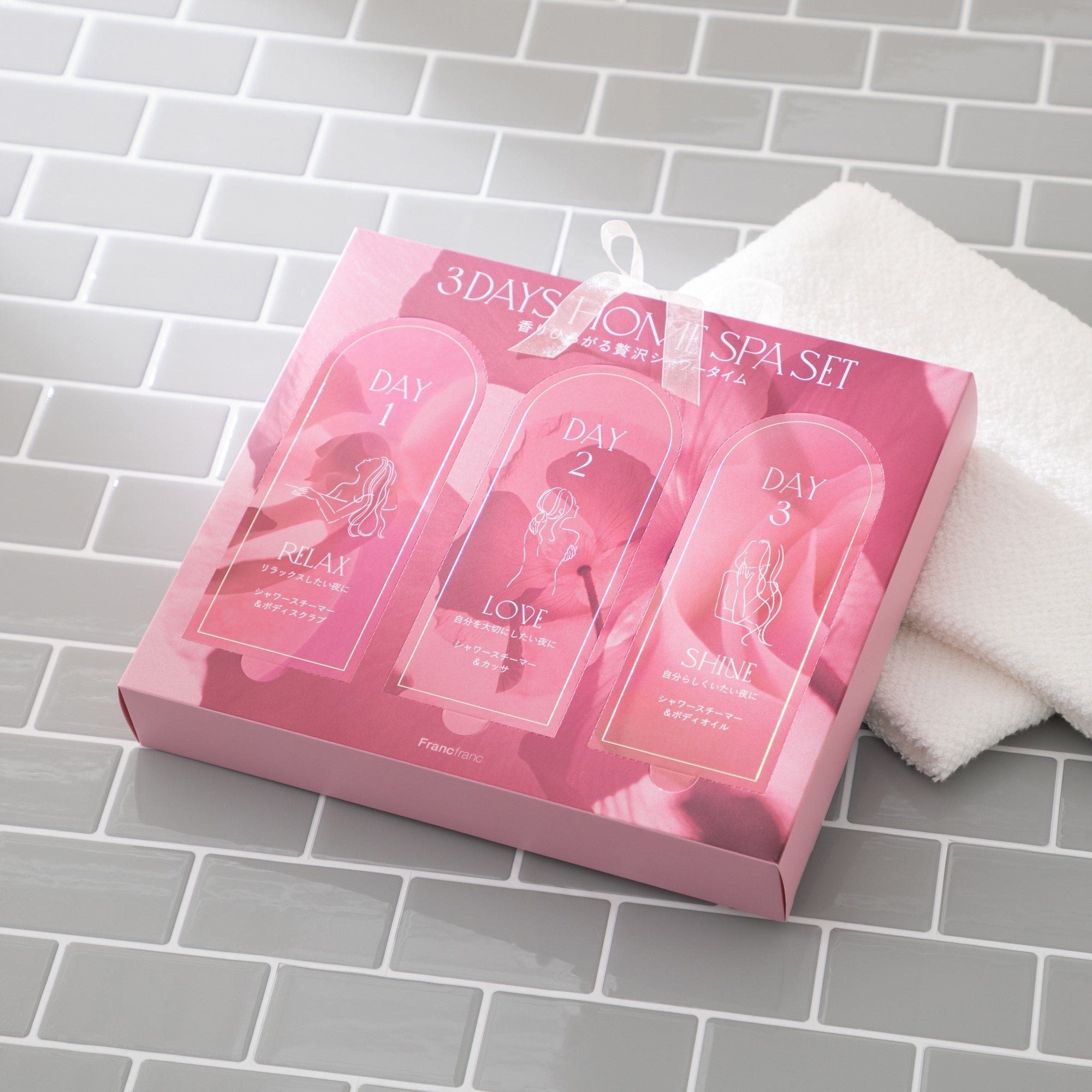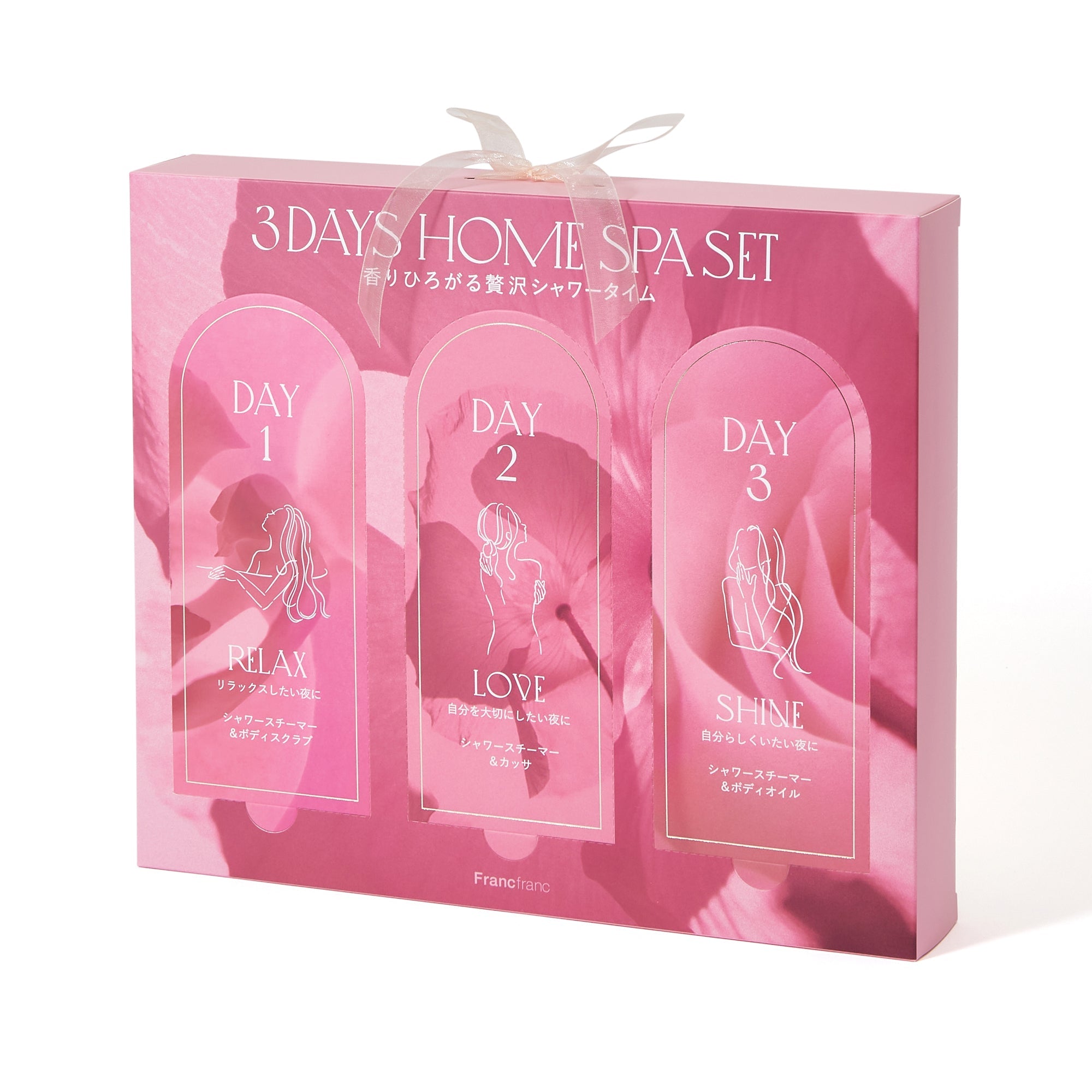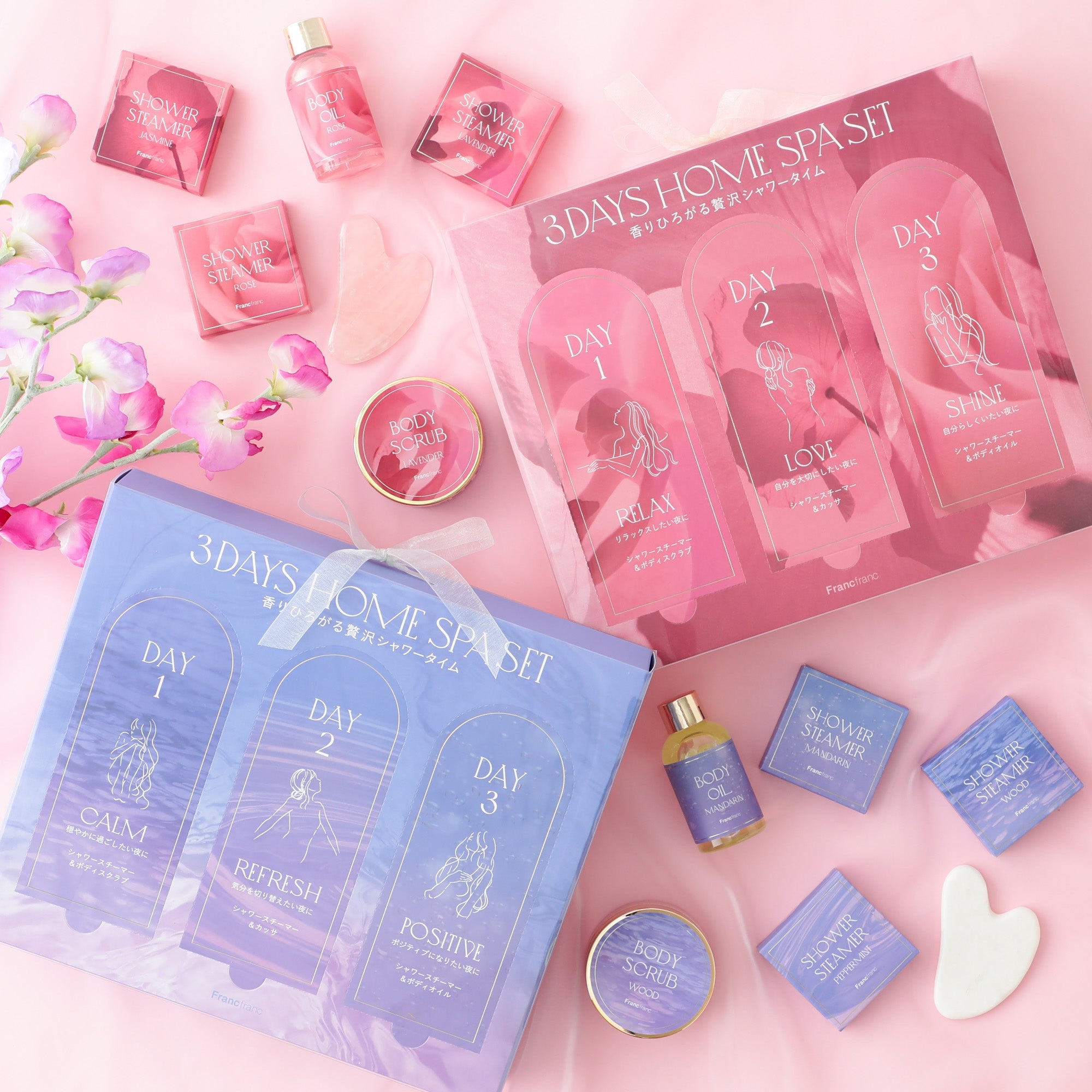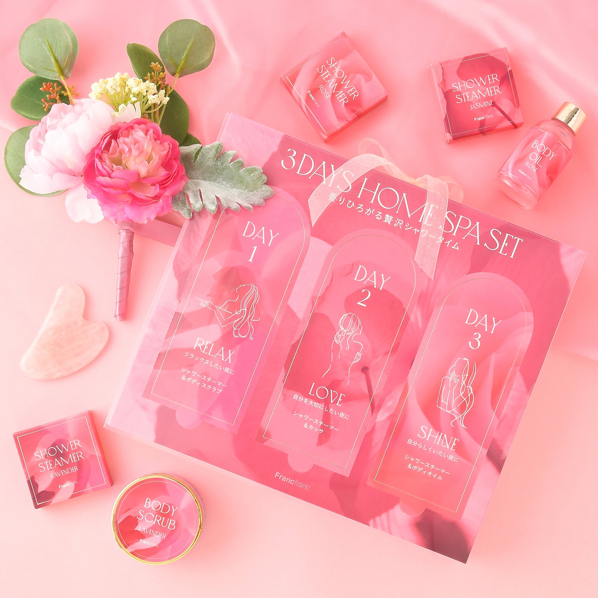 3日間日替わりでシャワースチーマーを楽しめるボディケアセットです。シャワースチーマーとは、シャワータイムに使うアロマグッズのこと。お風呂場の床に置いてお湯をかけるとアロマの豊かな香りがスチーム(蒸気)となってバスルームを満たし、夏場はお湯に浸からないという方も香り広がる贅沢なシャワータイムを楽しめます。浴槽に入れて入浴剤として使用することもできますので、お好みに合わせてお使いください。心躍る日めくり式のパッケージは大切な方へのギフトにもぴったりです。セット内容Day1:RELAX(リラックスしたい夜に)・シャワースチーマー(ラベンダーの香り)・ボディスクラブ(ラベンダーの香り)Day2:LOVE(自分を大切にしたい夜に)・シャワースチーマー(ジャスミンの香り)・カッサDay3:SHINE(自分らしくいたい夜に)・シャワースチーマー(ローズの香り)・ボディオイル(ローズの香り)