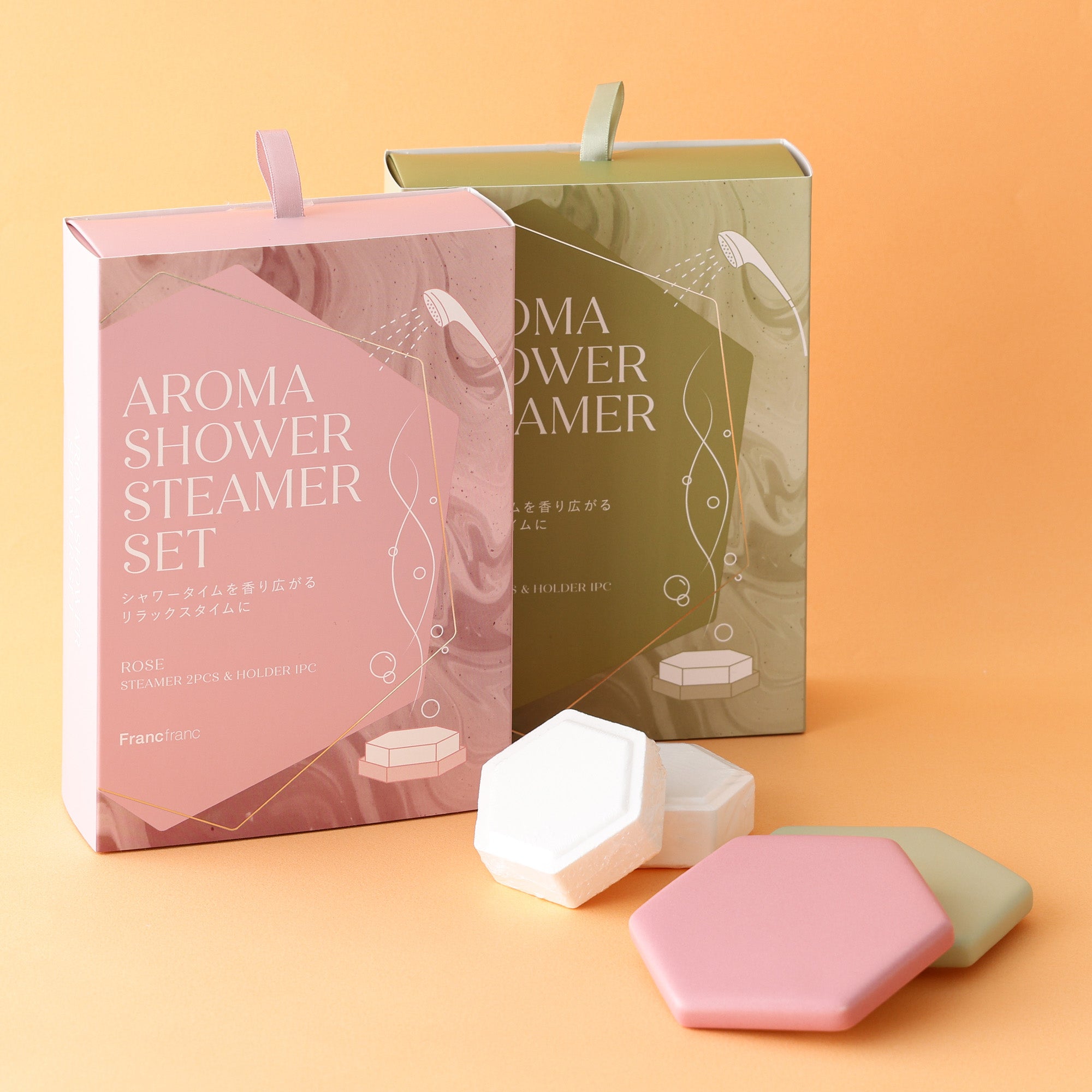 シャワーでも気軽にアロマを楽しめるシャワースチーマー2個と、スチーマーをのせて使用するホルダーのセットです。シャワースチーマーとは、シャワータイムに使うアロマグッズのこと。付属のホルダーの上に置いてお湯をかけるとアロマの豊かな香りがスチーム(蒸気)となってバスルームを満たし、夏場はお湯に浸からないという方も香り広がる贅沢なシャワータイムを楽しめます。※ホルダーを使用せず、そのままお風呂の床に置いても使用可能です。浴槽に入れて入浴剤として使用することもできるので、お好みに合わせてお使いください。華やかなローズの香り【セット内容】シャワースチーマー60g×2個、ホルダー:1枚【使用方法】①梱包材をはがし、シャワースチーマーを直接シャワーのお湯がかからない浴室内の離れた場所で、付属のホルダーの上に設置してご使用ください。②シャワーを1~2秒ほど掛けます。③湯気や床からつたうお湯で少しずつ溶けることで香りを楽しめます。