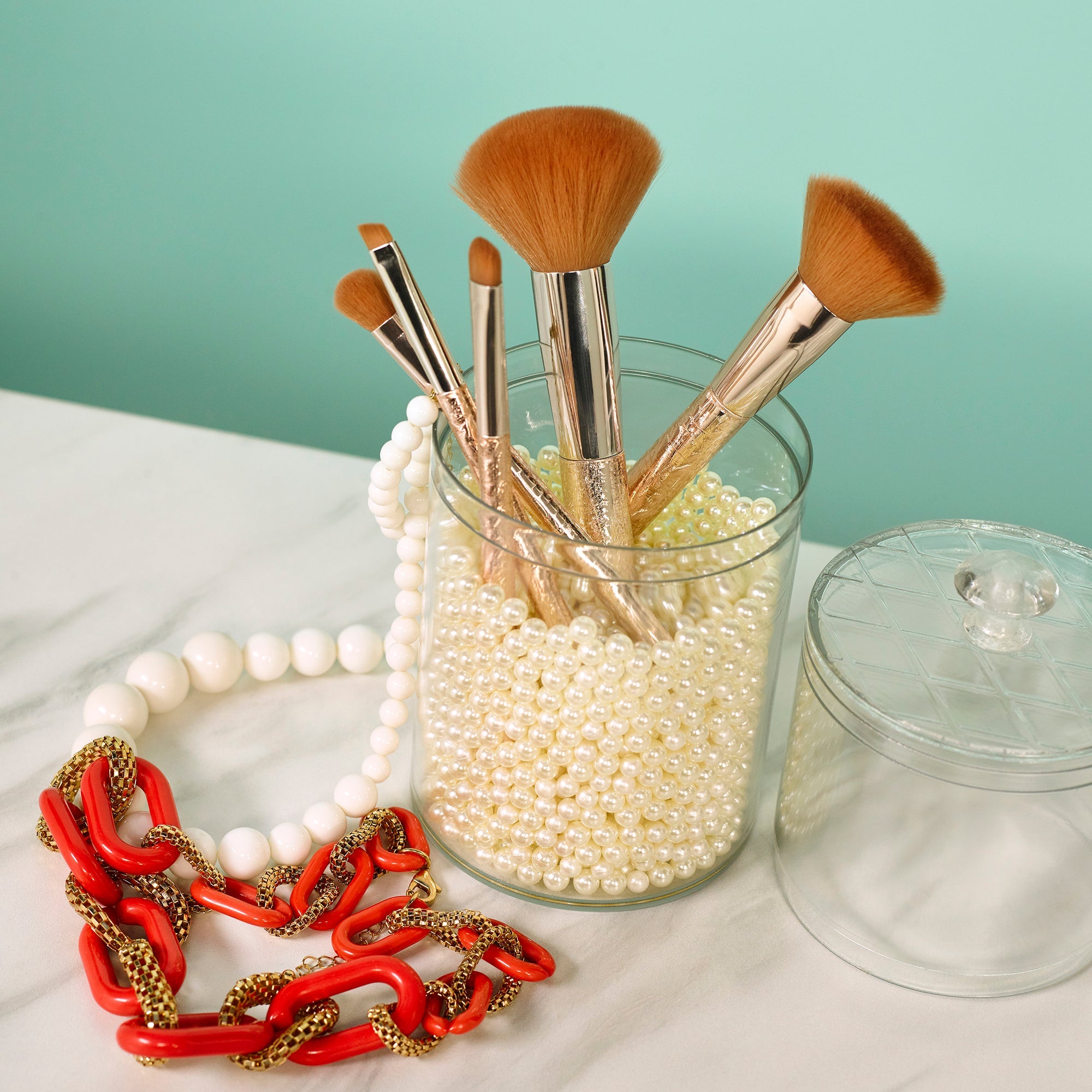 フェイスブラシ・チークブラシ・アイシャドウブラシ(3本)と、ブラシスタンドのセットです。アイシャドウブラシは大きさが異なる3本のセットなので、ベースカラー・メインカラー・アクセントカラーそれぞれに使い分けができて便利。付属のパール風ビーズに差すとスタンド代わりに。上品なデザインでお部屋のインテリアとしてディスプレイ収納いただけます。使わないときはフタを閉めることができるので衛生的です。淡いグラデーションがかわいらしいパッケージで、メイク好きな方へのギフトとしてもオススメです。
