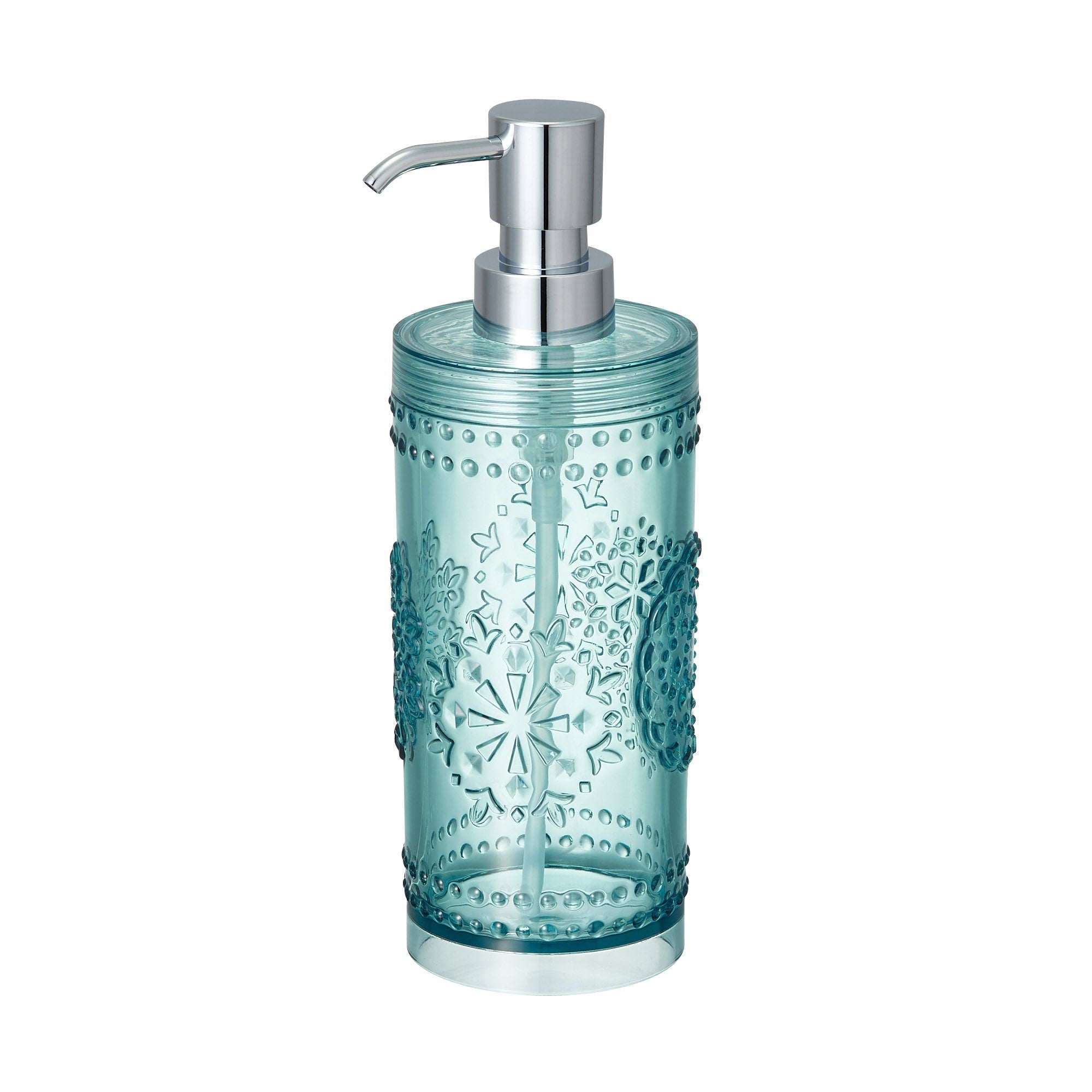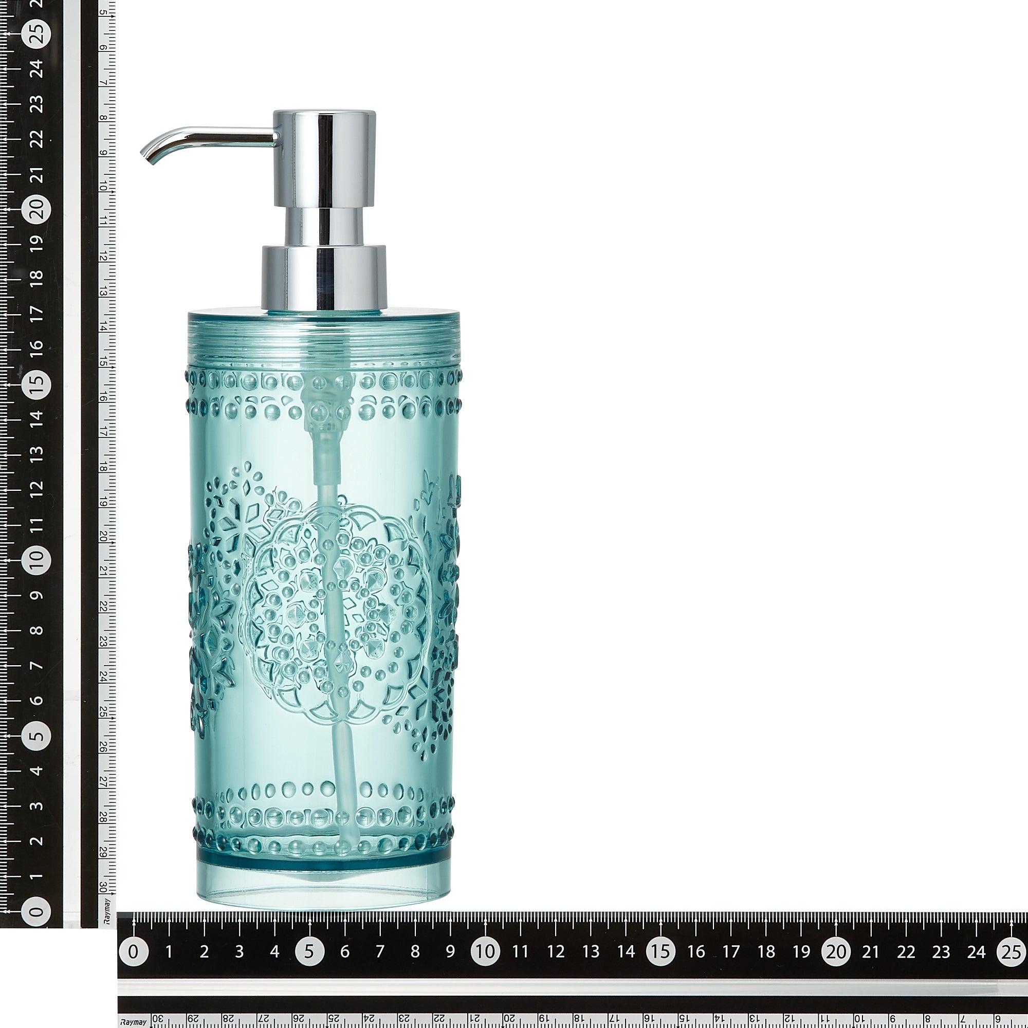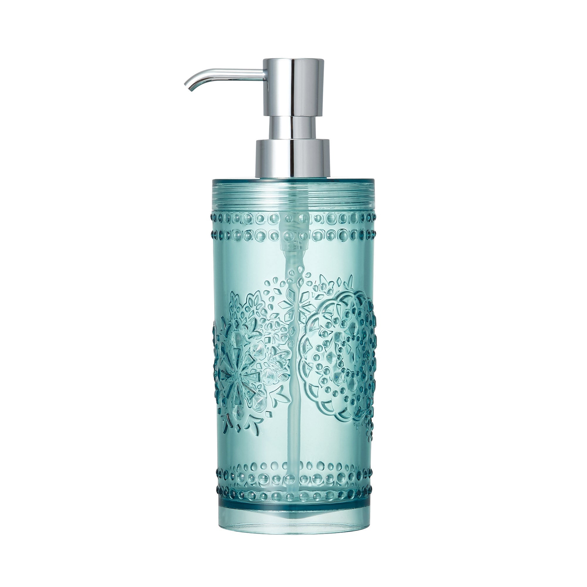 丸レースを組み合わせてラインにしたデザインで、クラシックフェミニンに仕上がったディスペンサーです。 シャンプー等がたっぷり入るサイズで、クリアで中身が見えるので減り具合が確認できます。ブルーのカラーと立体的なレース柄がバスルームを華やかにしてくれます。 シャンプー等が入るサイズ。フタが外せる仕様で詰め替え作業やお手入れがとても楽になりました。 底が中心に向かって傾斜が付いているので液体が最後まで使えます。