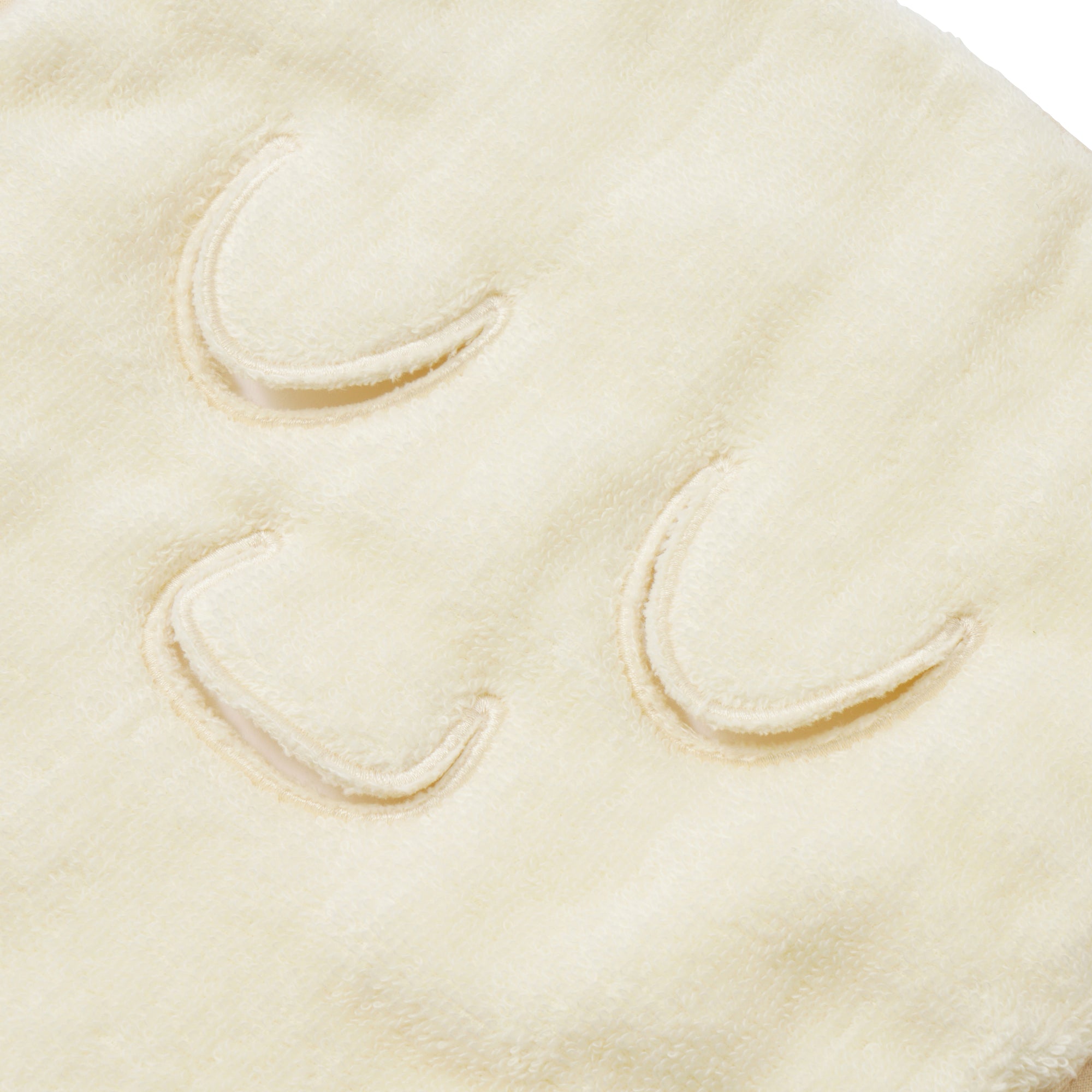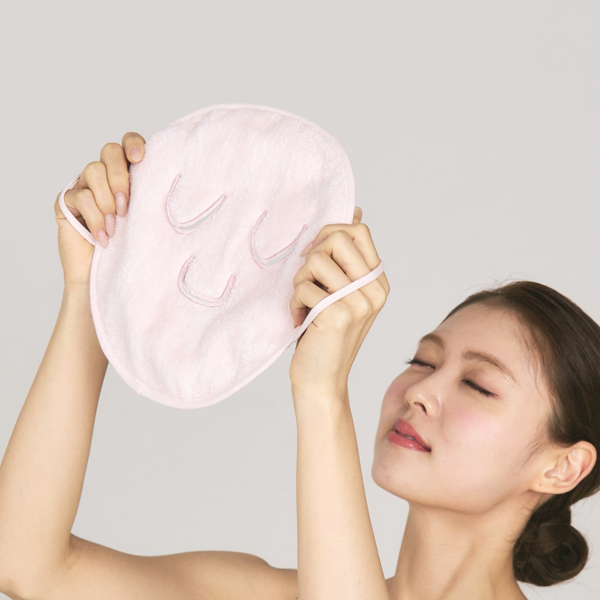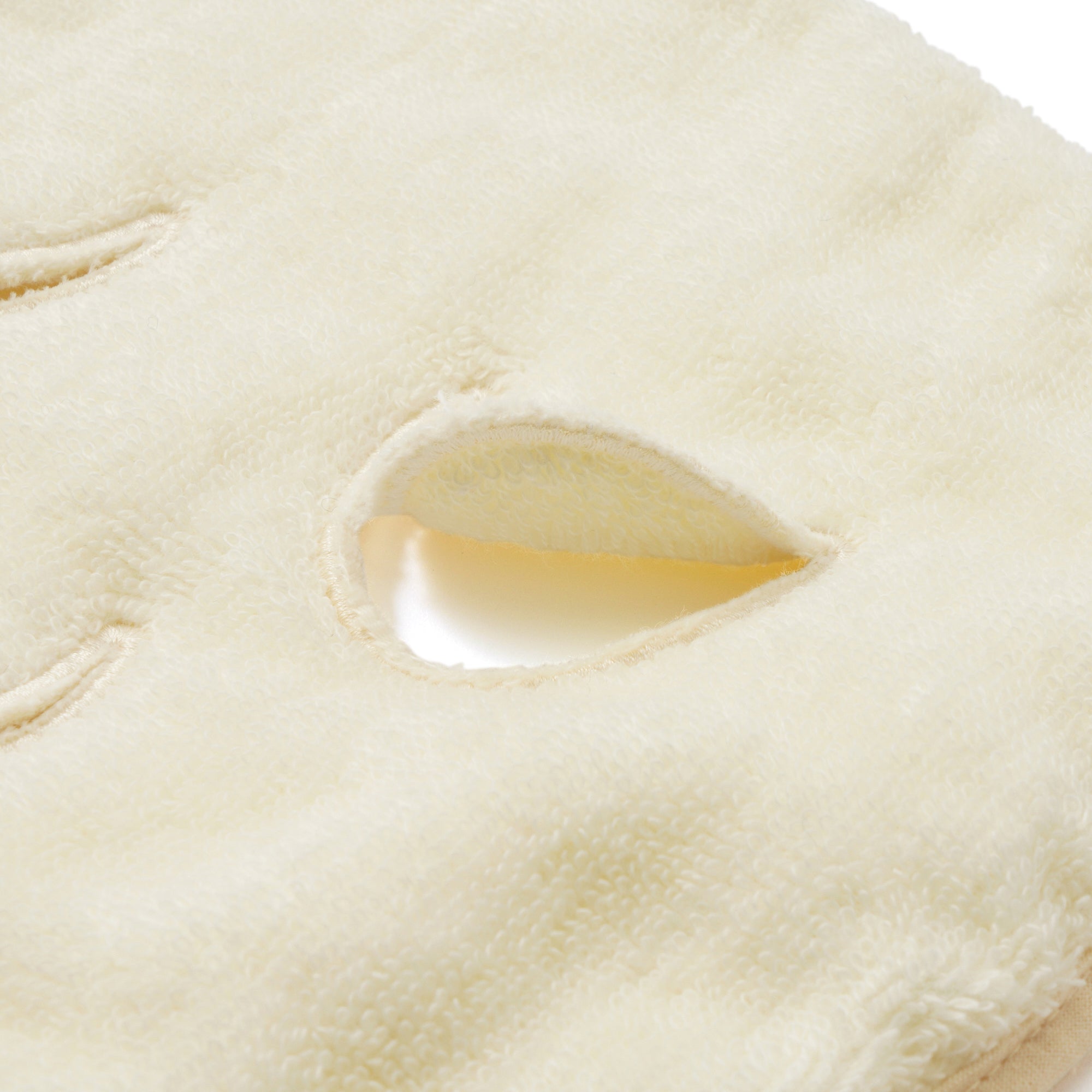 お顔全体を優しく包み込むフェイス用タオルマスクです。お鼻用の呼吸穴と目周りの穴を開けています。抗菌防臭機能付きで清潔にご使用いただけます。エアパウダーは、糸の中に多くのすきまを含んだ、ふんわり軽やかで柔らかな風合いが特長です。コットンとキュプラを組み合わせることで、自然なタッチとなめらかな肌触りを実現。キュプラは断面が真円に近く、摩擦が少ないため、肌への刺激を抑えられます。<使い方>・レンジで温めスキンケア前にリラックス。熱と蒸気で毛穴を開くことで、スキンケアの浸透を促します。・水で濡らして絞った後に氷水や、冷蔵庫で1時間程冷やし、顔にのせてください。