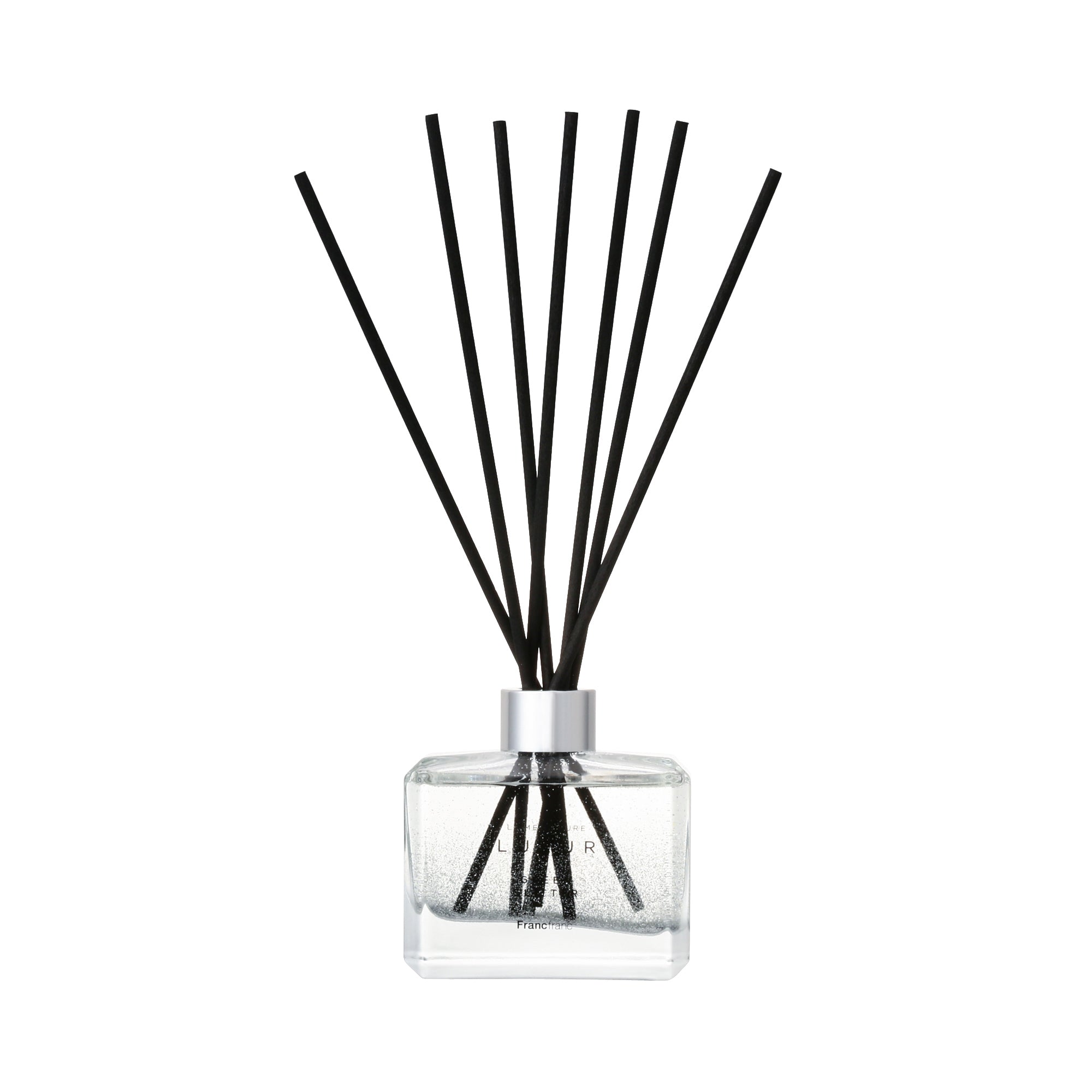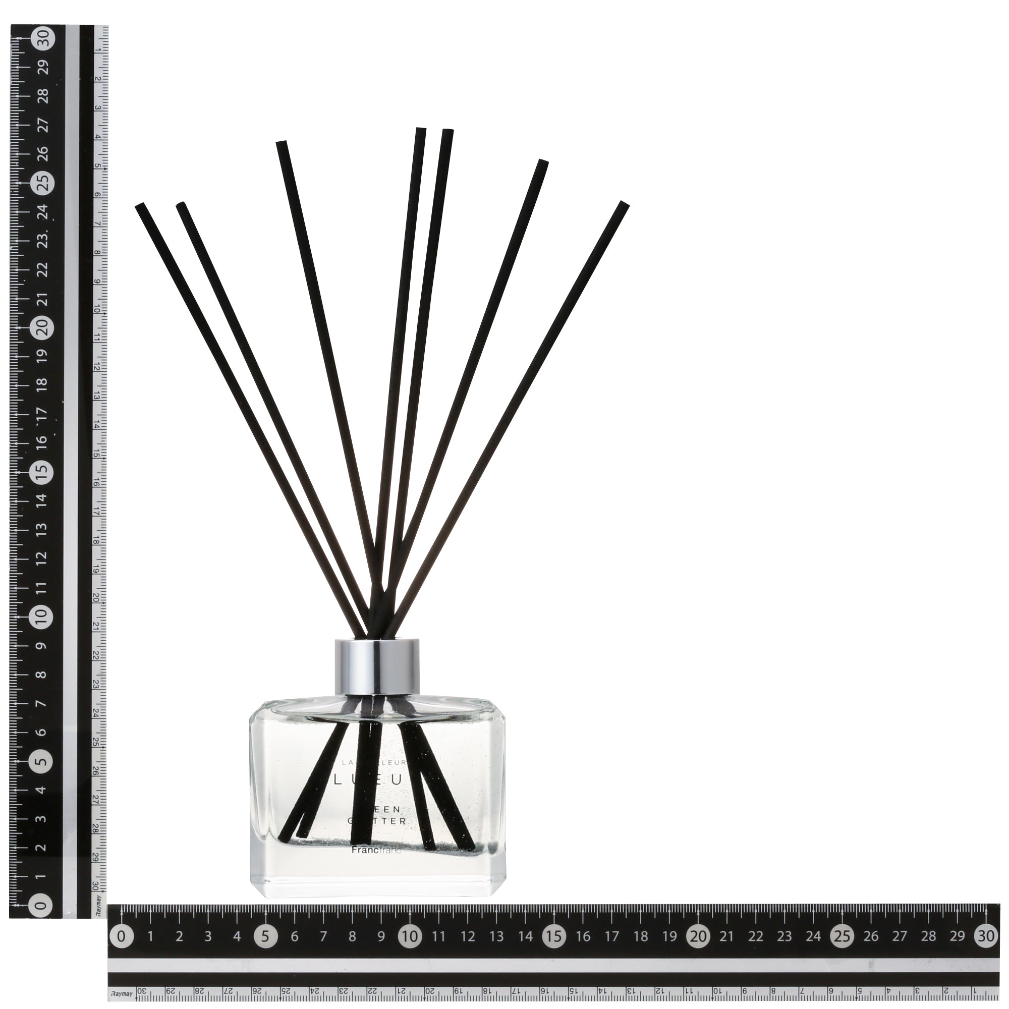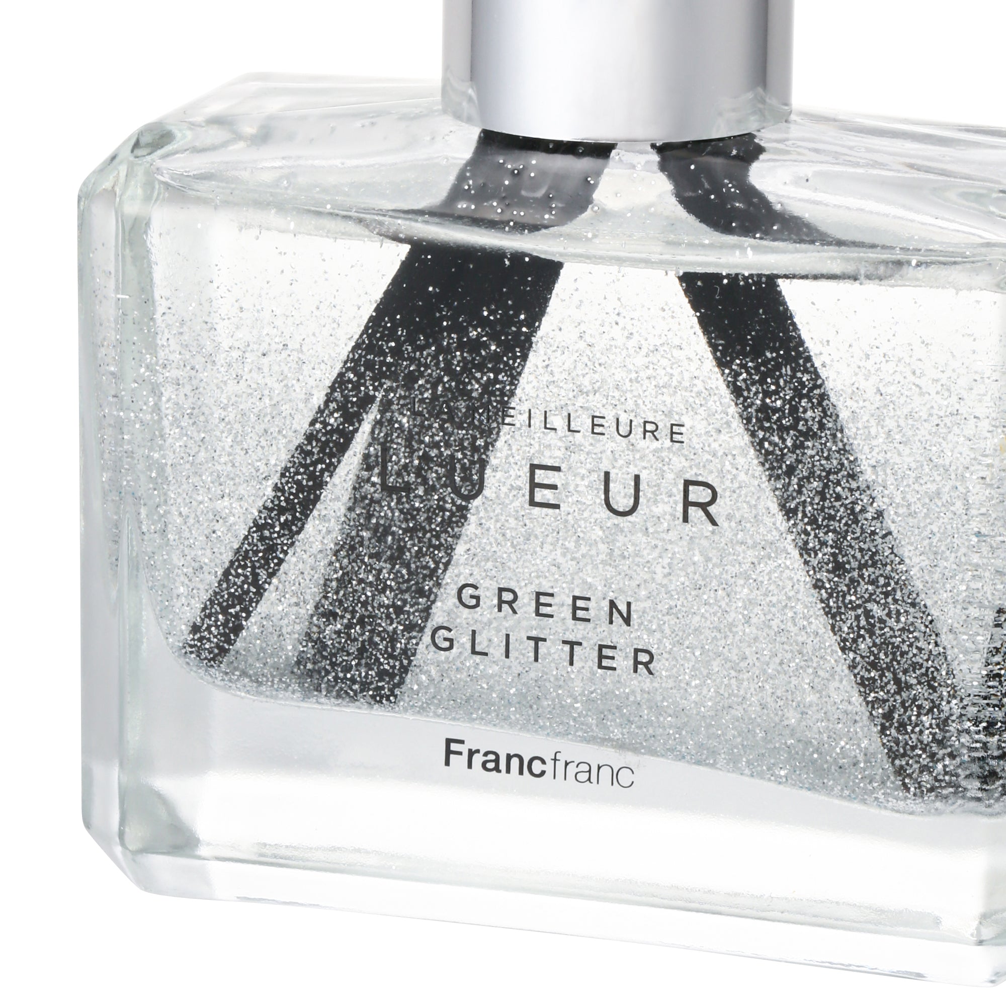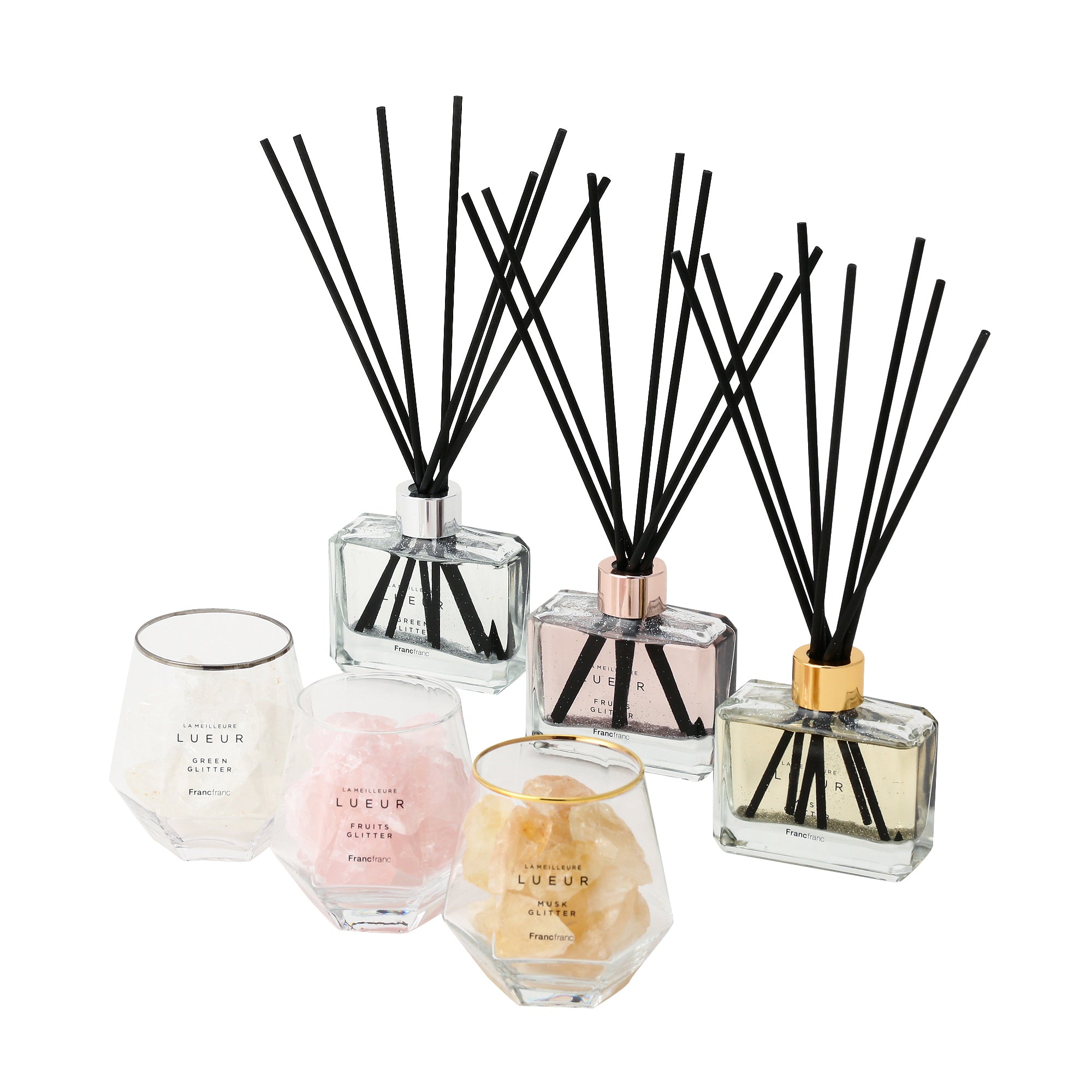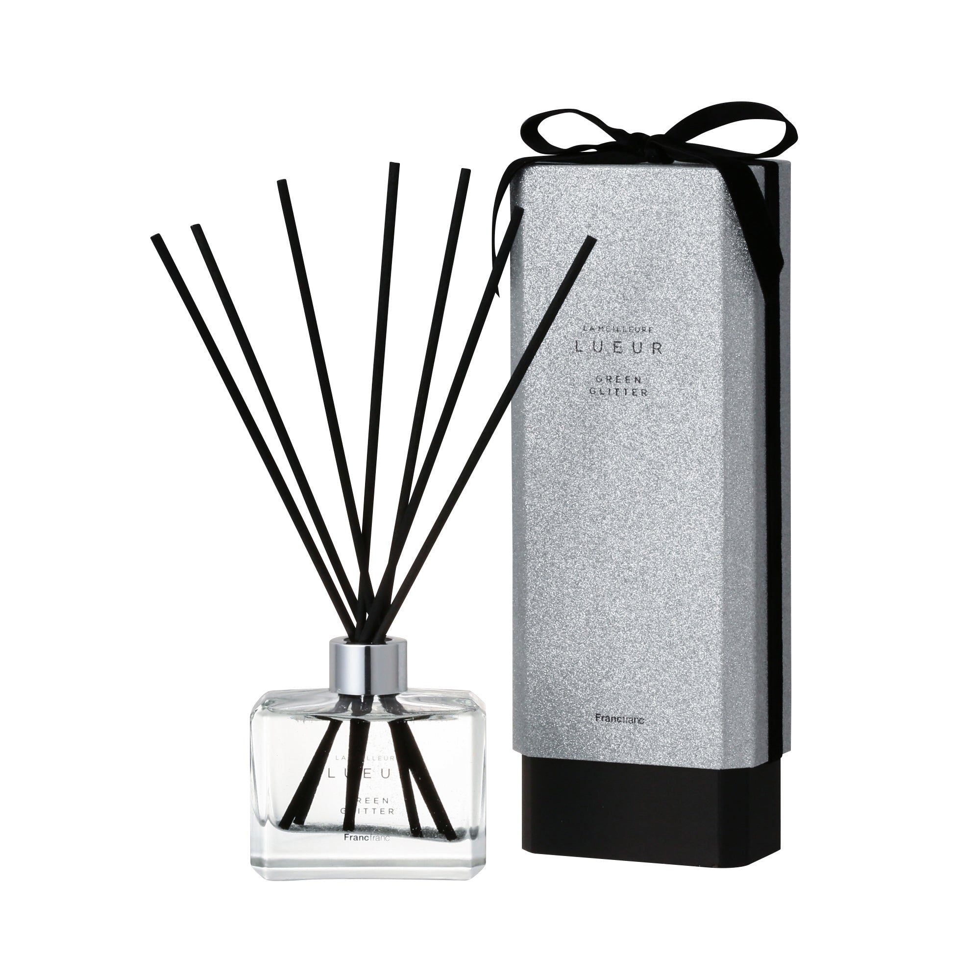 フランス語で「輝き」というネーミングのとおり、きらきらとまばゆいばかりに輝くパッケージに包まれたルームフレグランスです。 フレグランスの繊細なラメが際立つよう、シンプルなフォルムのボトルにこだわりのカッティングを施してゴージャスでエレガントなアイテムに仕上げました。 特別感あふれる華やかなデザインはギフトにもおすすめです。 パーティーシーズンを盛り上げる、甘いグリーン系の香り。 ◆グリーングリッターの香り トップ:レモン、エレミガム、グリーン ミドル:ジャスミン、ローズ ベース:シダーウッド <使用方法> 付属のスティックを数本ずつ、液を染み込ませながら、ゆっくりと挿入してください。 一度に挿すと液が溢れ出ることがございます。 使用するスティックの本数によって香りの調節ができます。 ※芳香が強い場合はスティックの本数を減らしてください。
