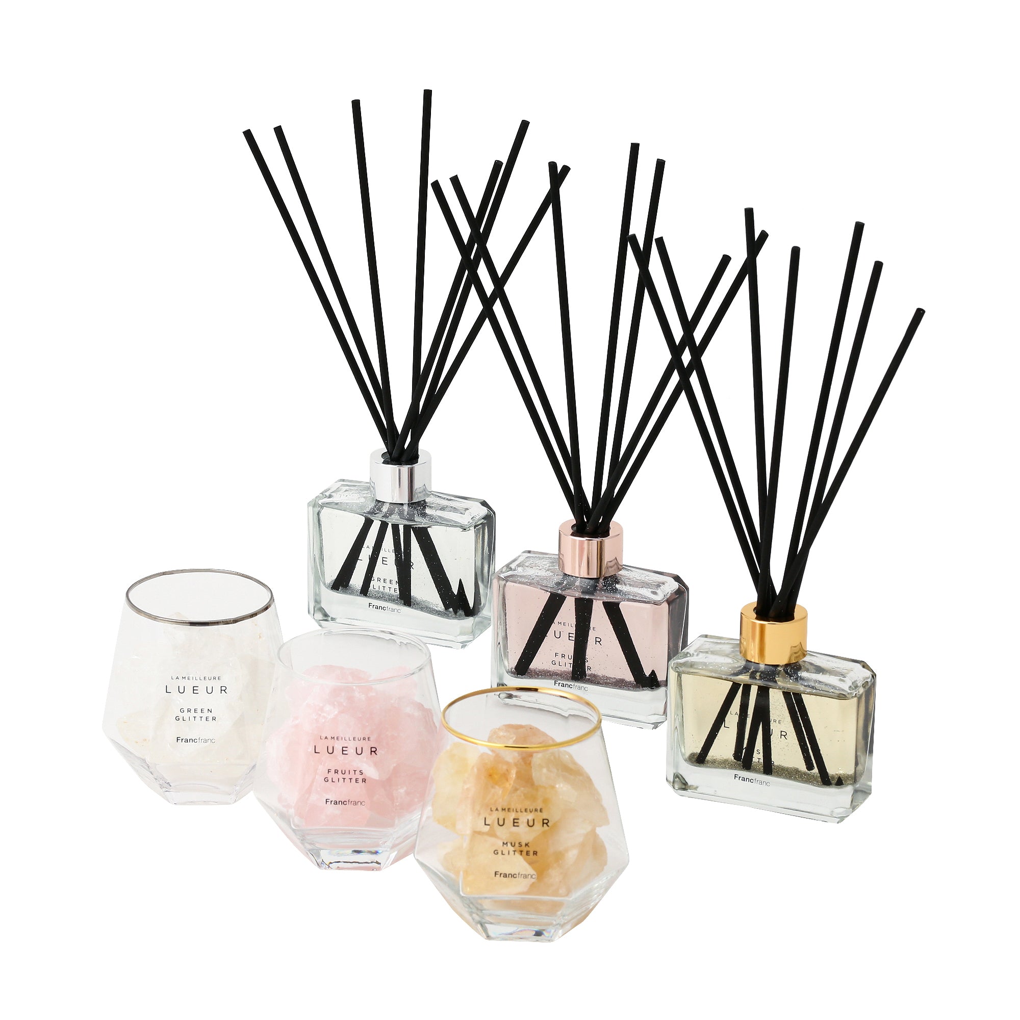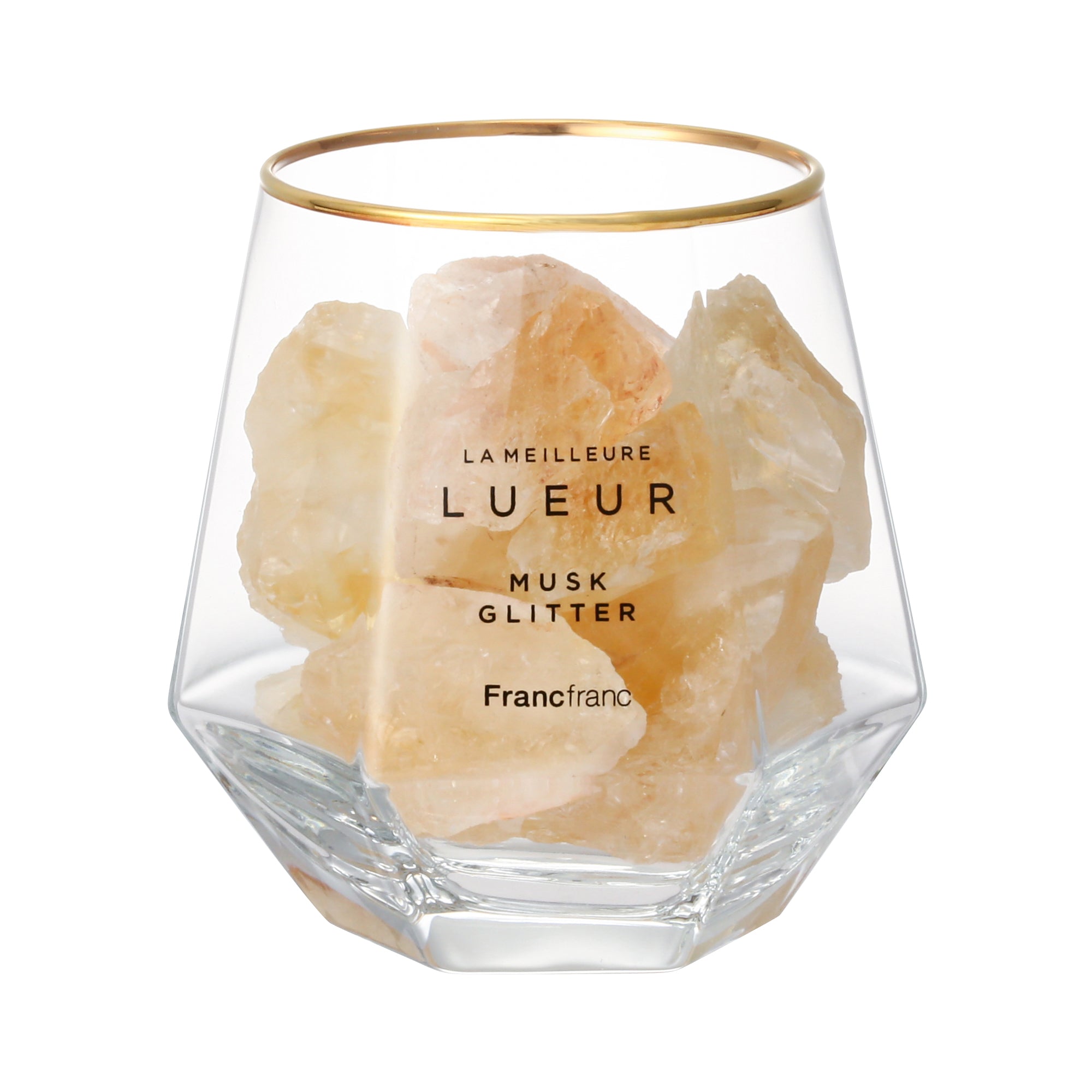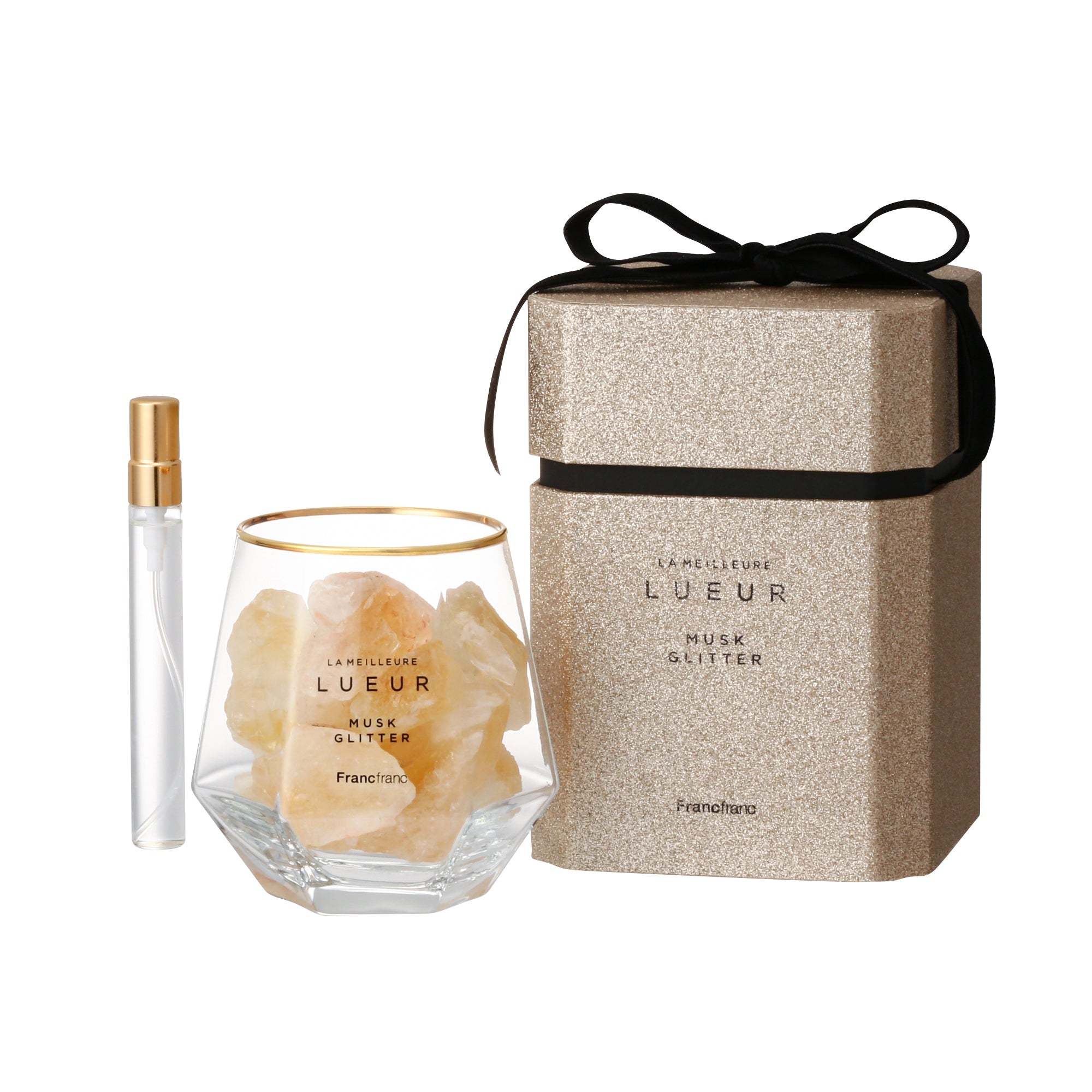 フレグランスオイルを石に垂らすとふんわりと香りが広がる、エレガントなフレグランスアイテムです。 フランス語で「輝き」というネーミングのとおり、きらきらとまばゆいばかりに輝くパッケージに包まれたゴージャスなデザイン。 ダイヤモンドカットを施し、ゴールドフチで巻いたグラスもセットになっているのですぐに使えて、ギフトにもぴったりです。 石は小分けにできるので、お気に入りのトレイなどにのせてちょっとしたスペースに置いても素敵です。 パーティーシーズンを盛り上げる、爽やかなフルーティームスクの香り。 ◆ムスクグリッターの香り トップ:レモン、バイオレットリーフ ミドル:ローズ、ウォータリー ベース:アンバー、ムスク、オリス <使用方法> 付属の石を数個ずつ、液を染み込ませてください。 使用する石の個数によって香りの調節ができます。 ※芳香が強い場合は石の個数を減らしてください。