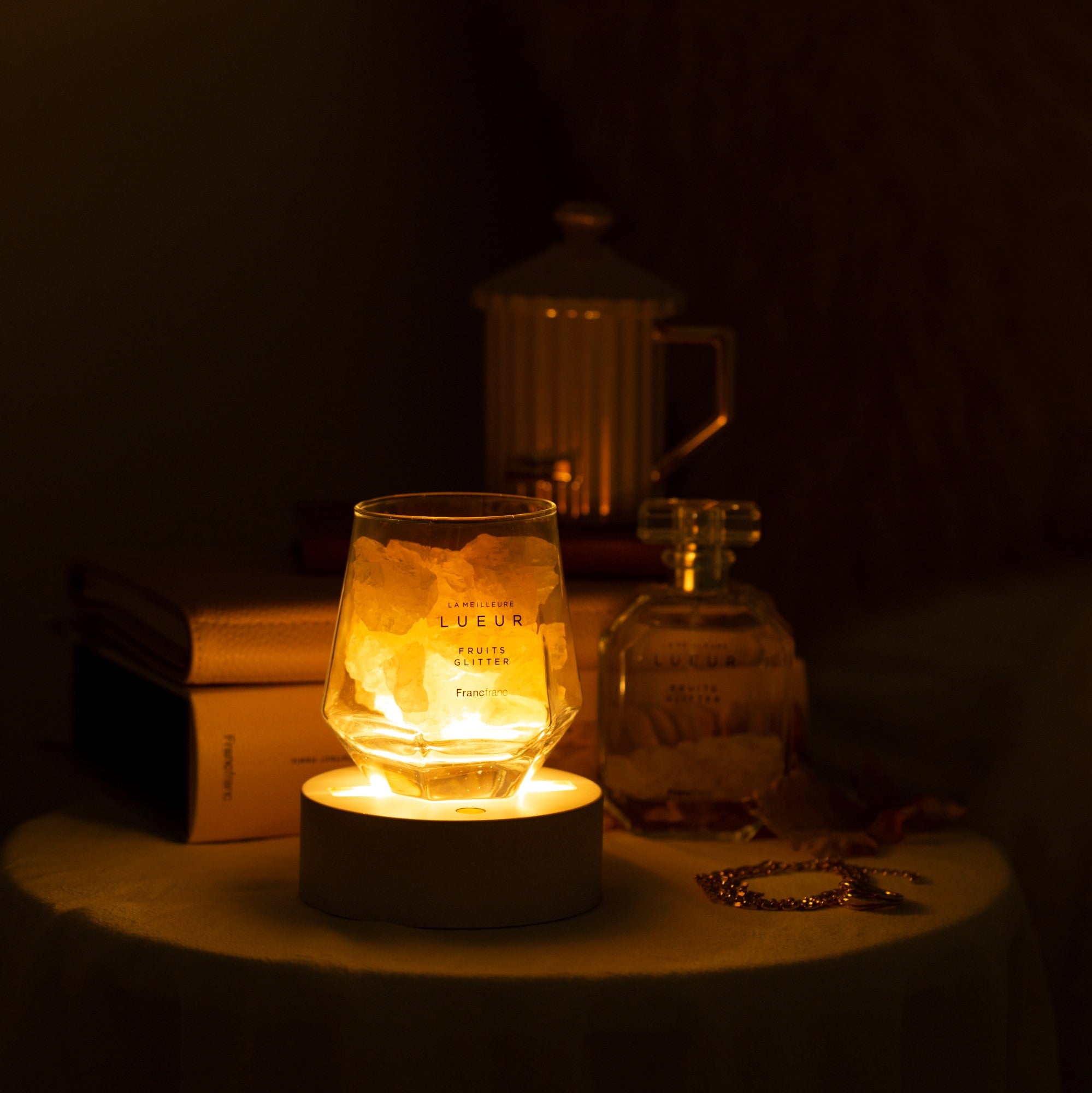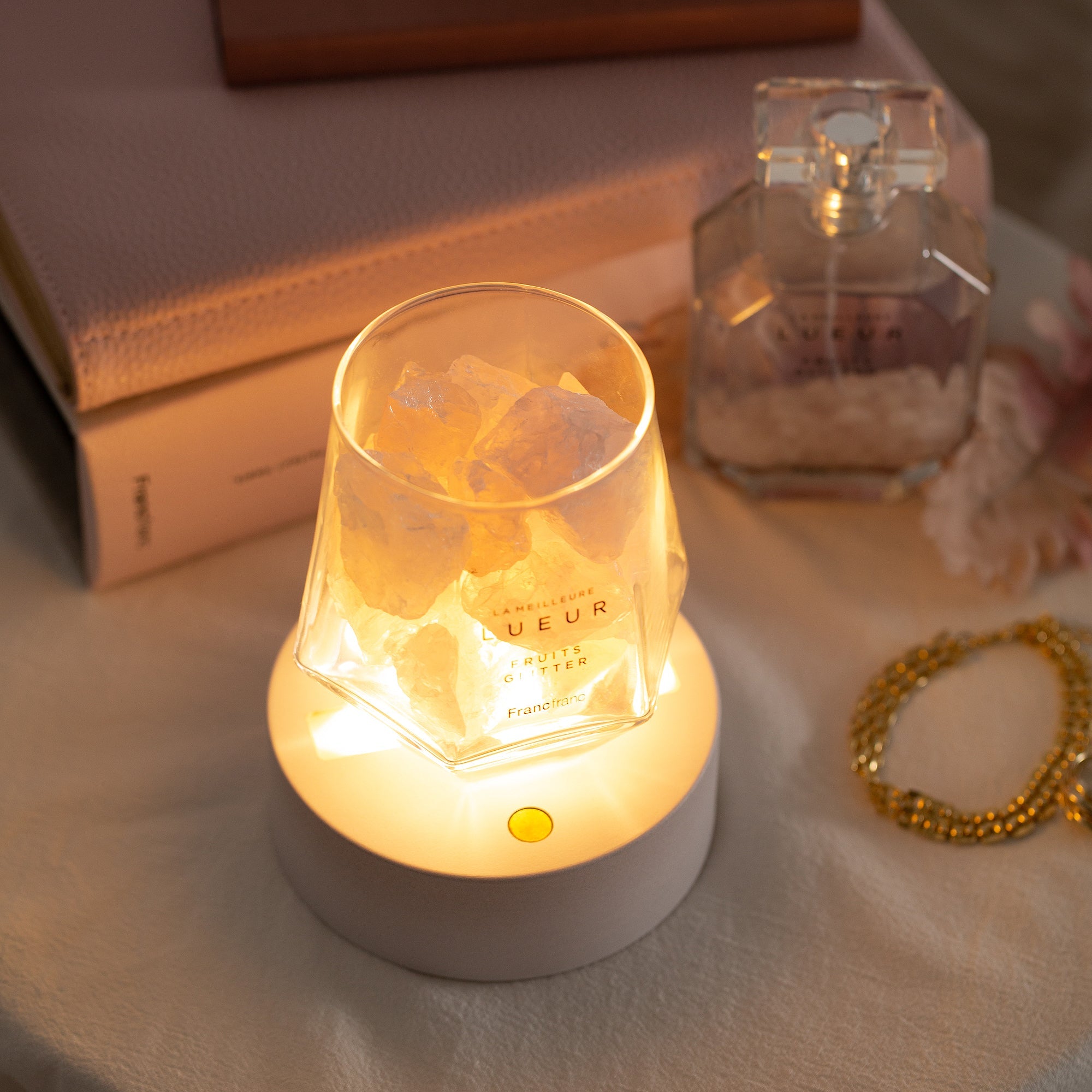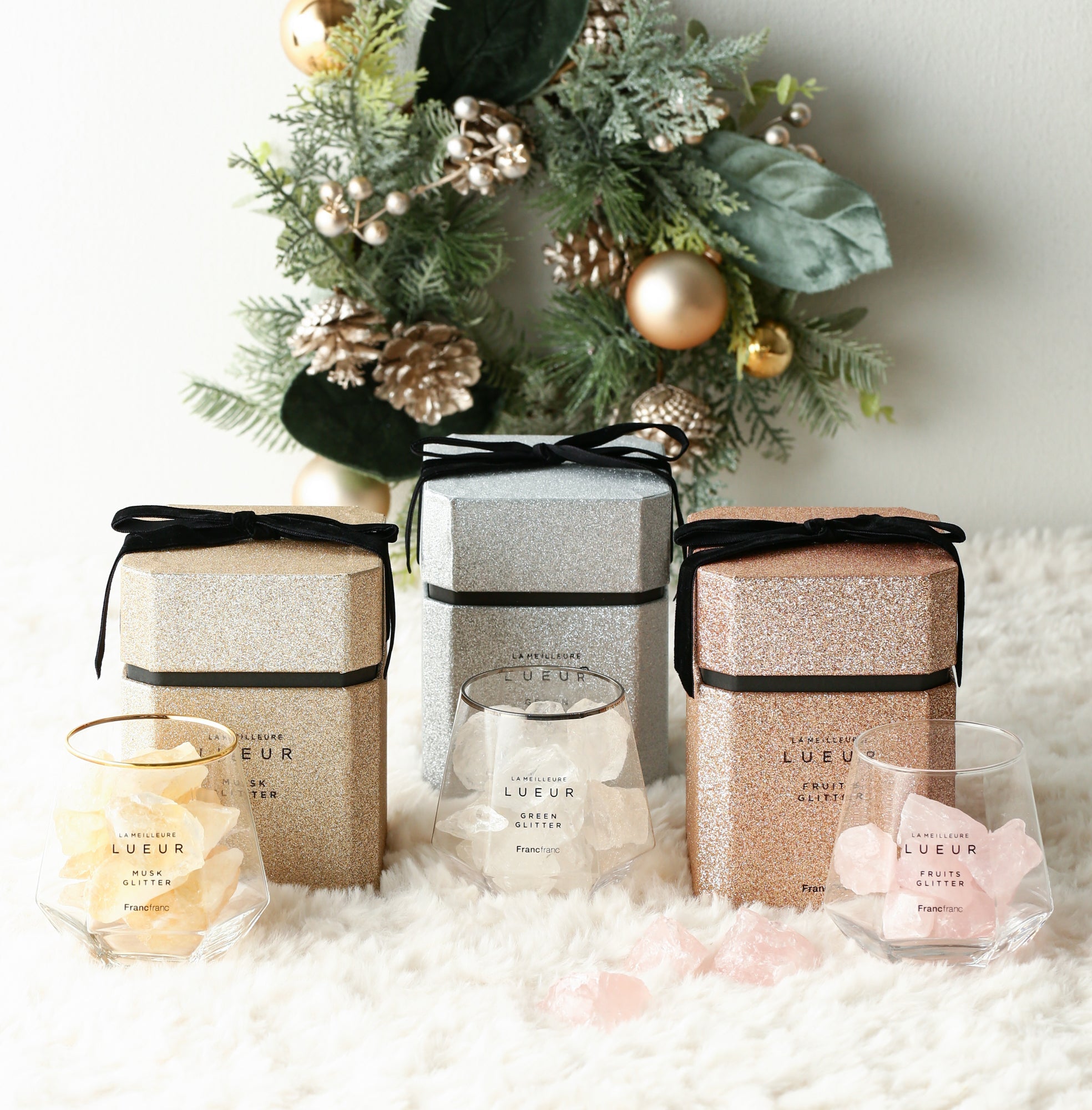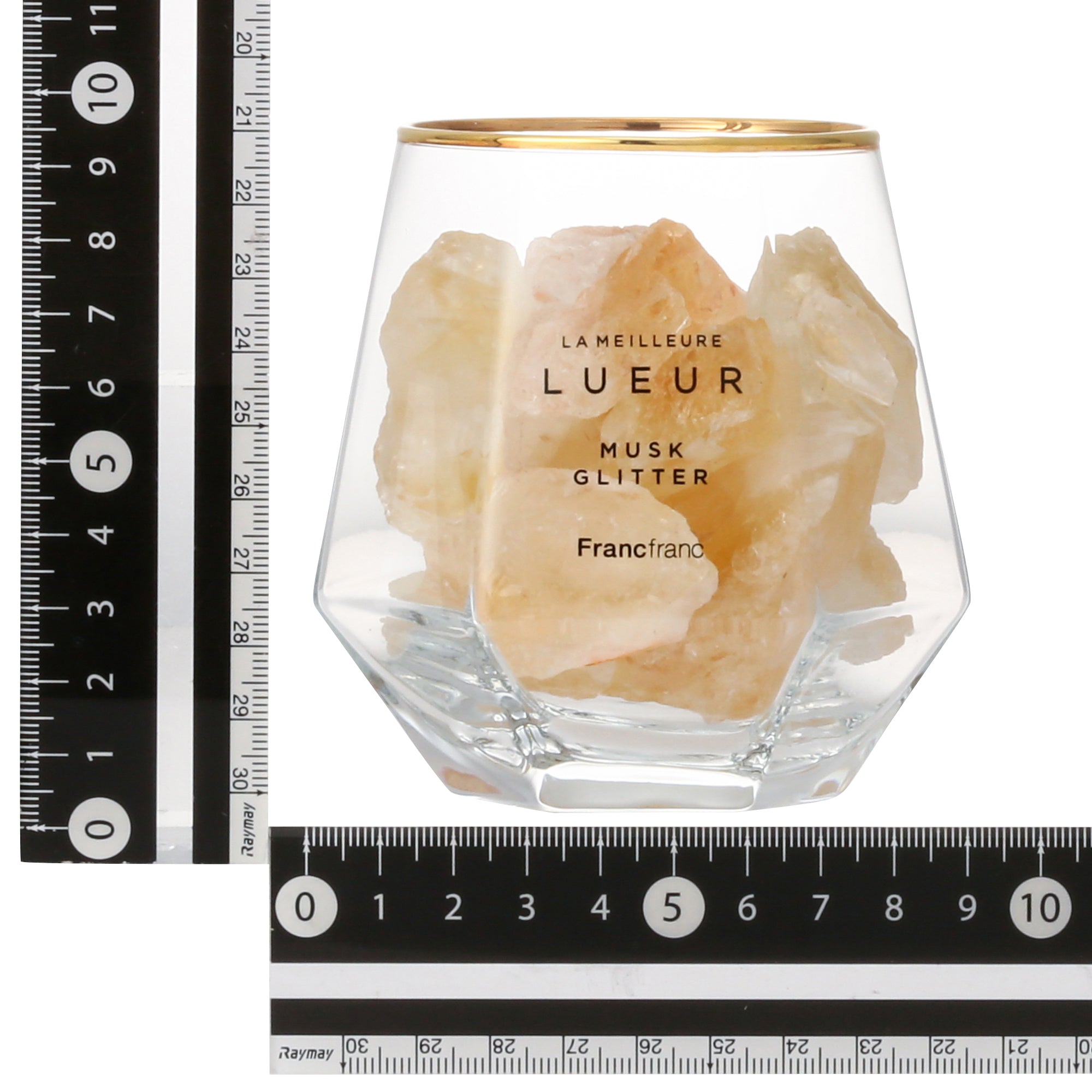 フレグランスオイルを石に垂らすとふんわりと香りが広がる、エレガントなフレグランスアイテムです。 フランス語で「輝き」というネーミングのとおり、きらきらとまばゆいばかりに輝くパッケージに包まれたゴージャスなデザイン。 ダイヤモンドカットを施し、ゴールドフチで巻いたグラスもセットになっているのですぐに使えて、ギフトにもぴったりです。 石は小分けにできるので、お気に入りのトレイなどにのせてちょっとしたスペースに置いても素敵です。 パーティーシーズンを盛り上げる、爽やかなフルーティームスクの香り。 ◆ムスクグリッターの香り トップ:レモン、バイオレットリーフ ミドル:ローズ、ウォータリー ベース:アンバー、ムスク、オリス <使用方法> 付属の石を数個ずつ、液を染み込ませてください。 使用する石の個数によって香りの調節ができます。 ※芳香が強い場合は石の個数を減らしてください。