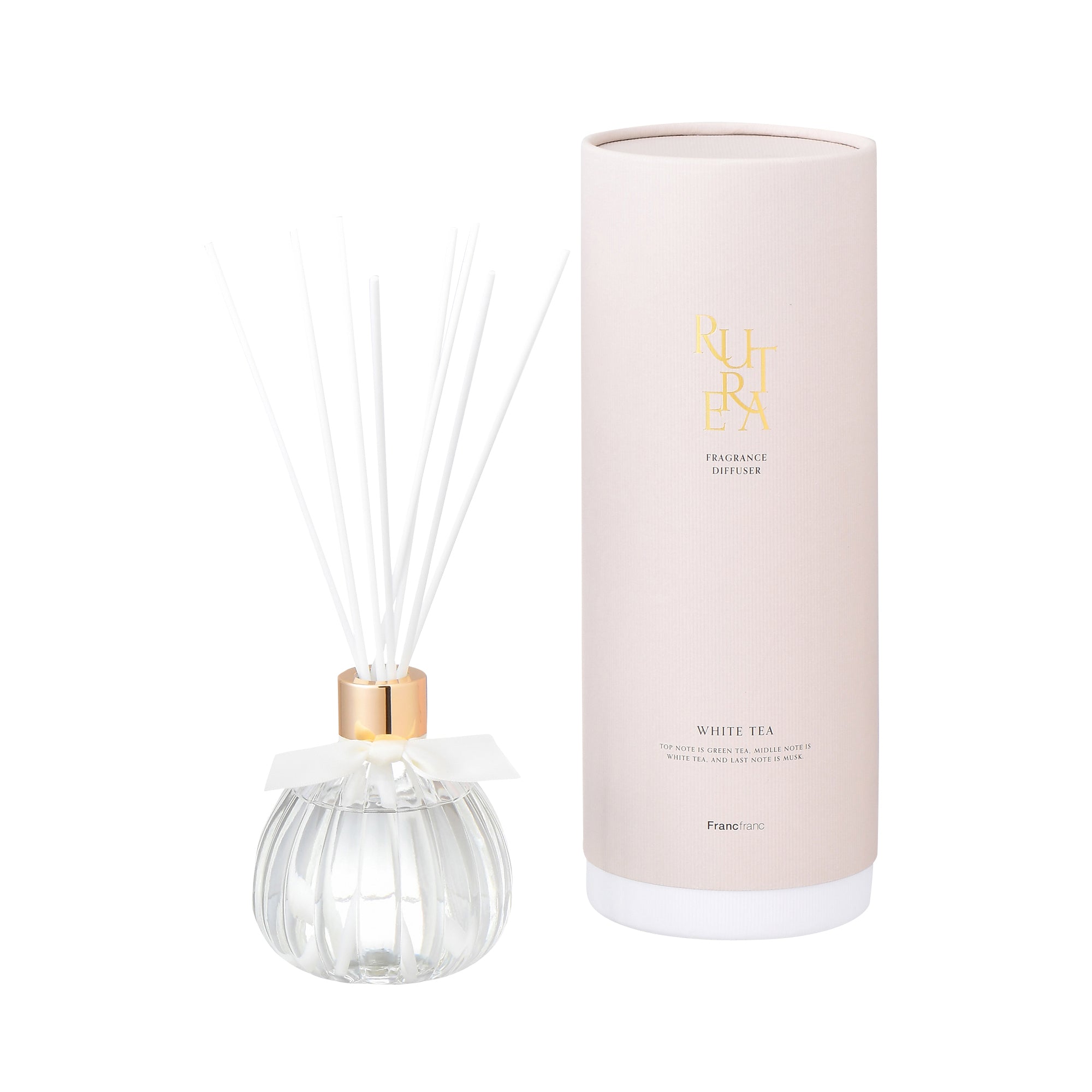 スモールスペースに置きやすいコンパクトなディフューザーです。シンプルなデザインと優しい香りは置く場所を選びません。・トップ:グリーンティー、ベルガモット、グリーンティーリーブ・ミドル:ホワイトティー、ジャスミン、リツェアクベバ・ベース:ムスク、シダーウッド、アンバーグリス