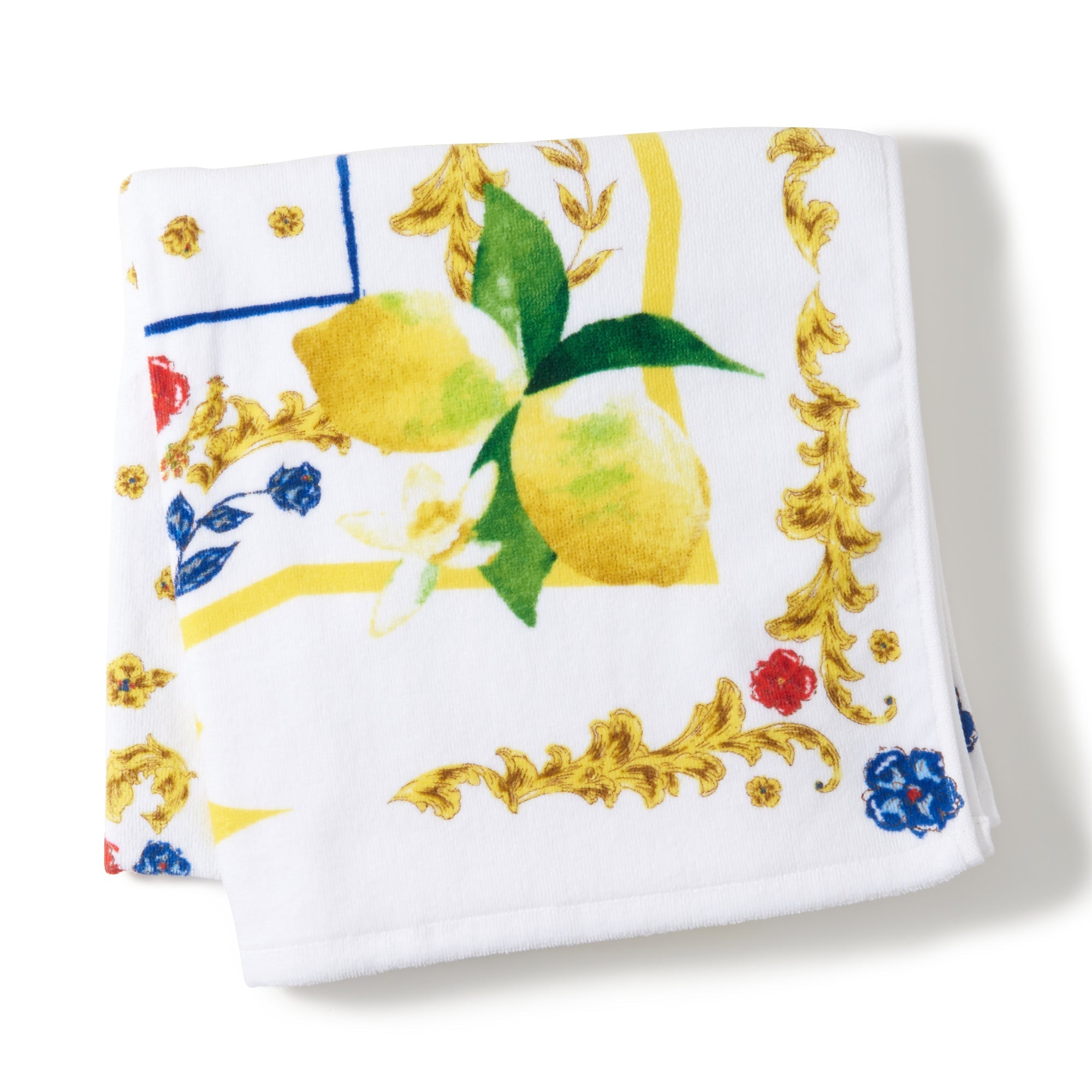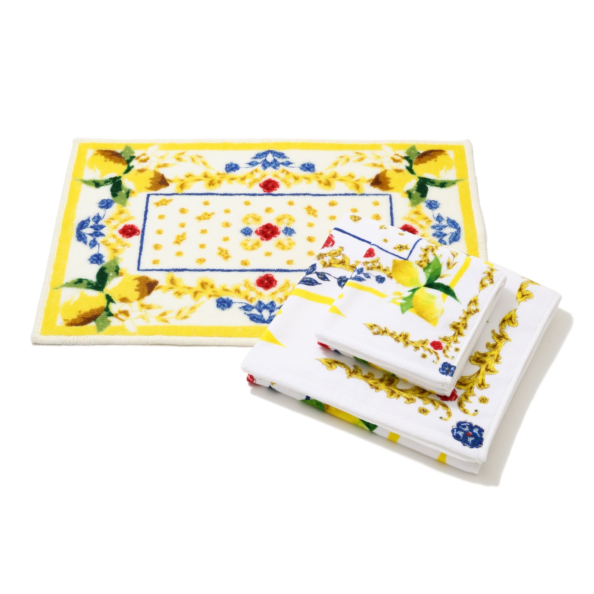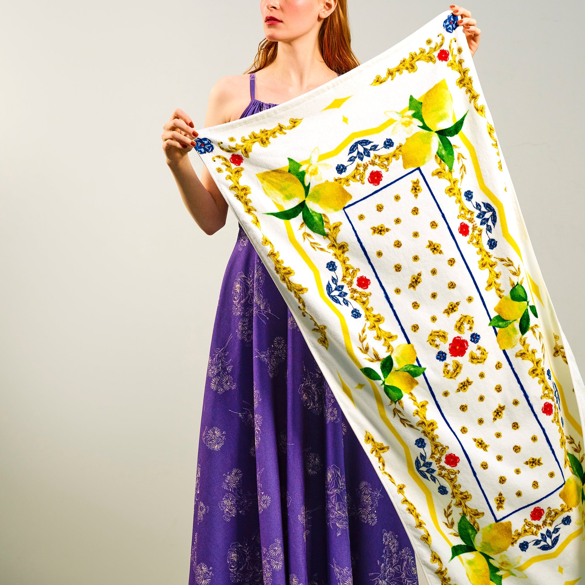 レモンモチーフをふんだんに使用したビビットカラーのスカーフ柄がアイキャッチーなバスタオルです。肉厚でふんわり柔らかい触り心地のシャーリング加工。上品な柄なので贈り物にしても喜ばれるアイテムです。