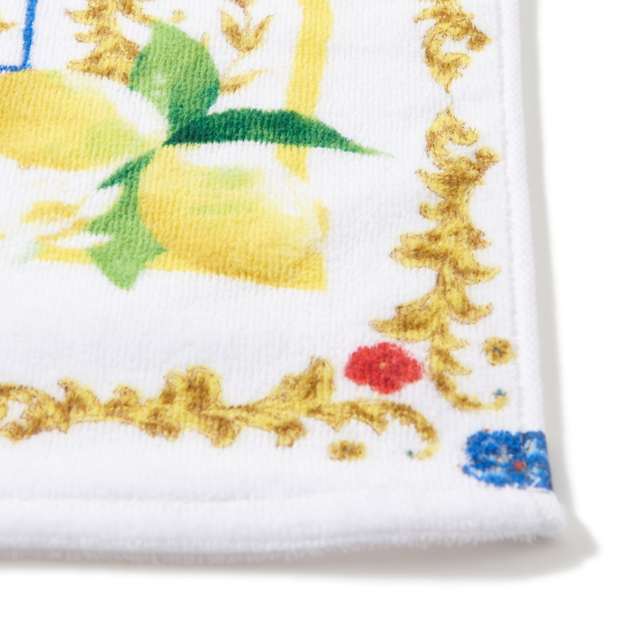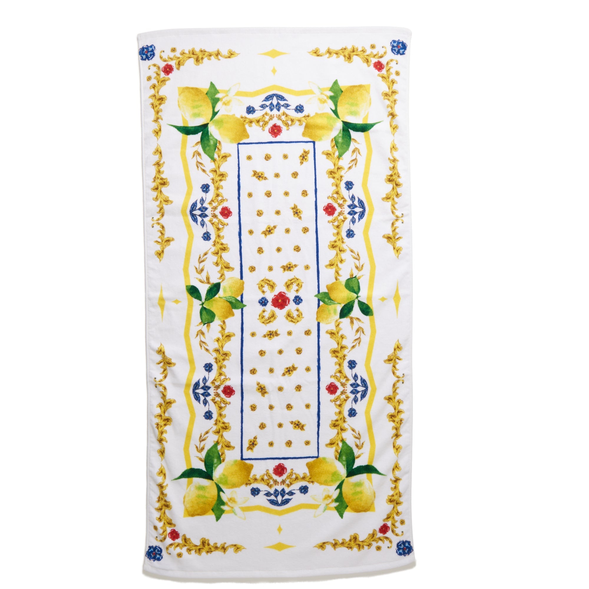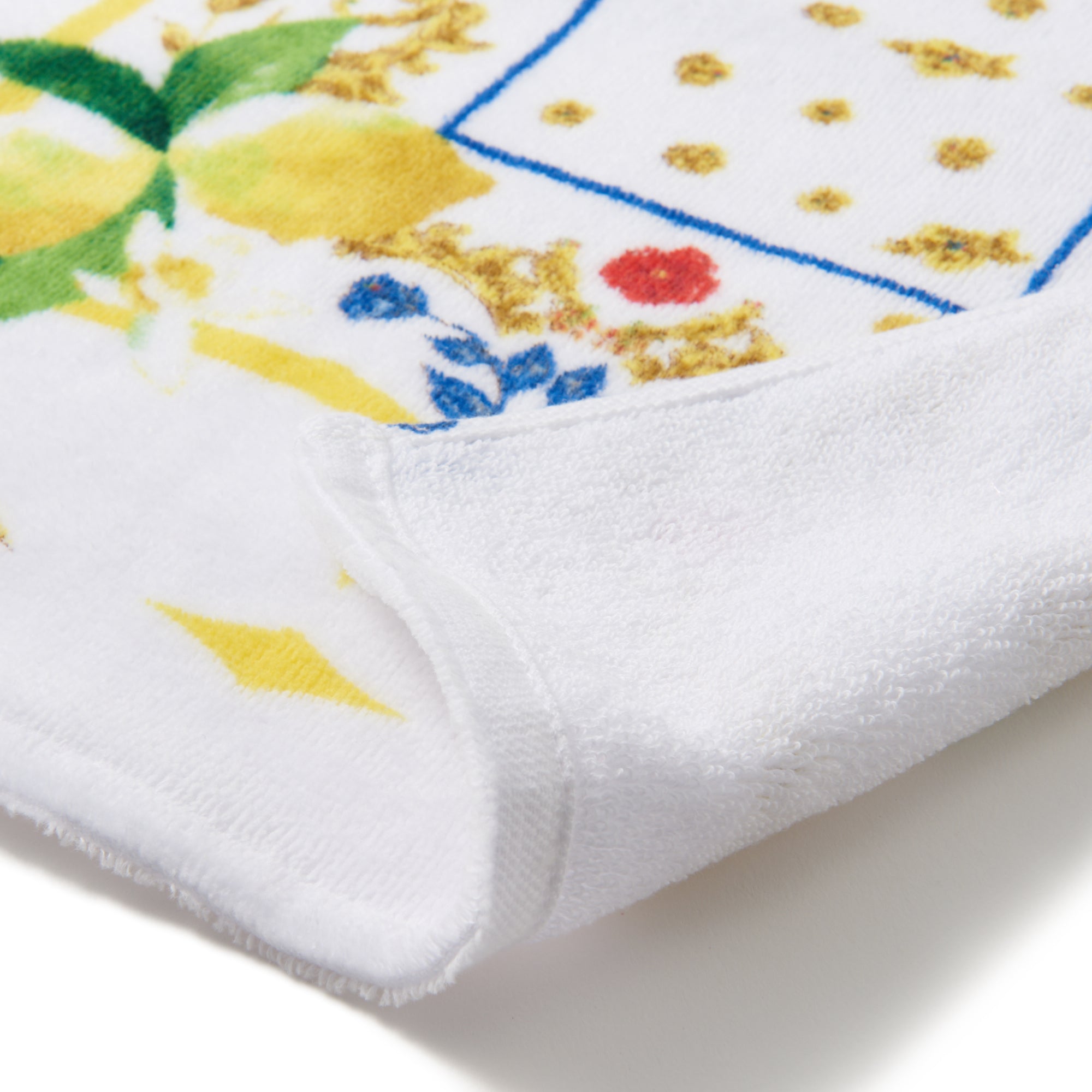 レモンモチーフをふんだんに使用したビビットカラーのスカーフ柄がアイキャッチーなバスタオルです。肉厚でふんわり柔らかい触り心地のシャーリング加工。上品な柄なので贈り物にしても喜ばれるアイテムです。