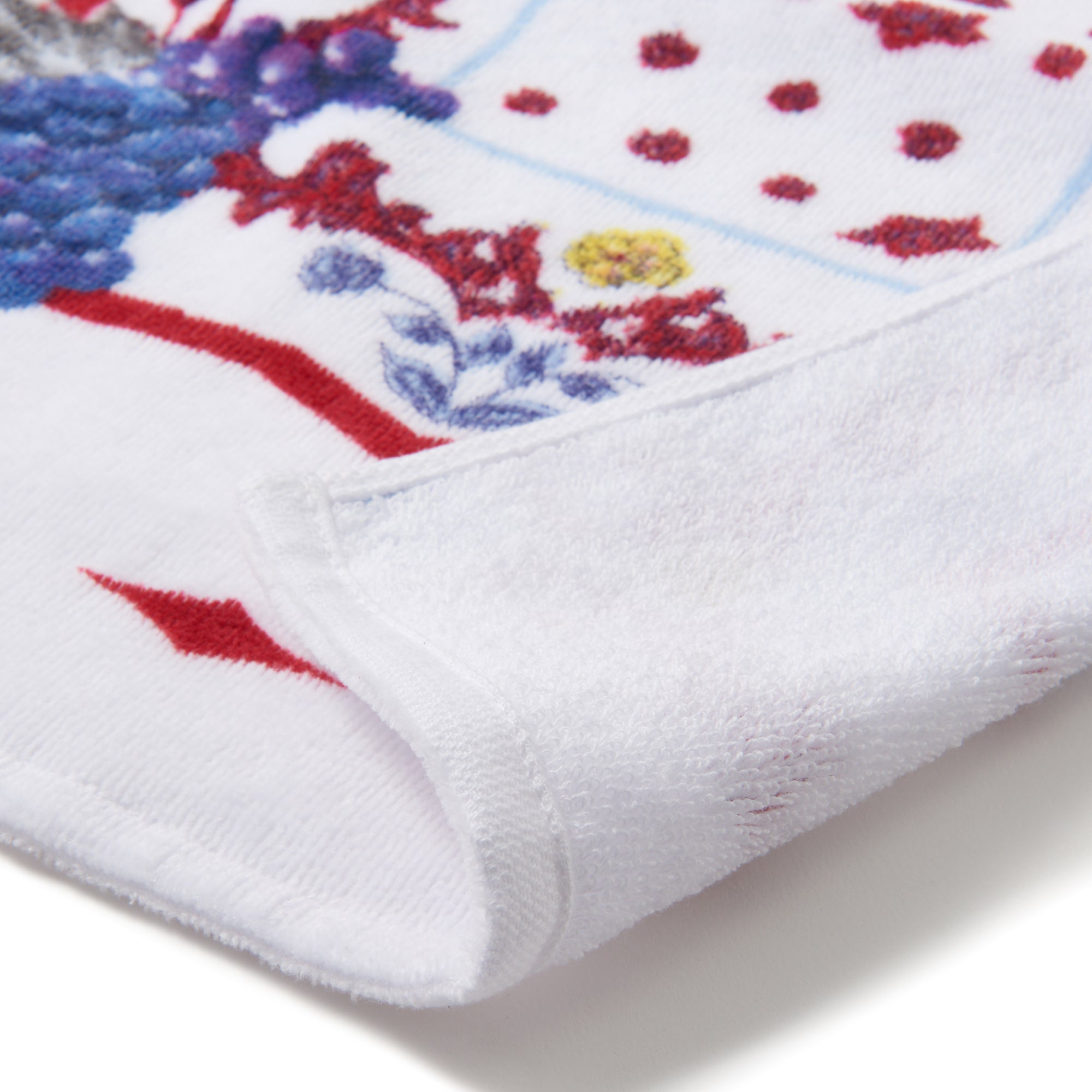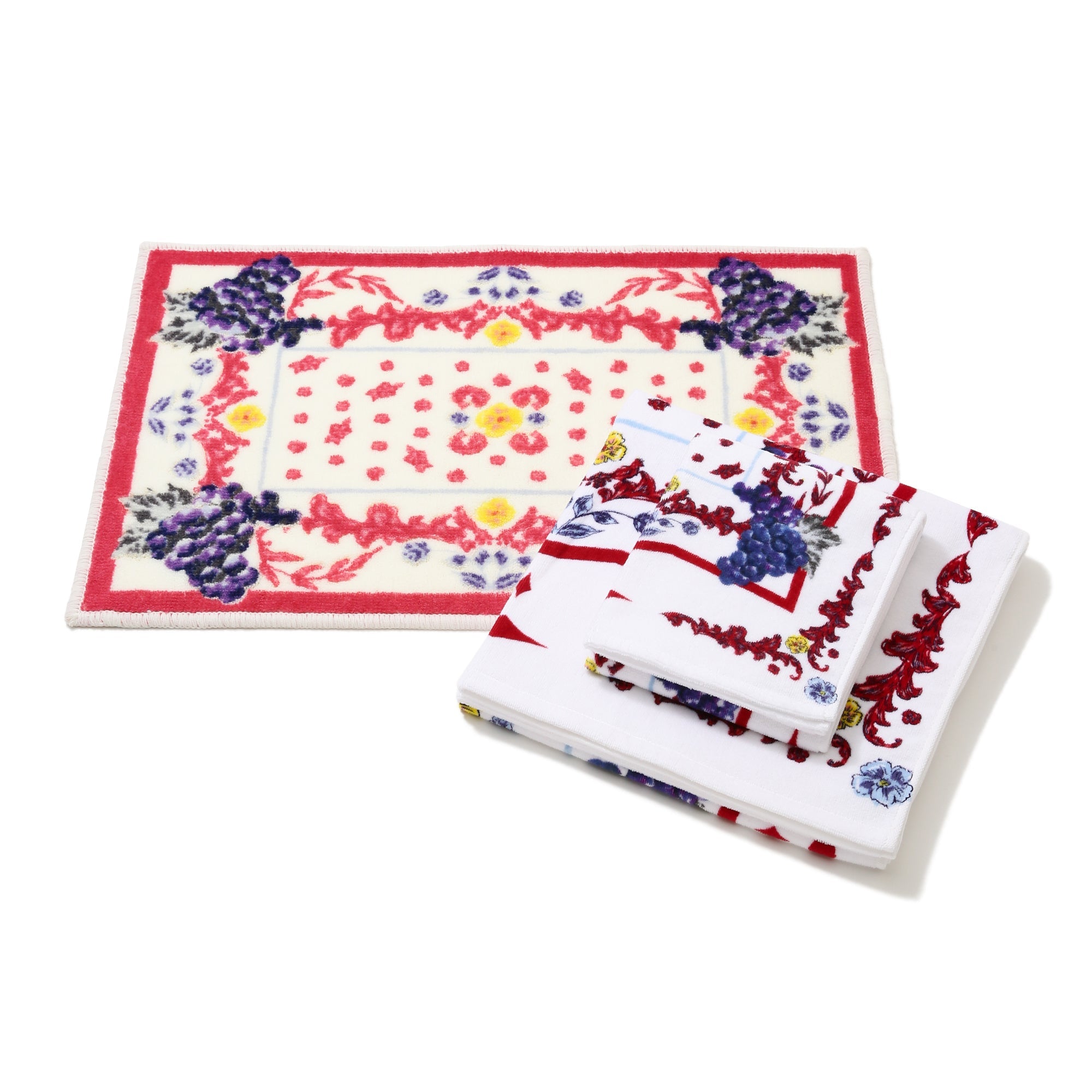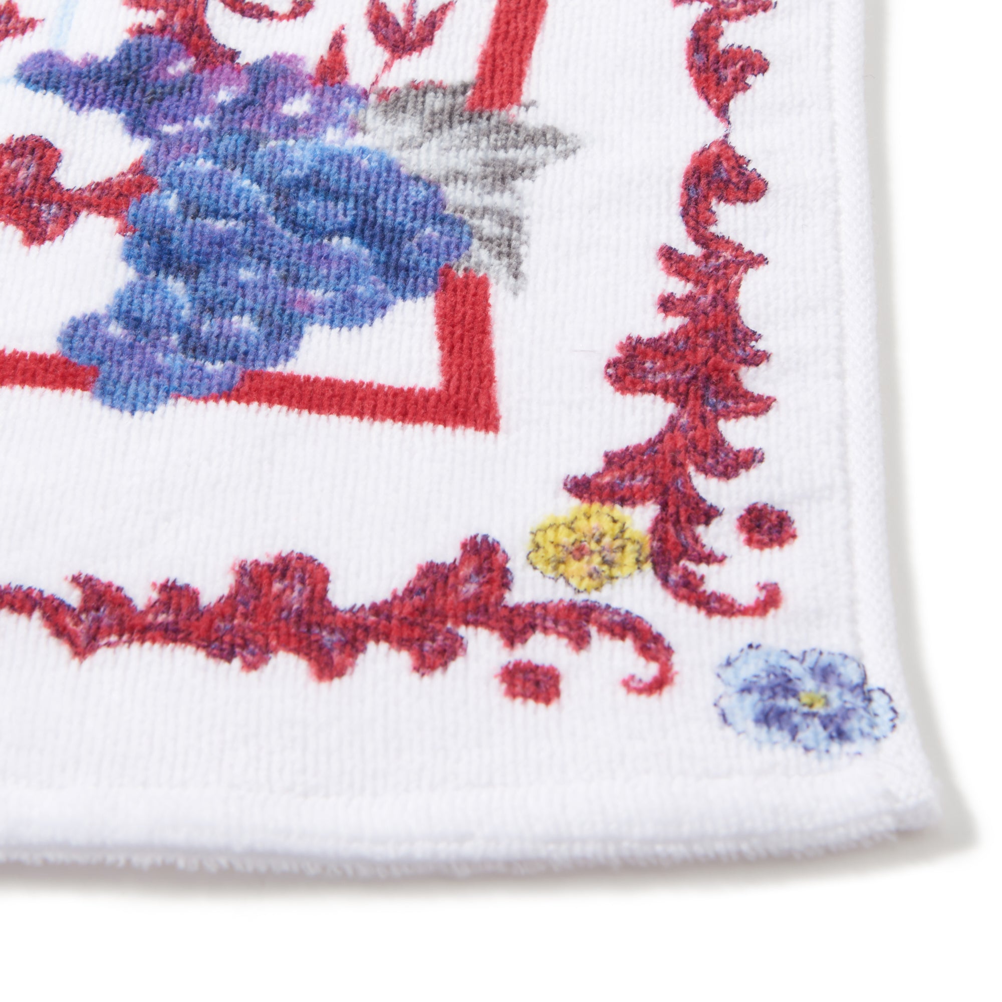 ブドウモチーフをふんだんに使用したビビットカラーのスカーフ柄がアイキャッチーなフェイスタオルです。肉厚でふんわり柔らかい触り心地のシャーリング加工。上品な柄なので贈り物にしても喜ばれるアイテムです。