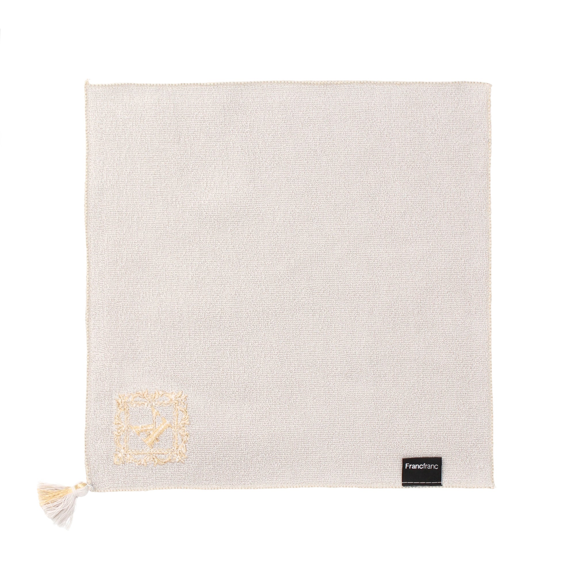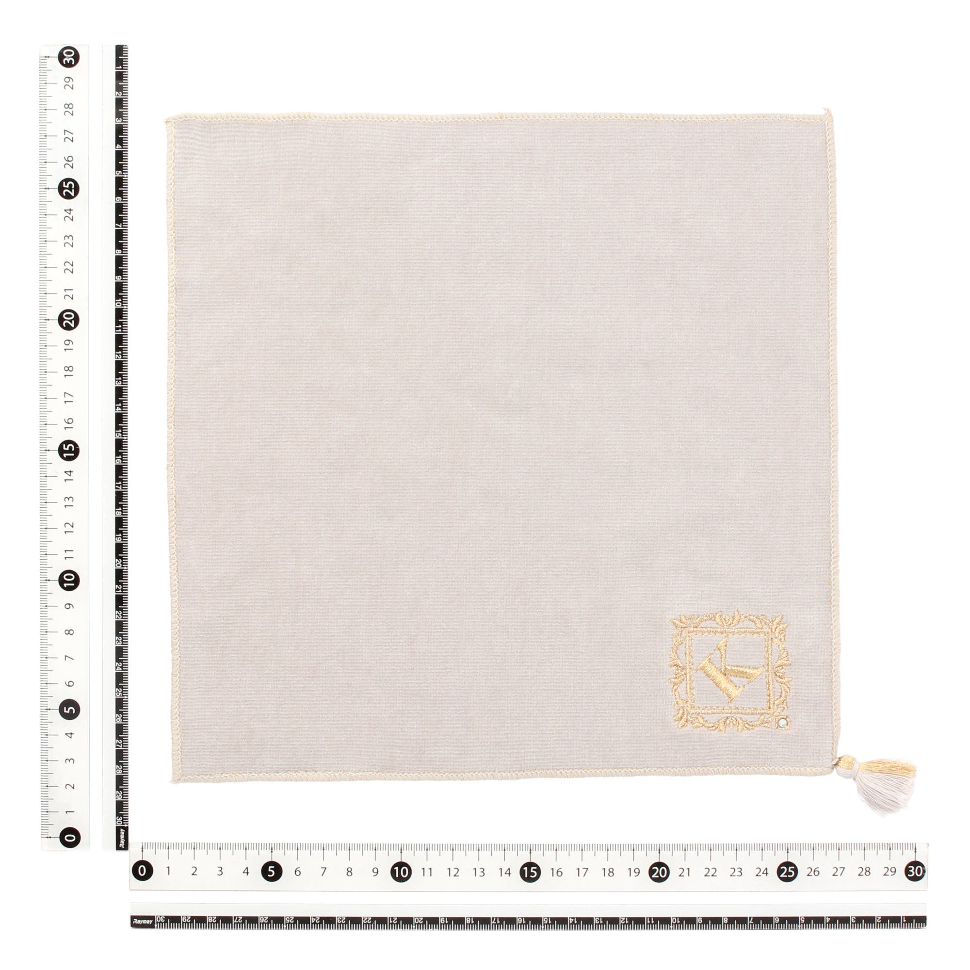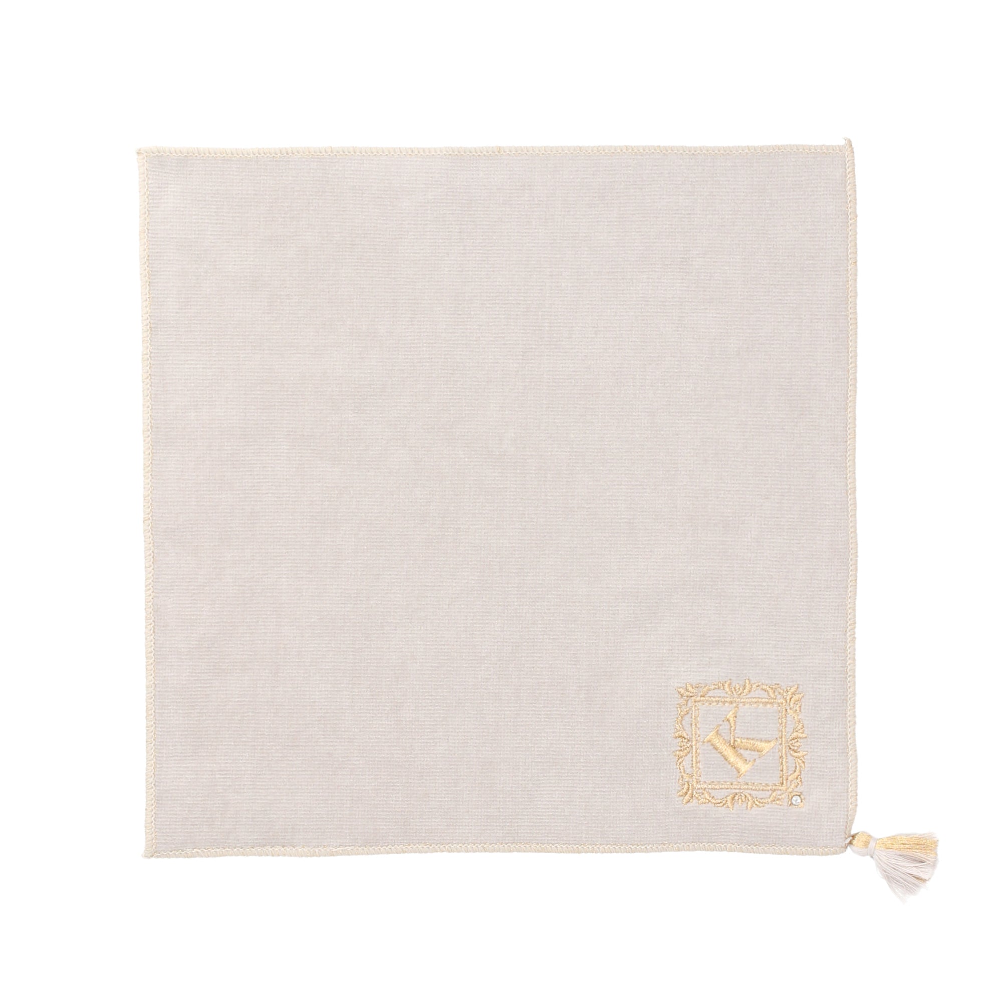 タッセルが華やかなハンカチタオルです。ゴールドの糸でイニシャルを刺繍し、上品な印象なので贈り物におすすめです。柔らかな肌触りのよいハンカチタオルです。