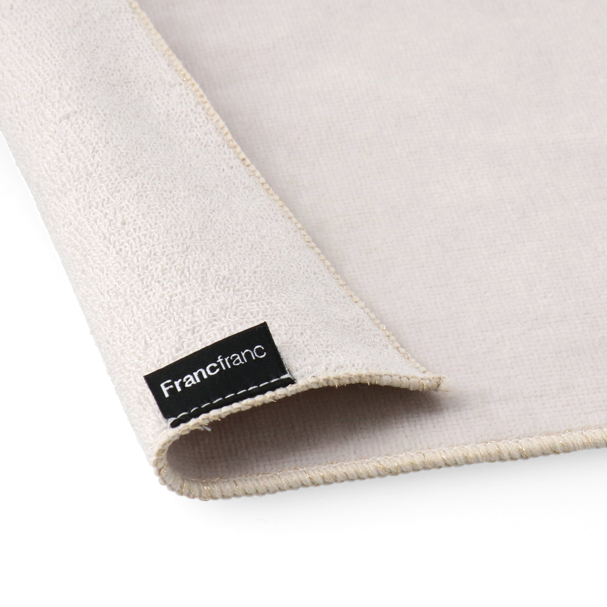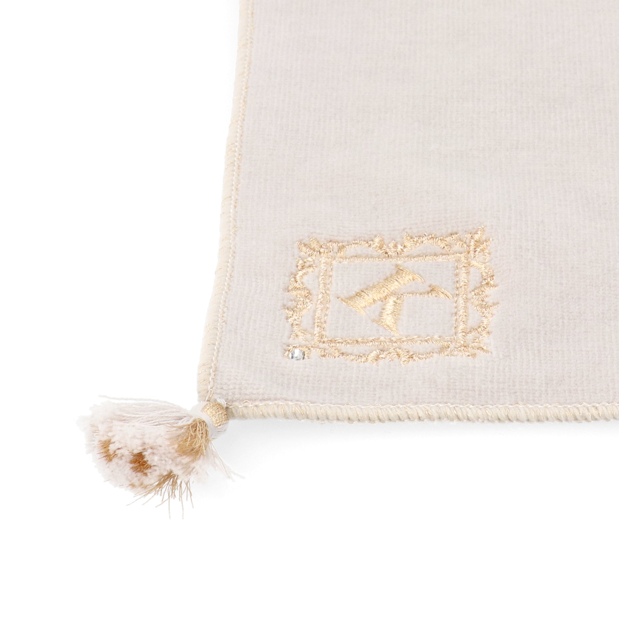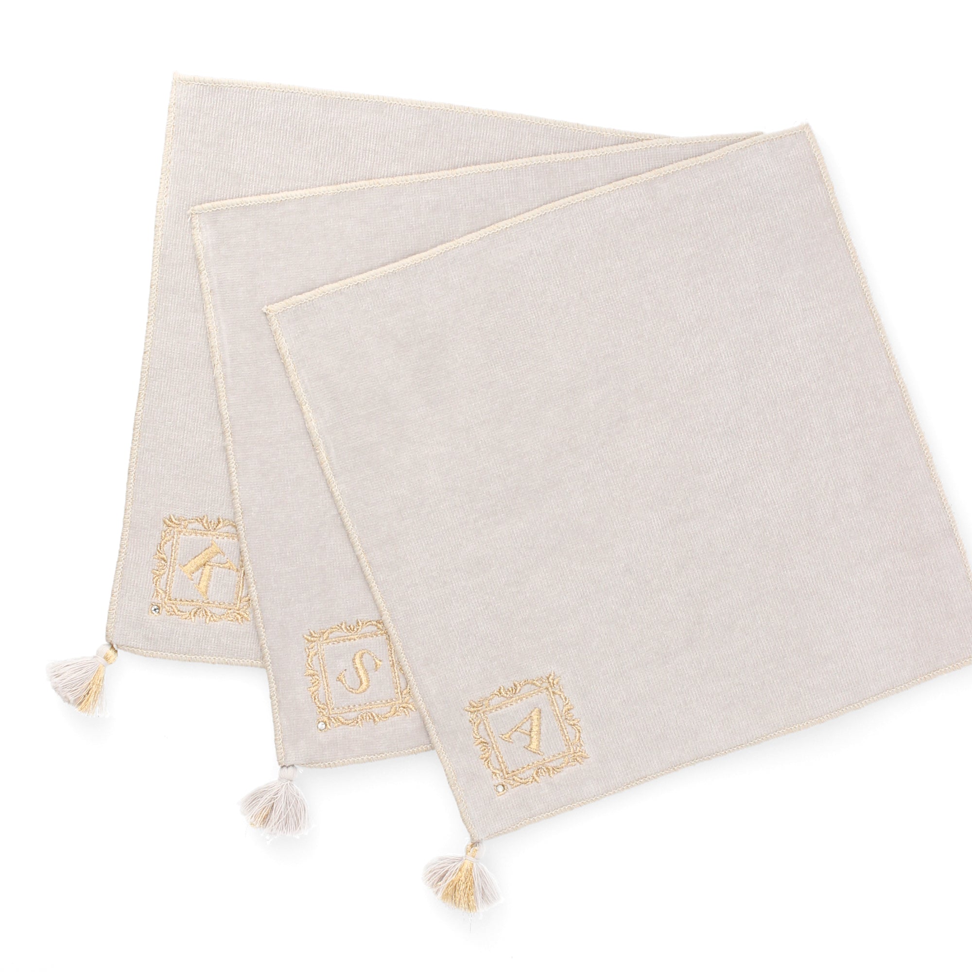 タッセルが華やかなハンカチタオルです。ゴールドの糸でイニシャルを刺繍し、上品な印象なので贈り物におすすめです。柔らかな肌触りのよいハンカチタオルです。