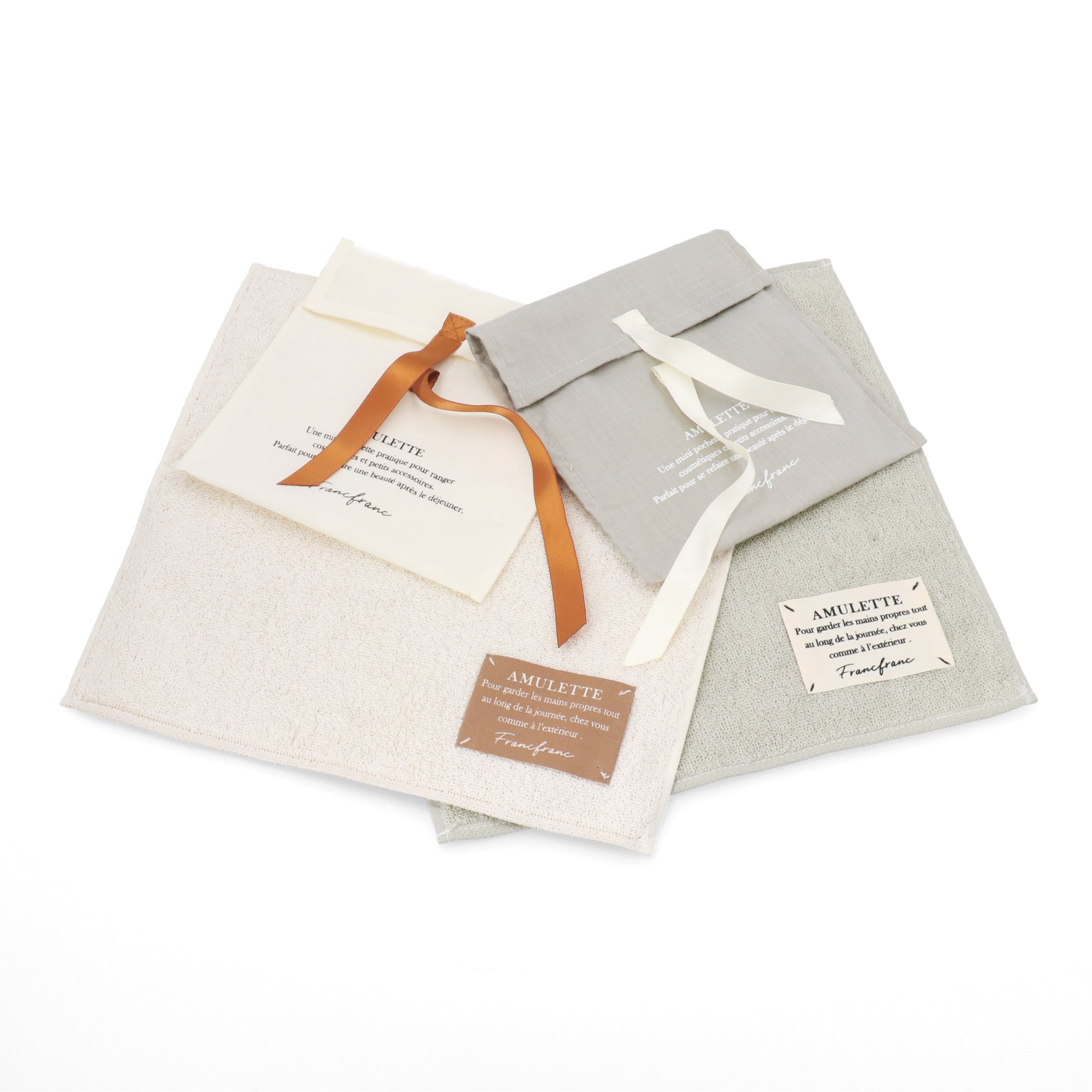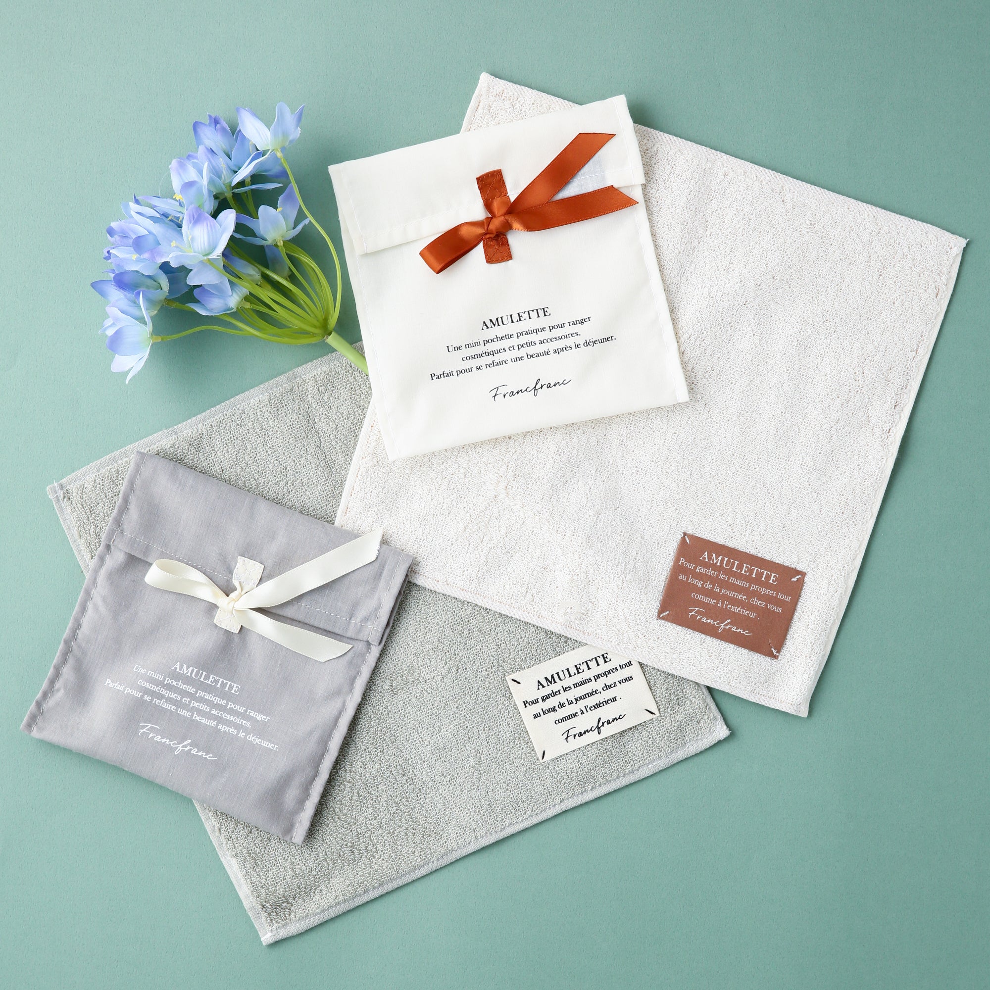 ボリュームのあるパイル地で肌触りのよい、ナチュラルカラーのハンカチタオルです。薄手のコットン製ポーチ付きで、ハンカチを取り出したら、ミニポーチとしてもご使用いただけます。ハンドクリームと合わせてギフトとしてもおすすめです。