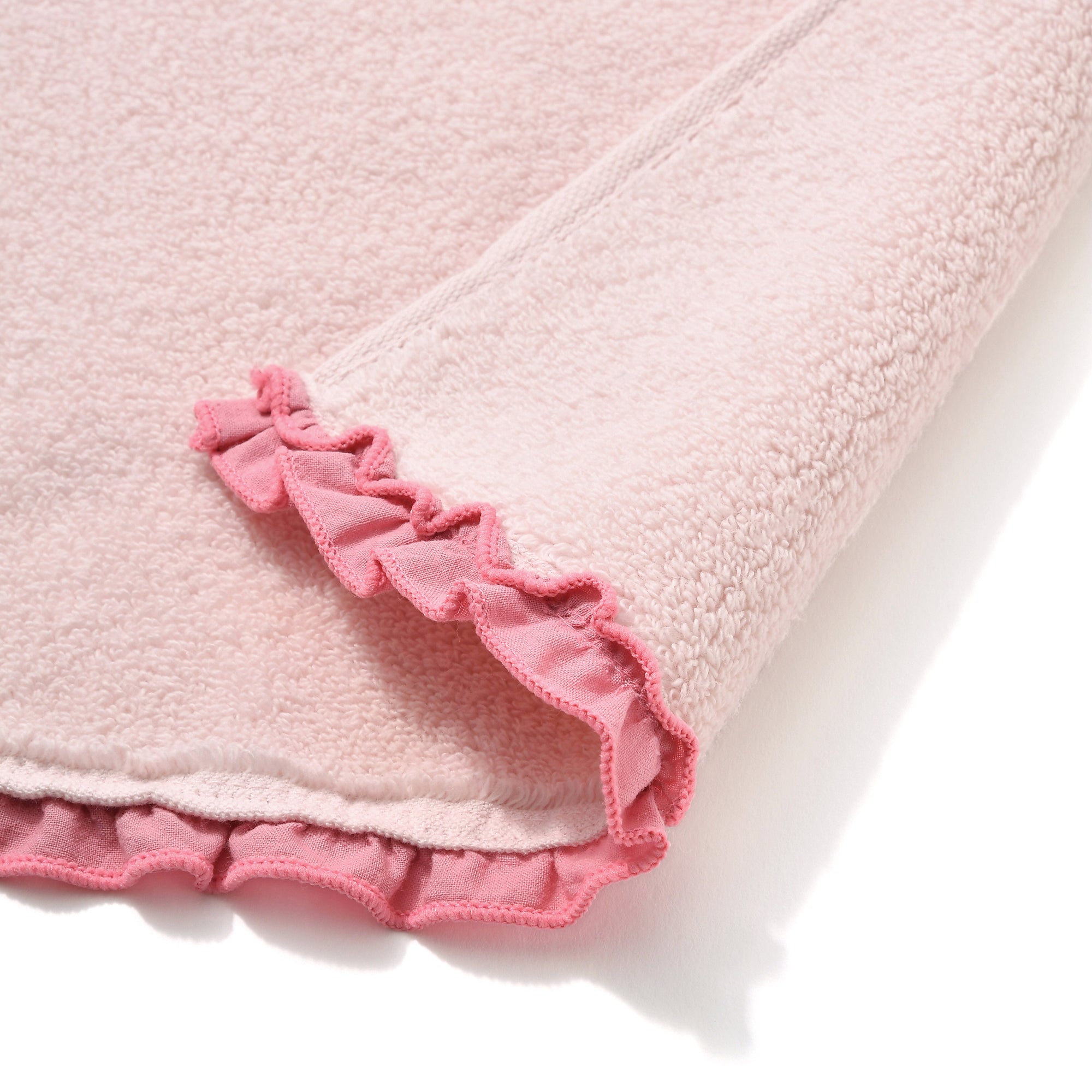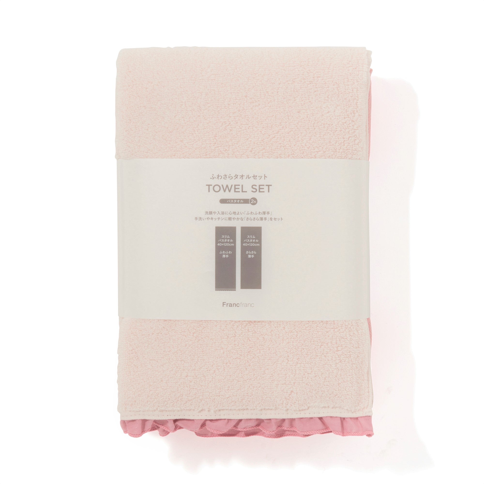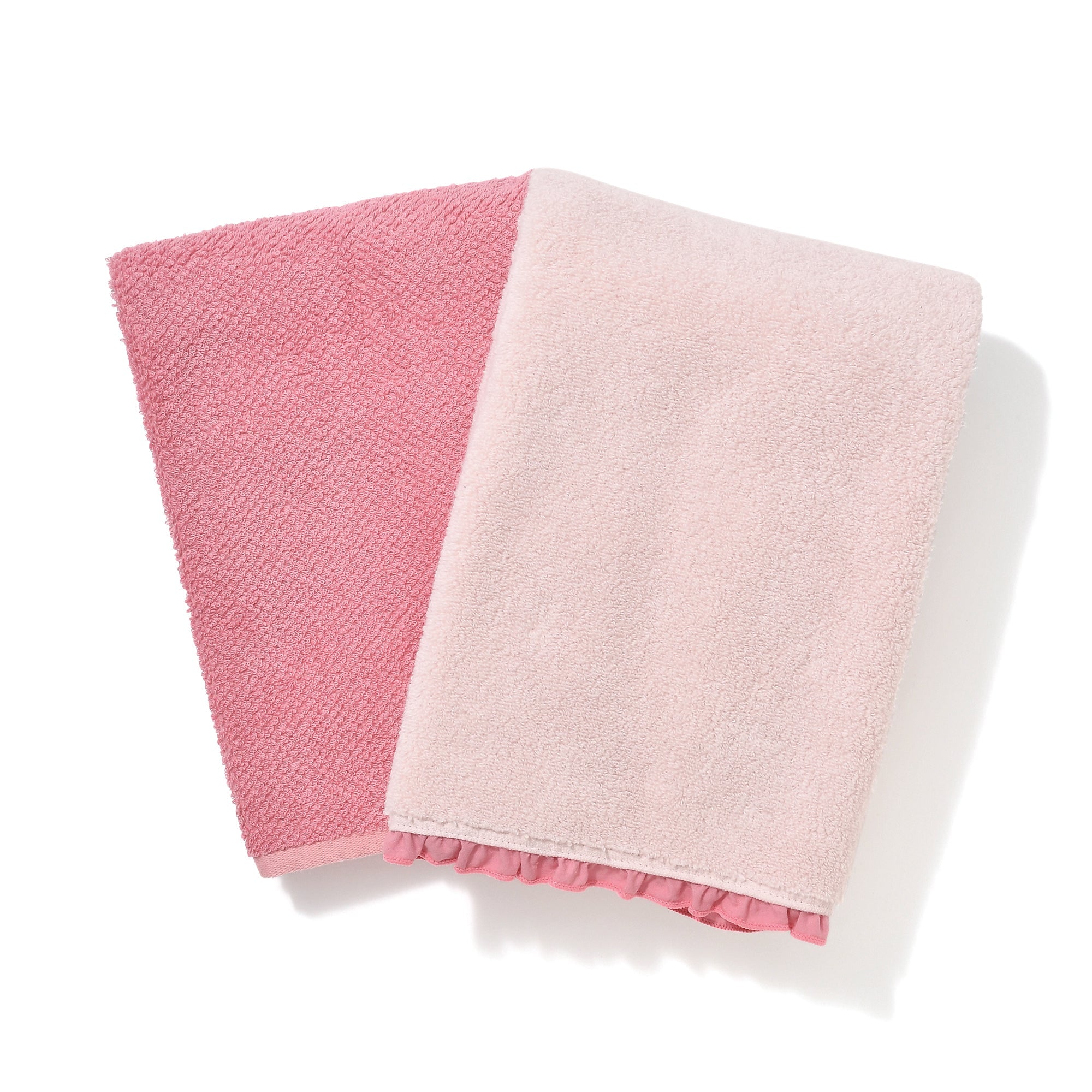 風合いの違う薄手と厚手のバスタオル2枚セットです。フリルデザインとシンプルデザインのセットで、気分によって使い分けもできます。フリルは大きすぎないので、甘すぎずさりげない可愛さをプラスしてくれます。華やかなピンクでお部屋がパッと明るくなります。もっちりした厚手タイプは髪や体、顔の水分を摩擦レスで優しく吸い取ってくれます。さっぱりの薄手タイプはマルチユースで活躍します。ハンガーに吊るして干せるスリムサイズで、スペースもとらず便利です。髪も体も十分に拭き取れるサイズながら、頭に巻きやすく使い勝手抜群の黄金比サイズです。フックに掛けられるループ付き。ふわふわもさらさらも両方使えて便利なセットになっています。カラーも派手すぎず落ち着いた色味なので、どんなお部屋にも馴染んでくれます。ギフトにもおすすめのセットです。