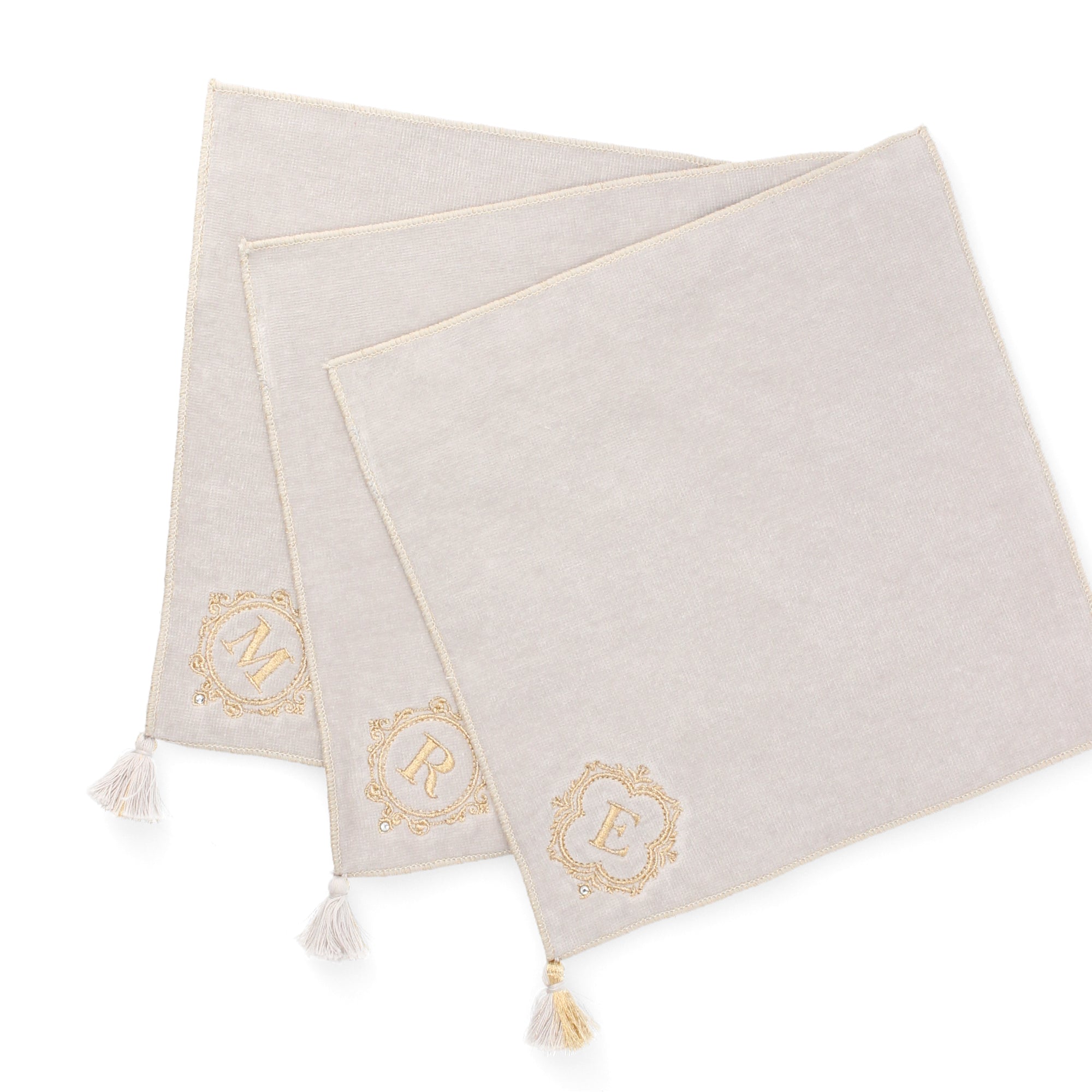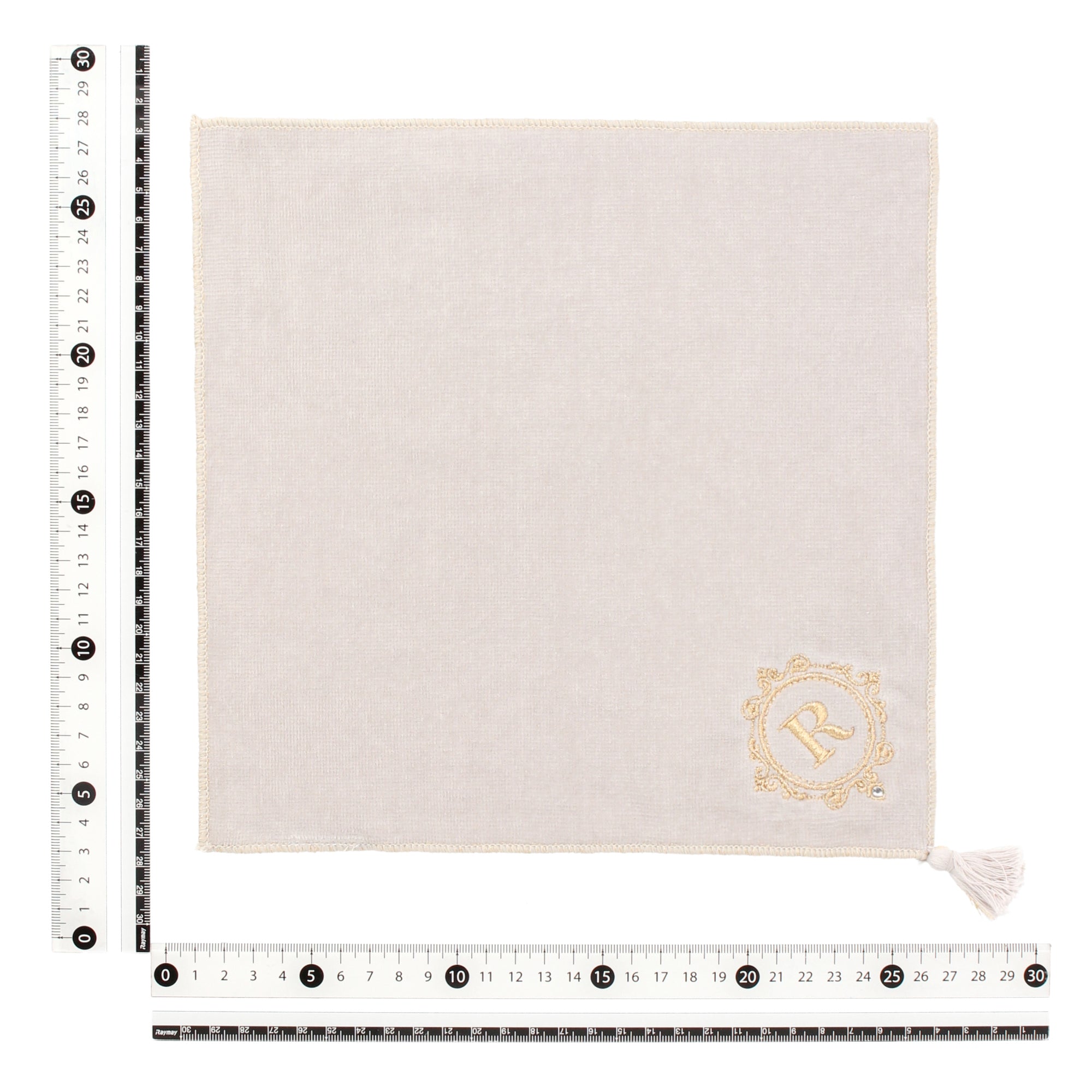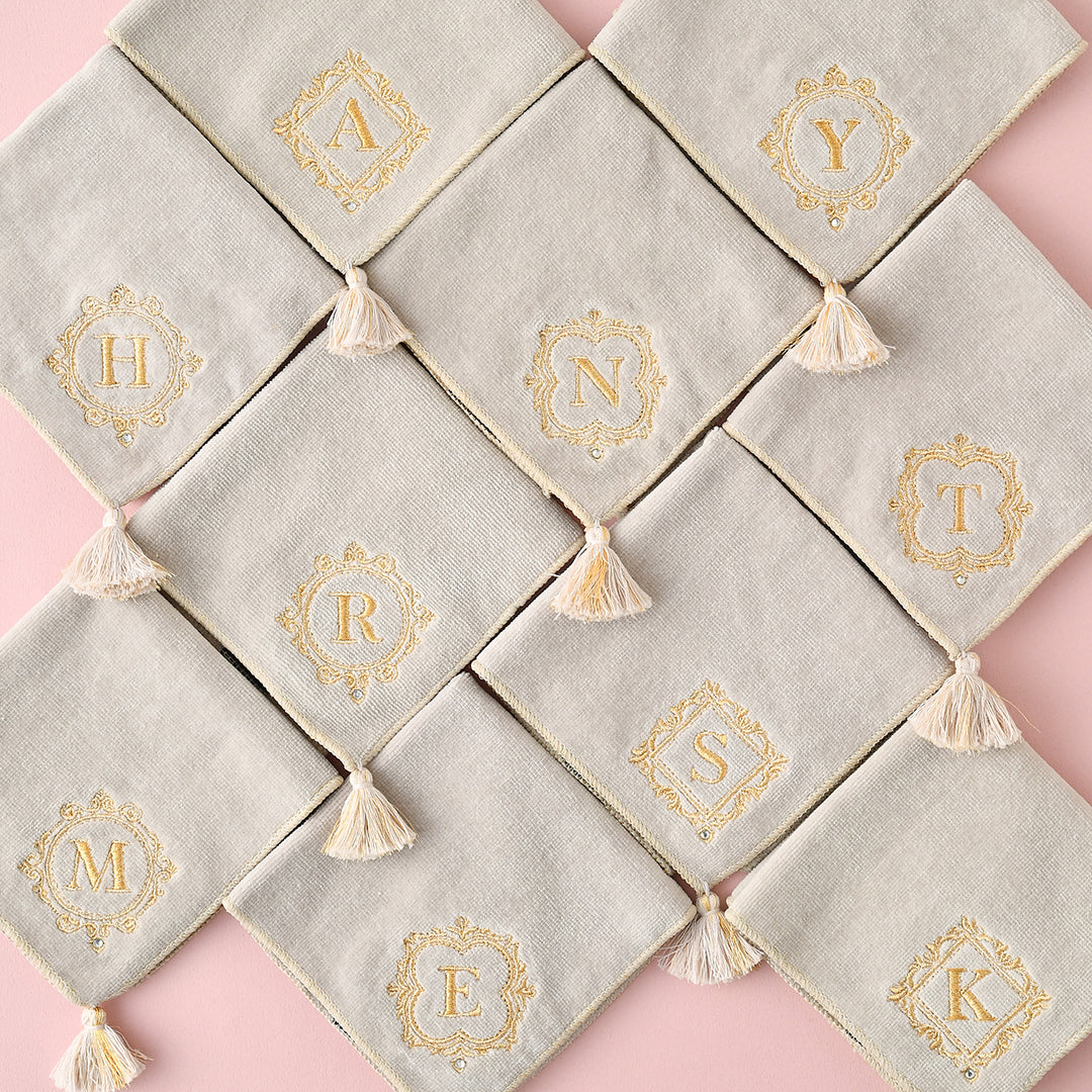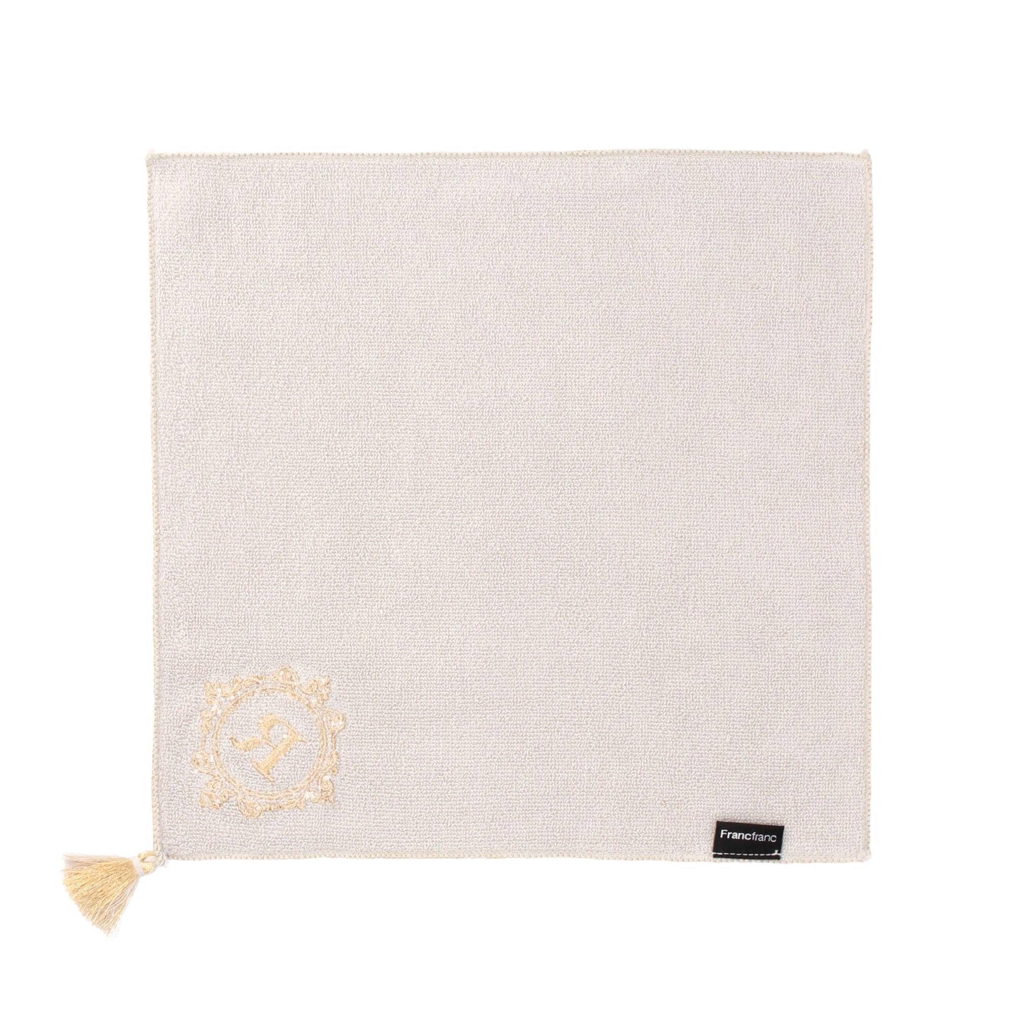 タッセルが華やかなハンカチタオルです。使い勝手の良いベーシックな25cm角のハンカチタオルに、ゴールドの刺繍を施しました。シンプルでありながらイニシャルとタッセルがアクセントになり、上品なハンカチタオルに仕上がっています。落ち着いた色合いのため、普段使いはもちろん、ドレスコードが必要な場面で持ち歩くハンカチとしてもお使いいただけます。吸水性と耐久性に優れたコットン素材のハンカチタオルです。適度なボリューム感と柔らかな肌触りが魅力。手洗い後の濡れた手や汗をしっかりと拭き取ってくれるため、外出先で重宝します。バッグに入れても嵩張らないサイズ感なのも嬉しいポイント。9種類のイニシャルから選ぶことができるため、ご自分で使うのはもちろん友達や家族とお揃いにするのもおおすすめ。上品なタオルハンカチなので、ちょっとした贈り物としても大変喜ばれます。