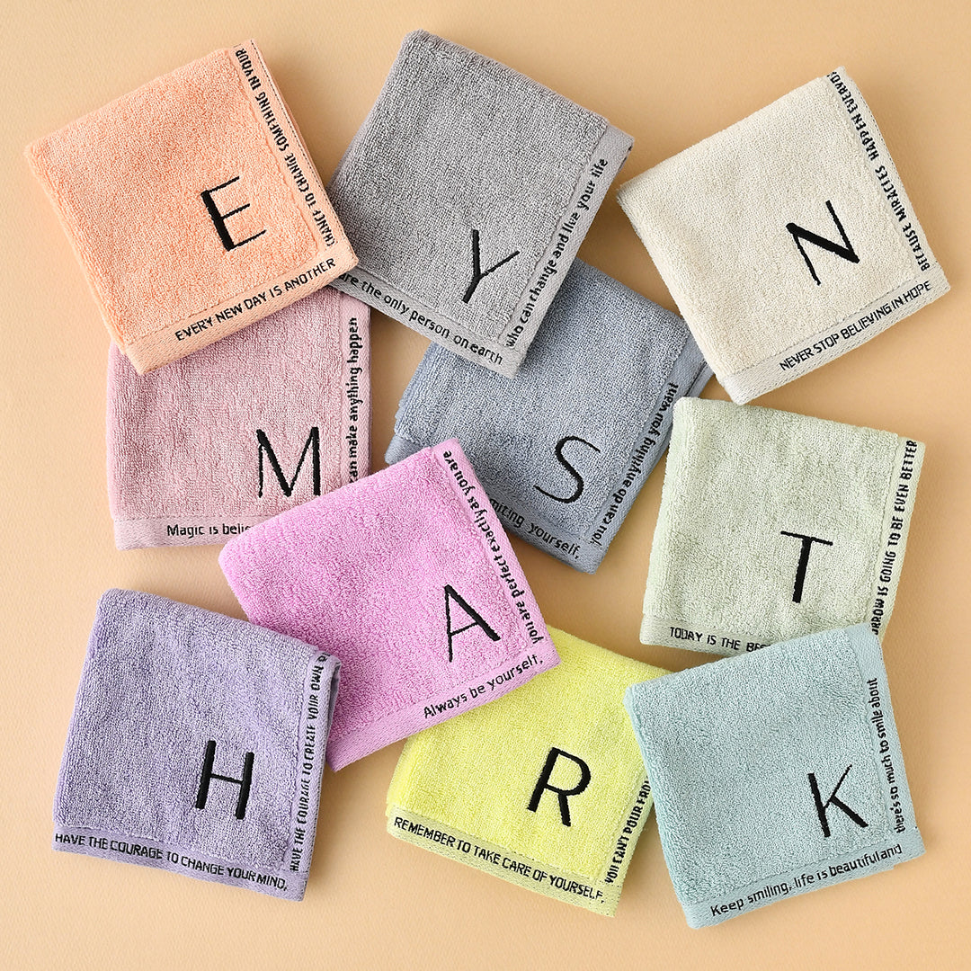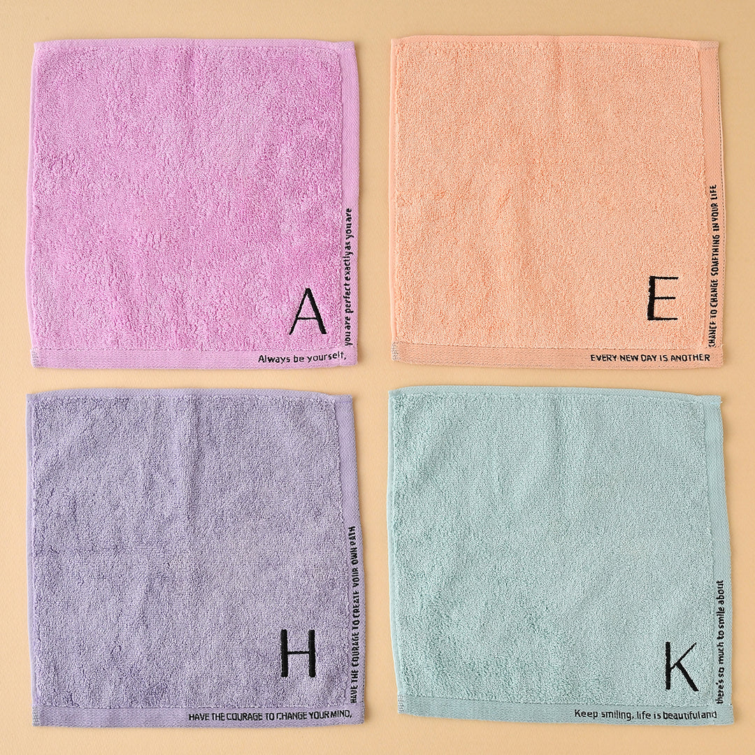 10種類のイニシャルが選べるハンカチタオルです。ベーシックな25cm角のハンカチに、シンプルなアルファベットとそれぞれのアルファベットから始まるポジティブなメッセージをあしらいました。メッセージが目に入るたびに優しく力強く励ましてくれる、お守りのようなアイテムです。普段使いしやすく耐久性に優れた20番双糸を採用、適度なボリューム感とパイル地のふんわりとした肌触りが楽しめます。ご自分で使うのはもちろんお友達や家族とお揃いにするのもおおすすめ。プチギフトにも大変喜ばれます。