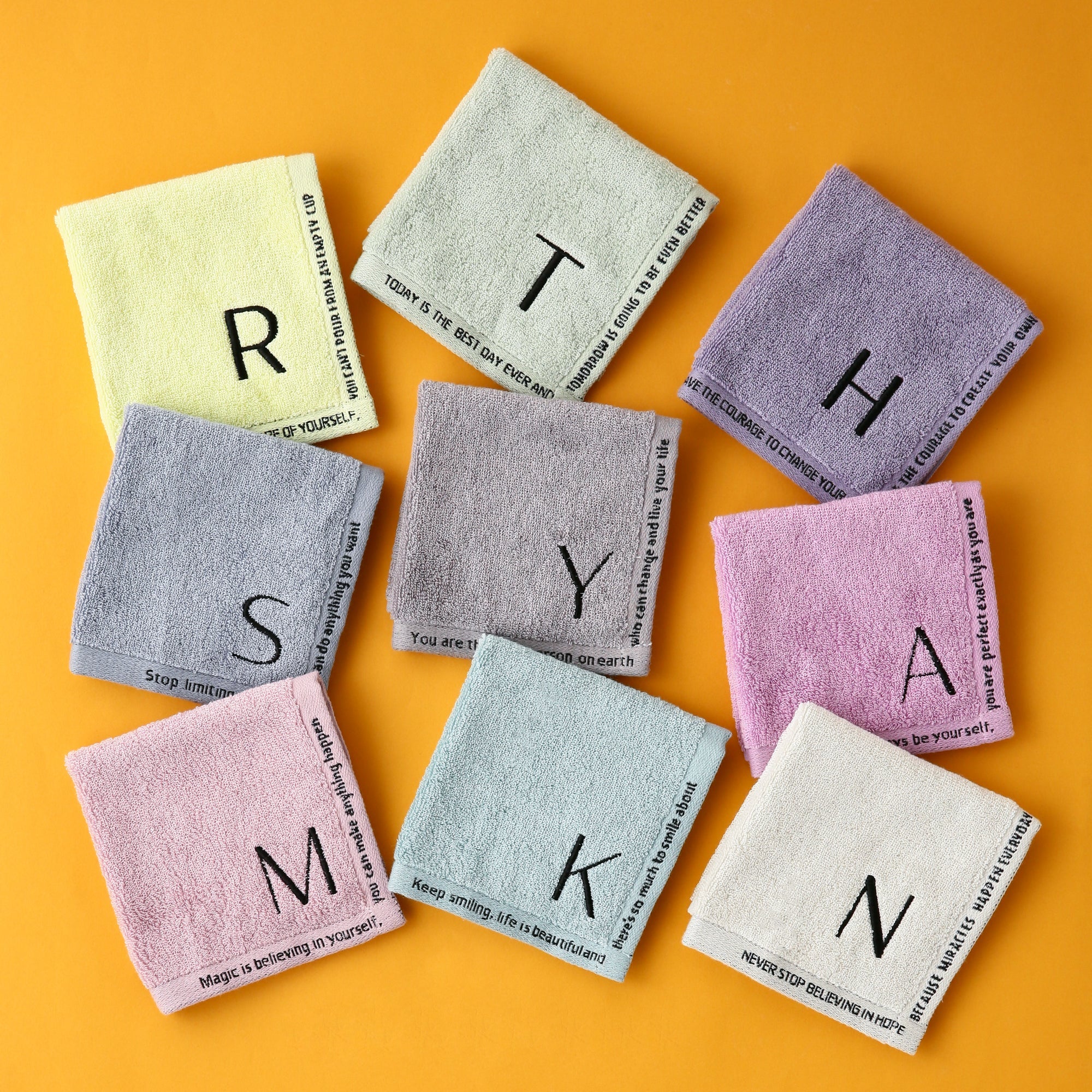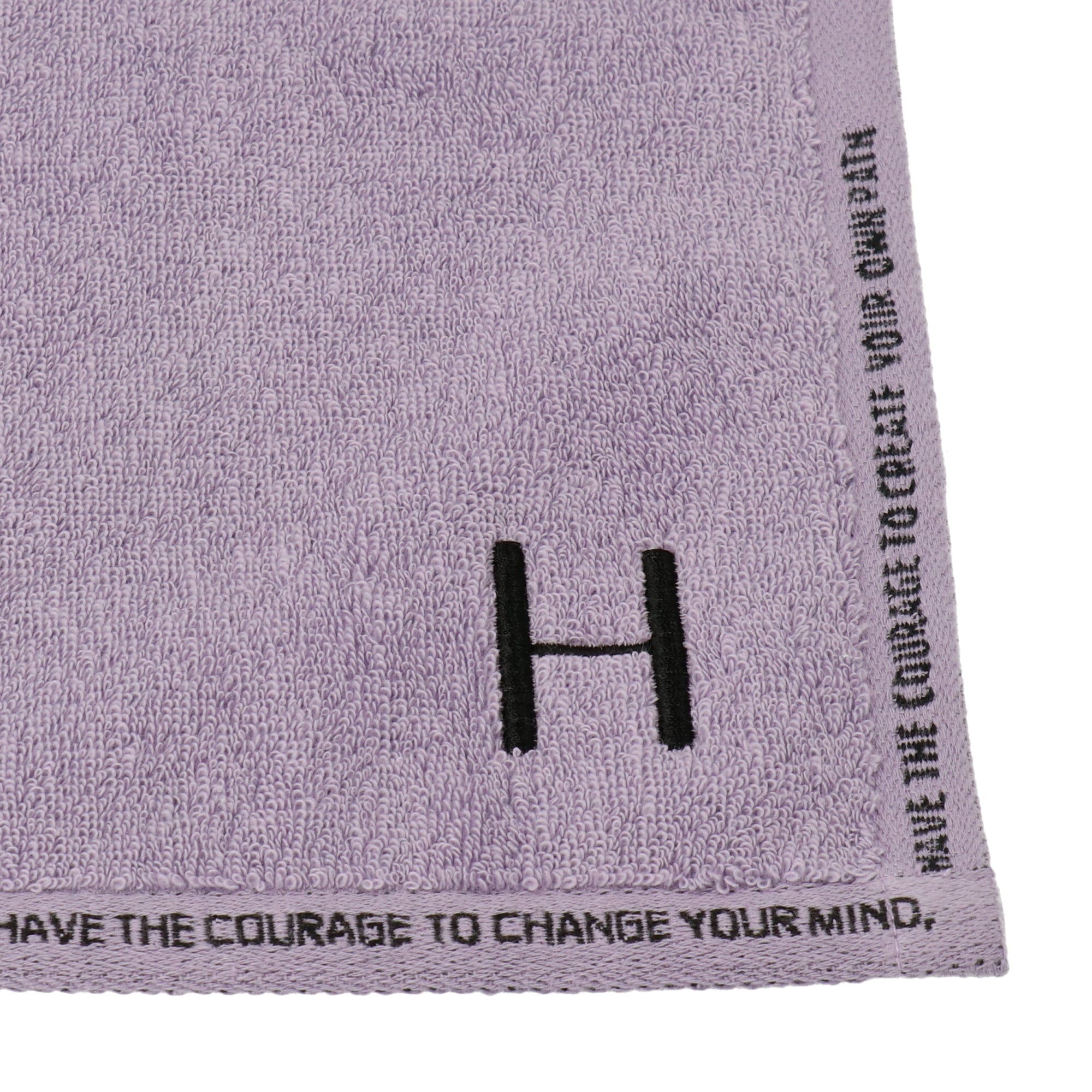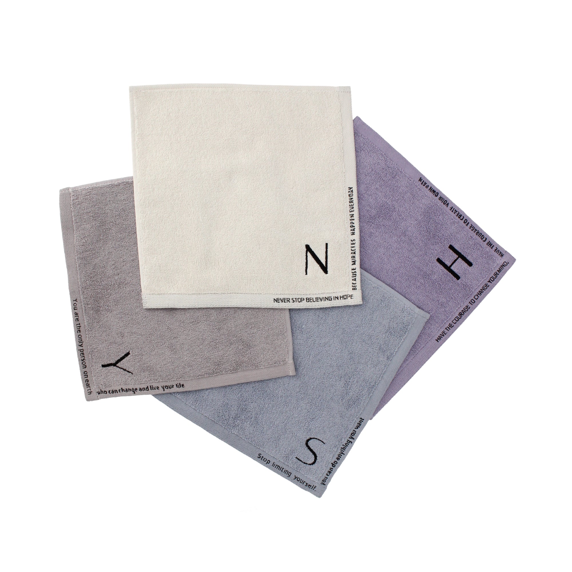 10種類のイニシャルが選べるハンカチタオルです。ベーシックな25cm角のハンカチに、シンプルなアルファベットとそれぞれのアルファベットから始まるポジティブなメッセージをあしらいました。メッセージが目に入るたびに優しく力強く励ましてくれる、お守りのようなアイテムです。普段使いしやすく耐久性に優れた20番双糸を採用、適度なボリューム感とパイル地のふんわりとした肌触りが楽しめます。ご自分で使うのはもちろんお友達や家族とお揃いにするのもおおすすめ。プチギフトにも大変喜ばれます。
