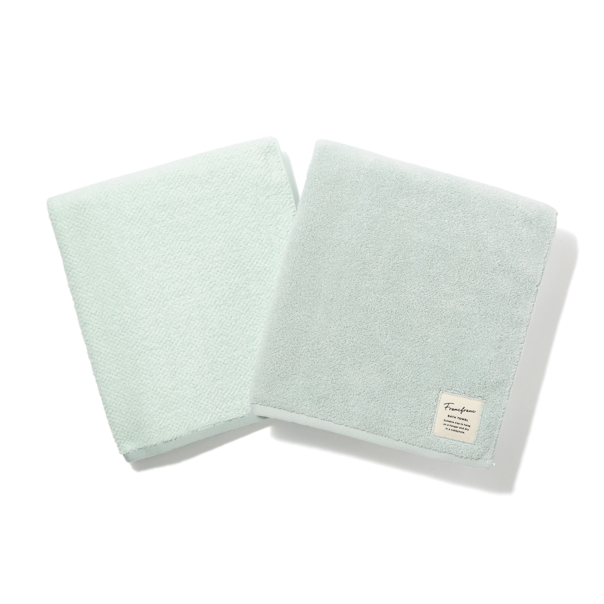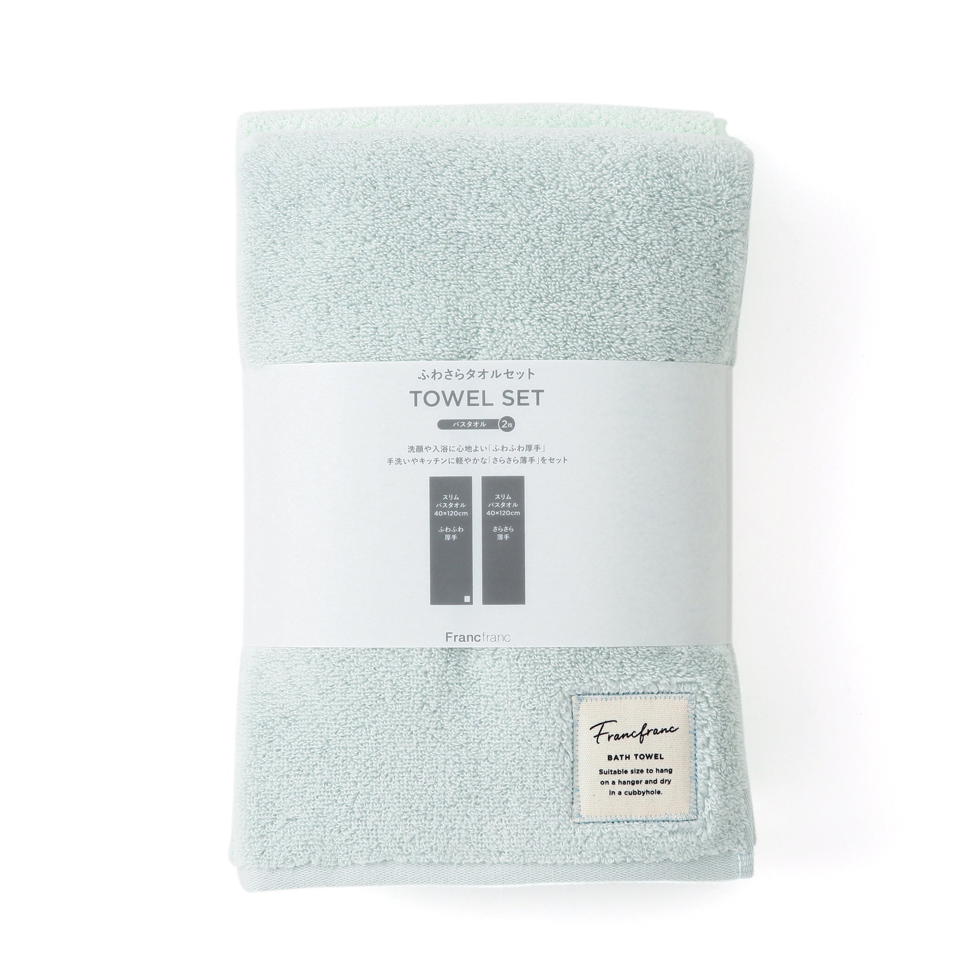 厚手タイプと薄手タイプの風合いが異なるバスタオル2枚をセットにしました。思わず頬ずりしたくなるようなふっくらふわふわの肌ざわりで、毎日のバスタイムをとっておきのご褒美時間に格上げしてくれます。爽やかなグリーンが気分を明るくしてくれます。ポイントは、ハンガーに吊るして干すこともできるスリムなサイズ。お洗濯が楽でかさばらずに収納できるけれど髪とからだをきっちり拭き取れる絶妙な大きさです。通常のバスタオルでは大きすぎフェイスタオルでは小さすぎる、という方にもおすすめです。フックに掛けられるループ付き。もっちりした厚手タイプは髪や体、顔の水分を摩擦レスで優しく吸い取ってくれます。さっぱりの薄手タイプはマルチユースで活躍します。シンプルなデザインながらも、ロゴのタグがおしゃれさをプラスしてくれます。ふわふわもさらさらも両方使えて便利なセットになっています。カラーも派手すぎず落ち着いた色味なので、どんなお部屋にも馴染んでくれます。ギフトにもおすすめのセットです。