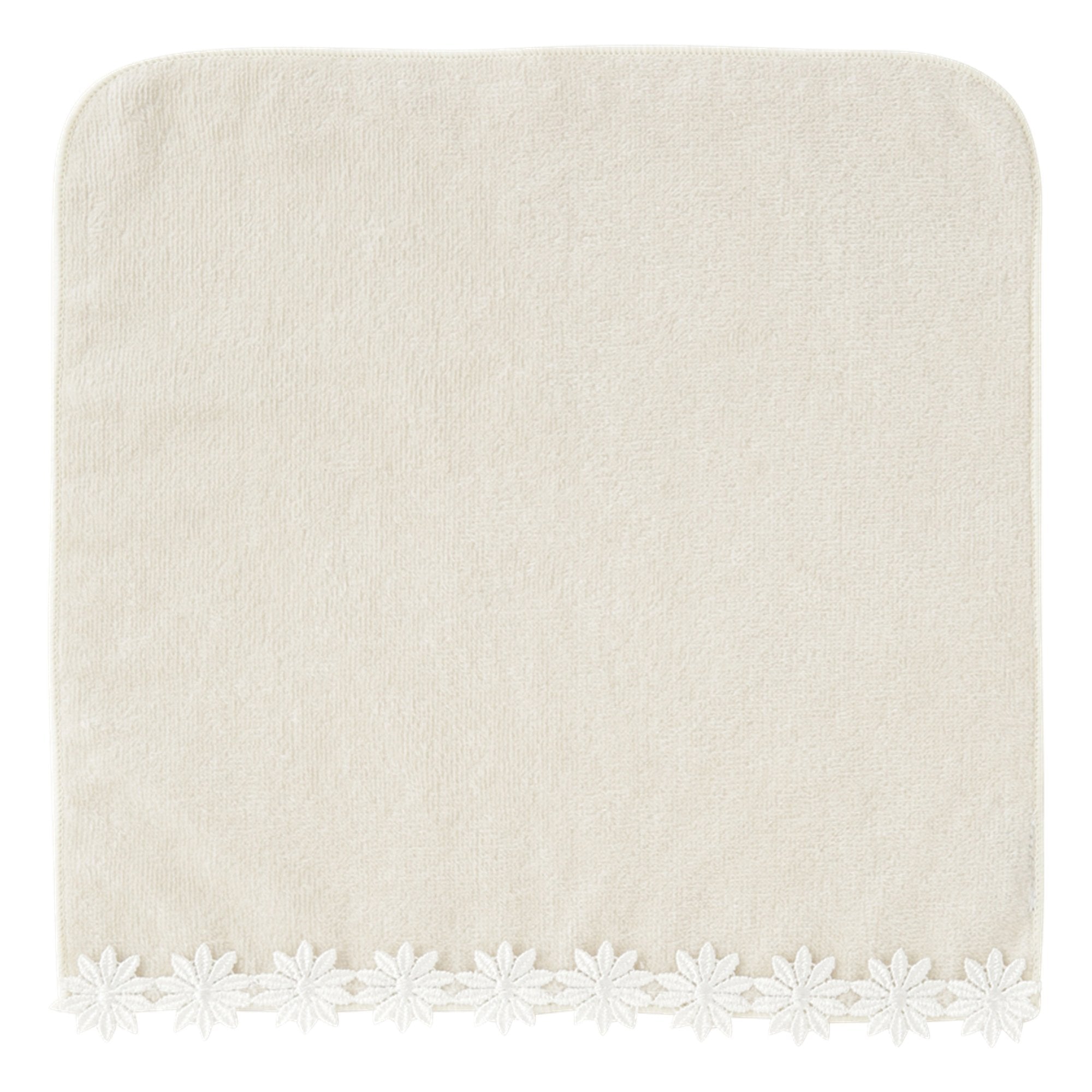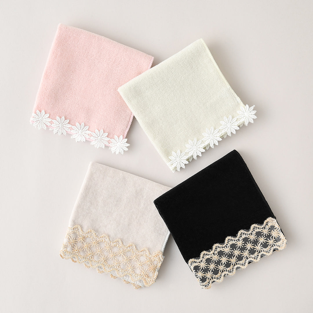 小花レースをあしらったフェミニンデザインのハンカチタオルです。抗菌防臭機能を追加してリニューアルしました。デザインのバリエーション豊富で、複数枚のまとめ買いやプレゼントにもおすすめです。