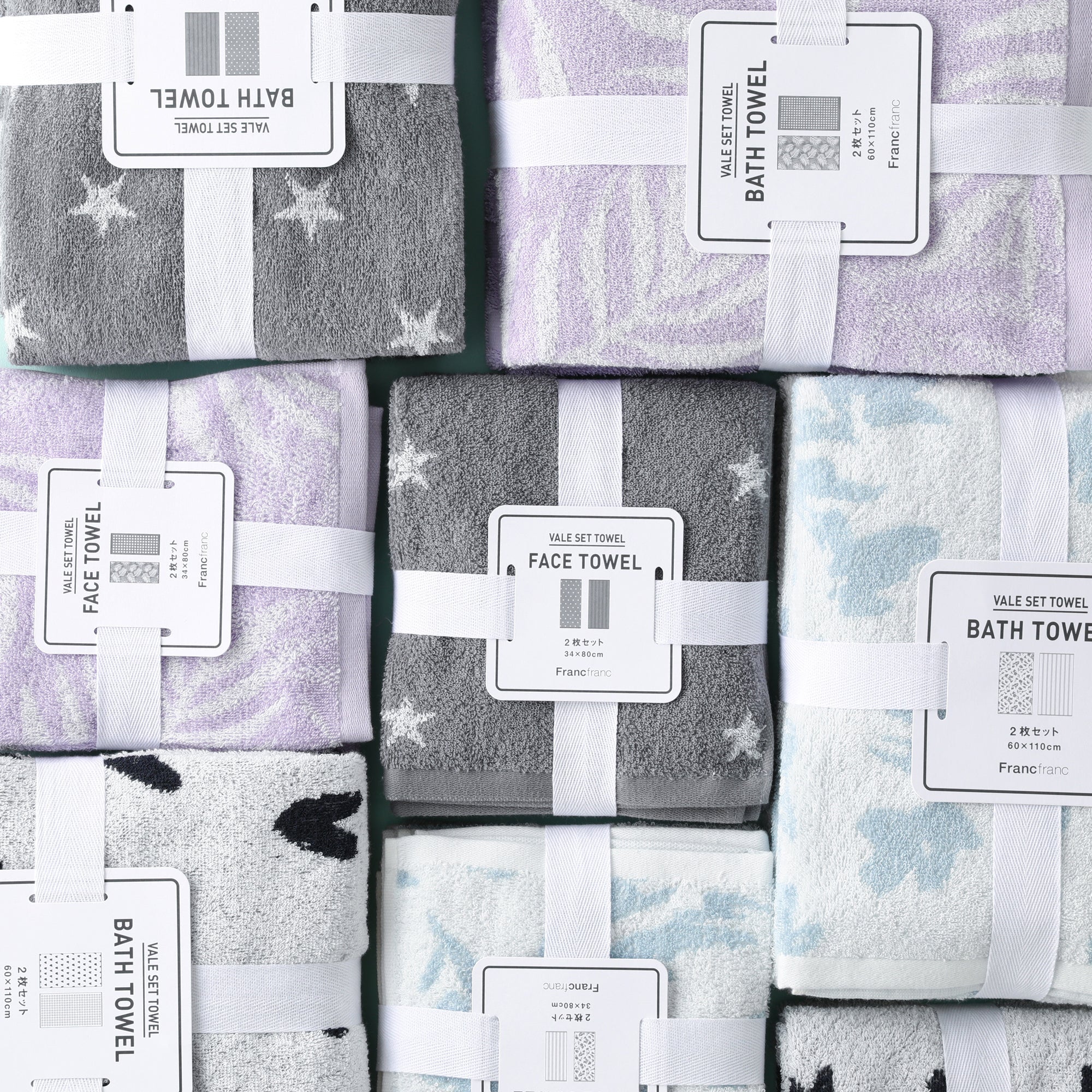 使い勝手のいい34×80cmサイズのお買い得なフェイスタオル2枚セットです。1セットで2つの柄が楽しめます。シリーズの中からお好みの柄を選んで、ちょっとした贈り物にもぴったり。薄手で柔らかい肌触りのため、毎日心地よくお使いいただけます。