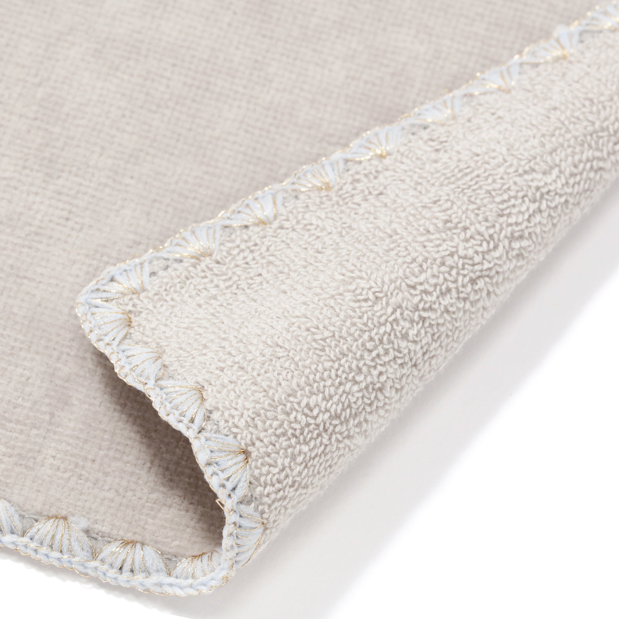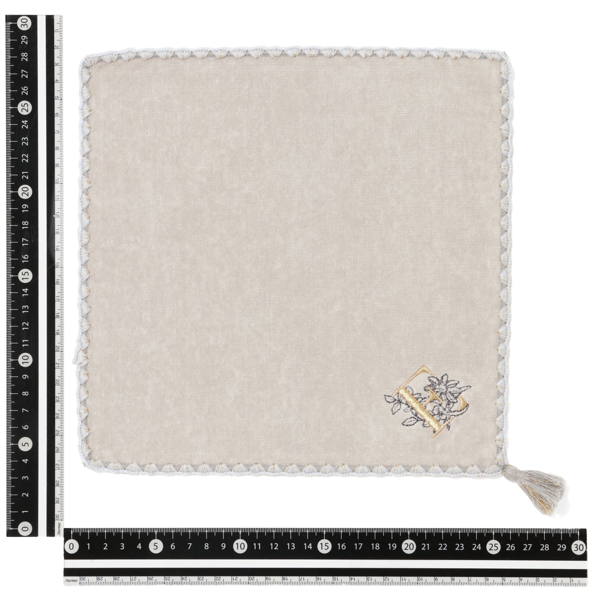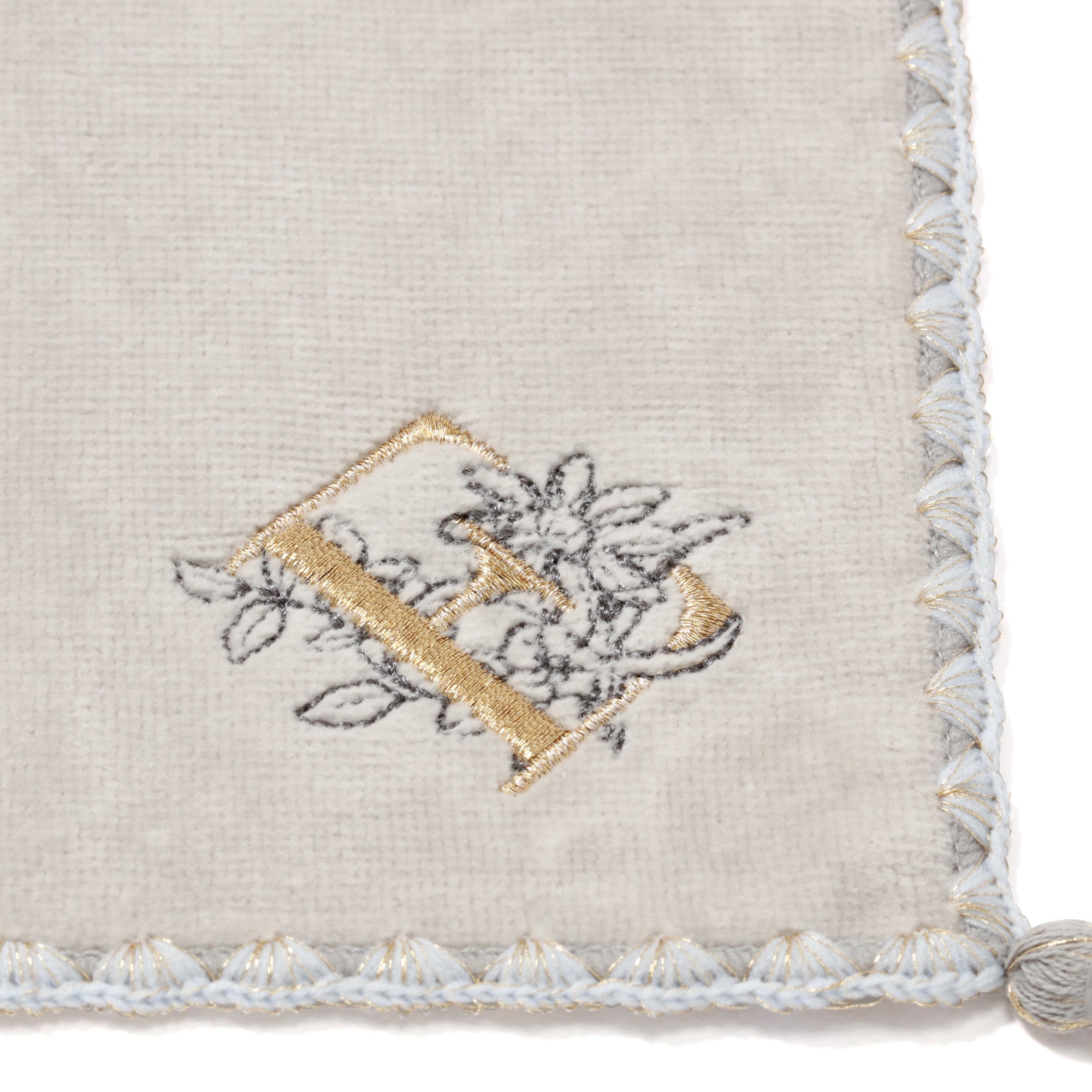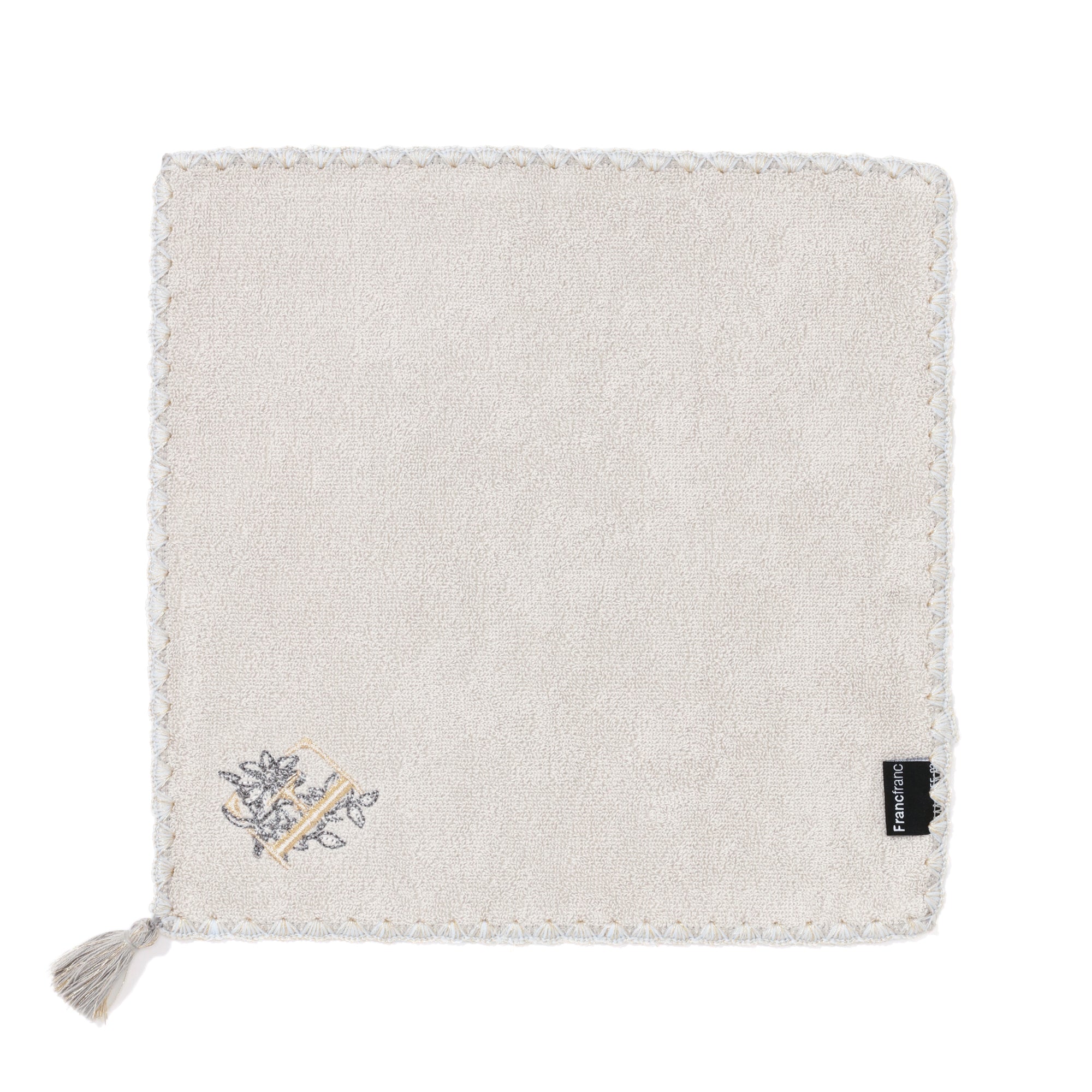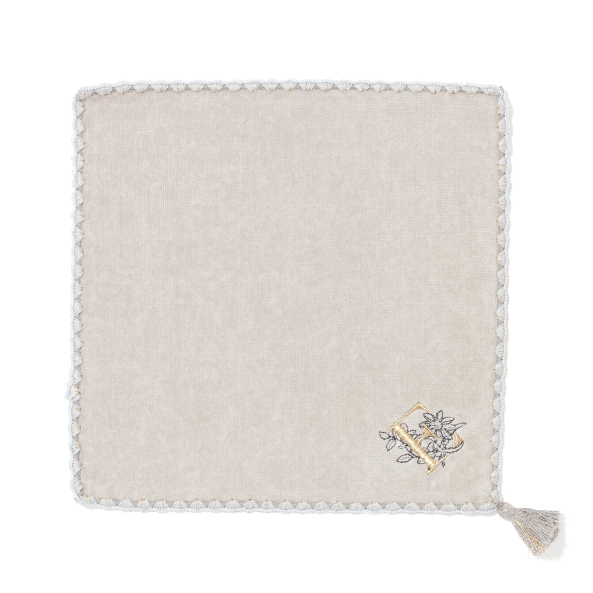 イニシャルに関連する花の刺繍をあしらった上品なハンカチタオルです。シェルメローを施した上品なデザインはギフトにも最適です。